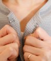 ノーカラーの襟ぐりから前立て周りにはブレードを施してより上質なデザインに。