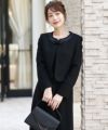 女性らしいデザインの短め丈なノーカラージャケットと、一枚でも上品に着られるワンピースのアンサンブル。