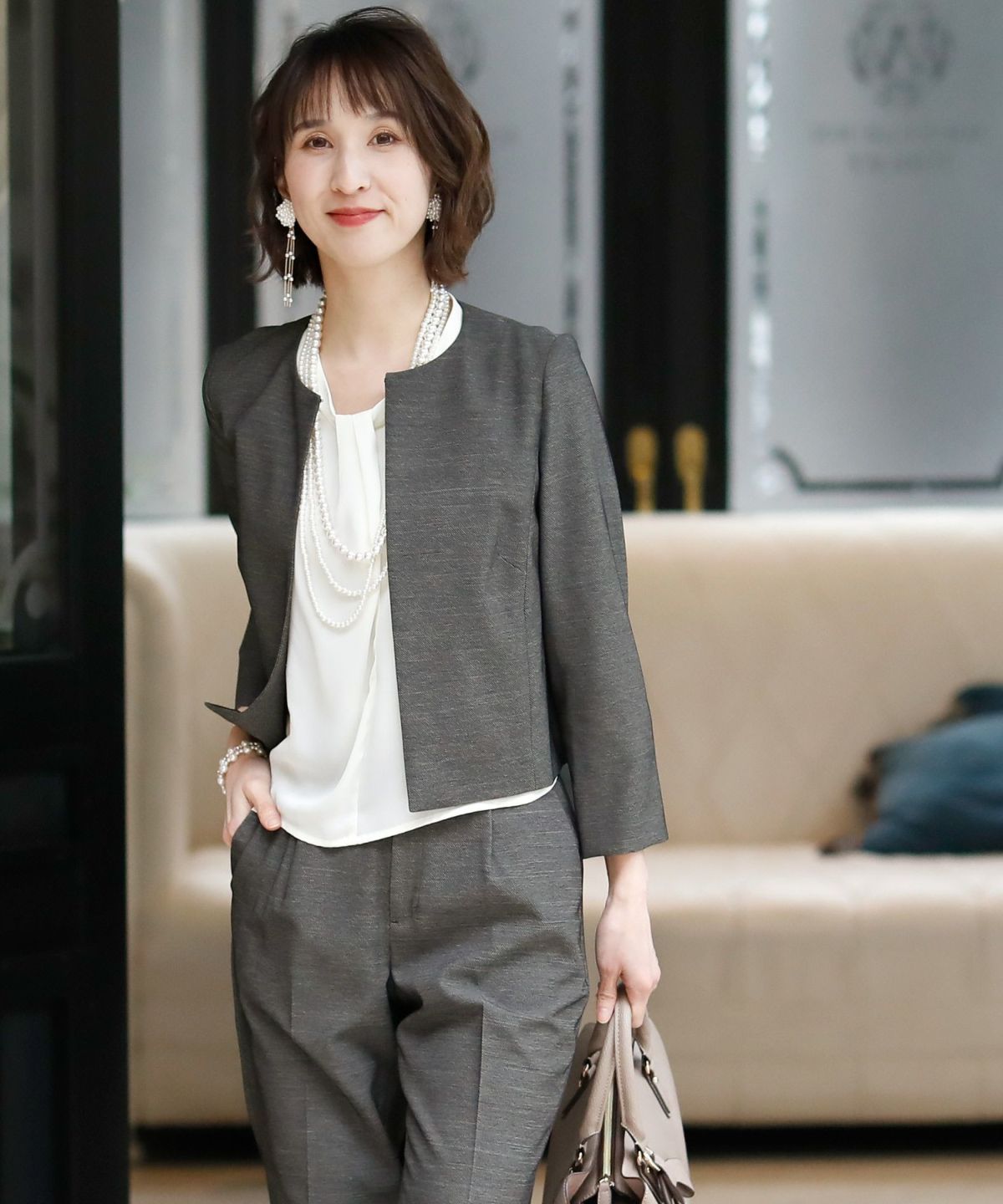 デコルテがすっきりして見えるノーカラーで、脚長効果が期待できる短めの丈に仕上げました。袖丈は七分袖で、スリットが入ってるので腕まくり出来、大人のこなれ感アップ♪