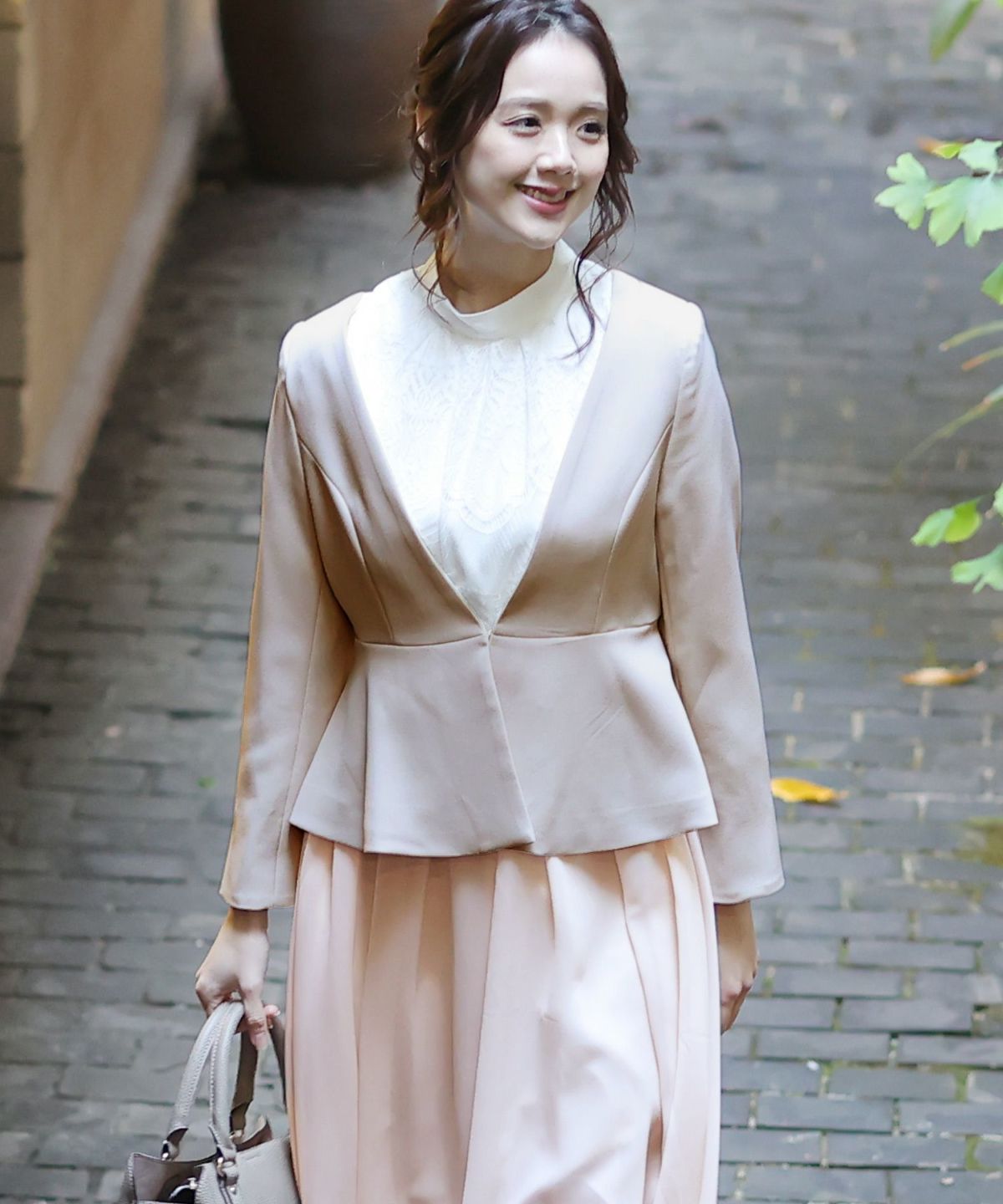 ジャケットはペプラムになっているのでウエストが引き締まった印象に。