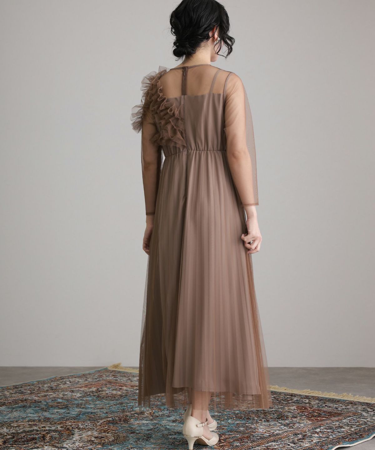 ギャザーチュールの透け感が可愛らしいドレス。