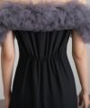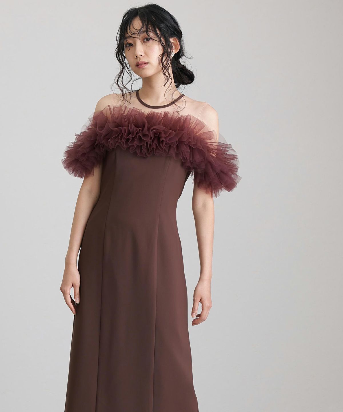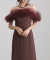 ギャザーチュールのオフショルダーが特徴的なエレガントなパーティードレス。
