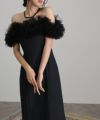 ギャザーチュールのオフショルダーが特徴的なエレガントなパーティードレス。