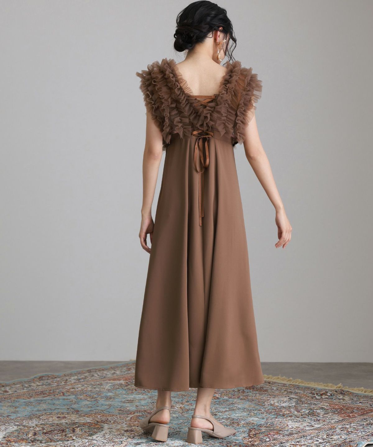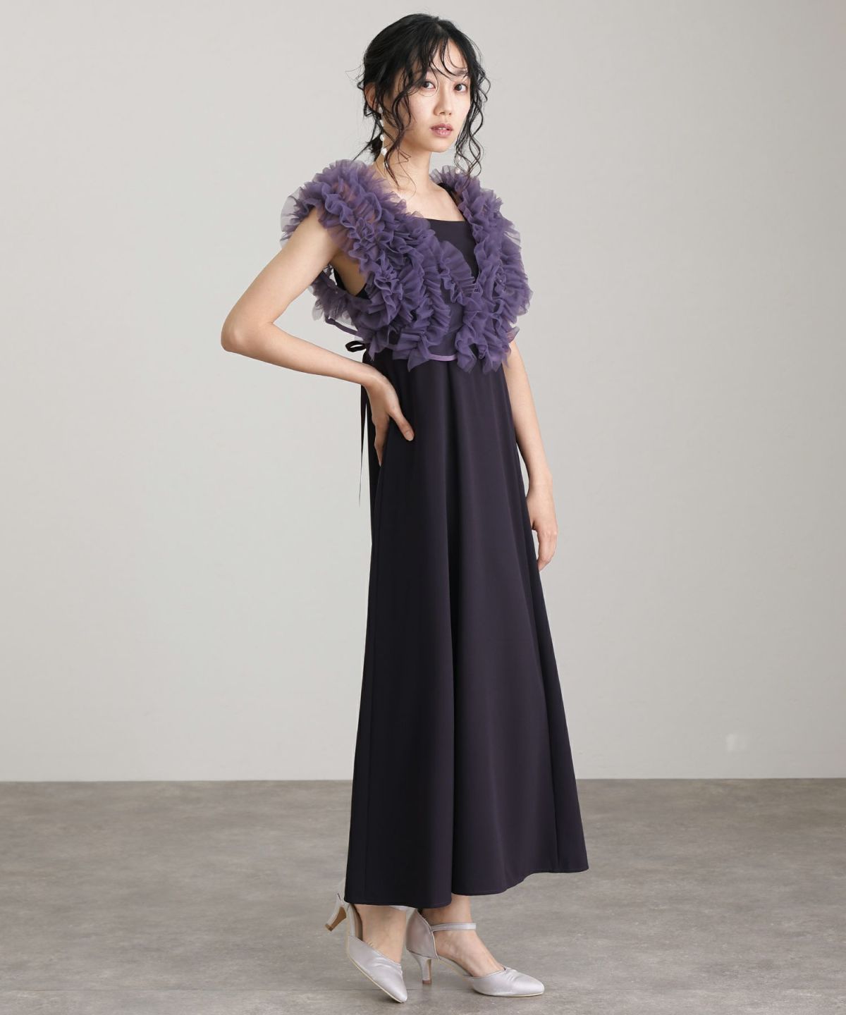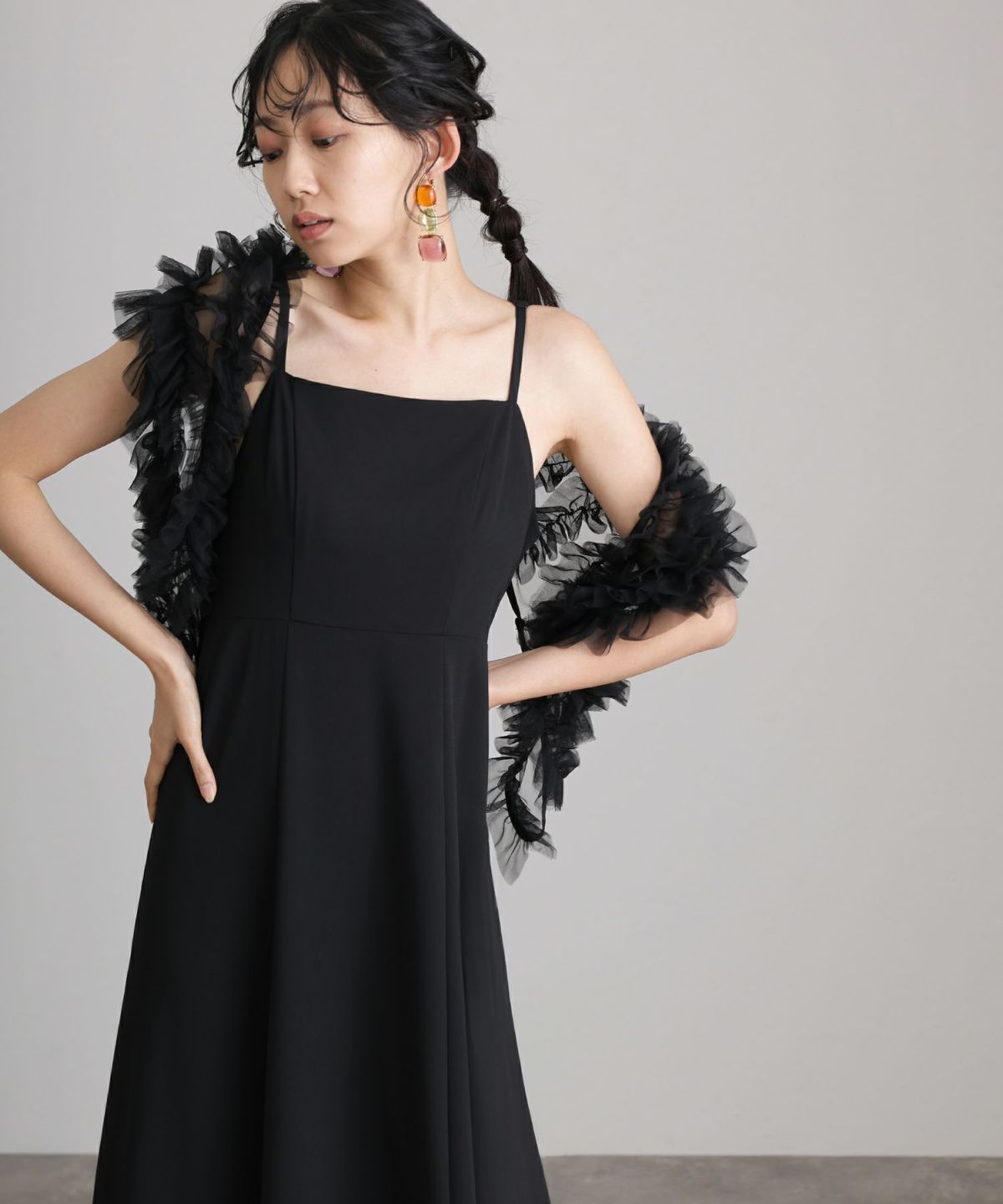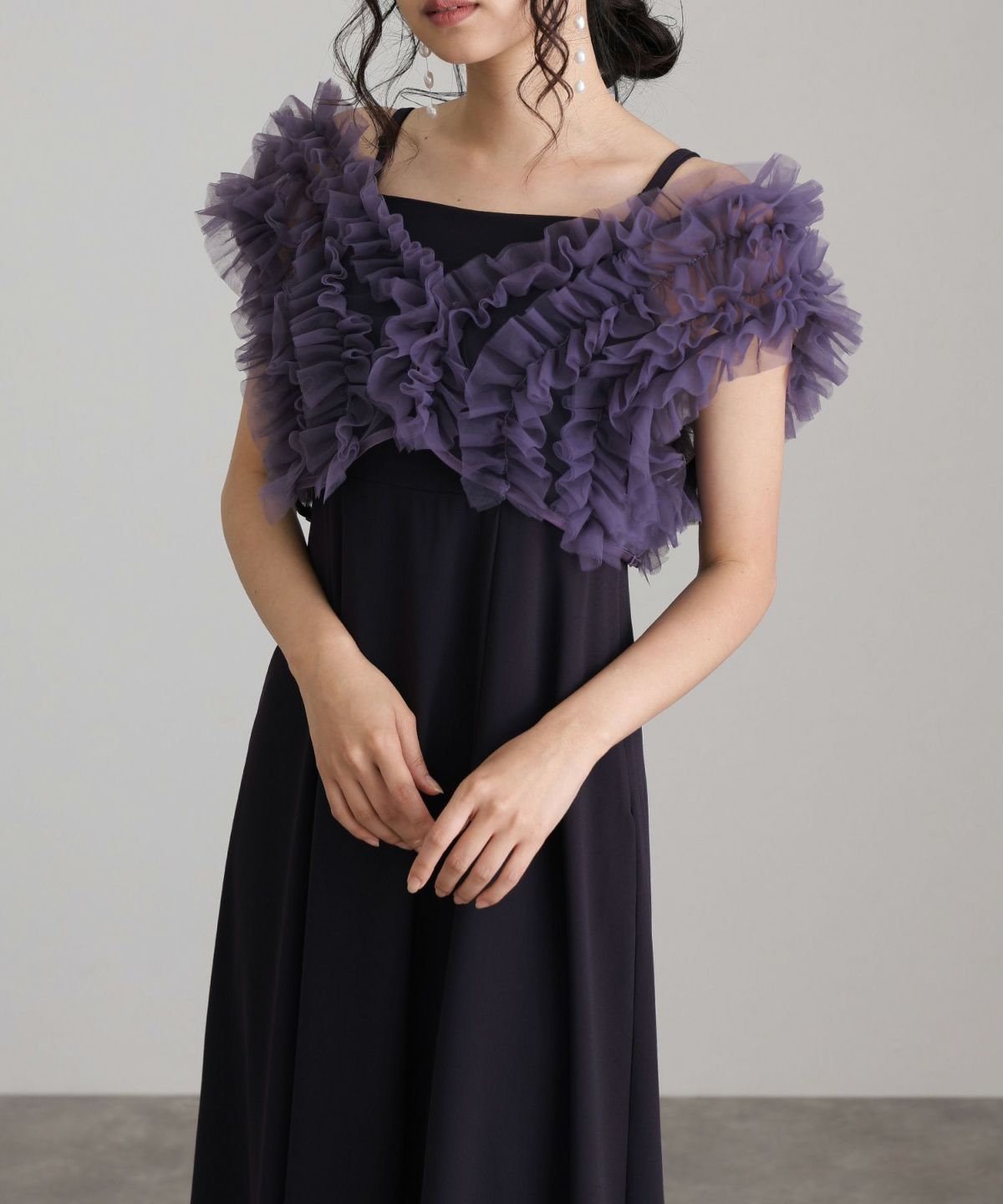 ギャザーがたっぷり入ったチュールベストがポイント。