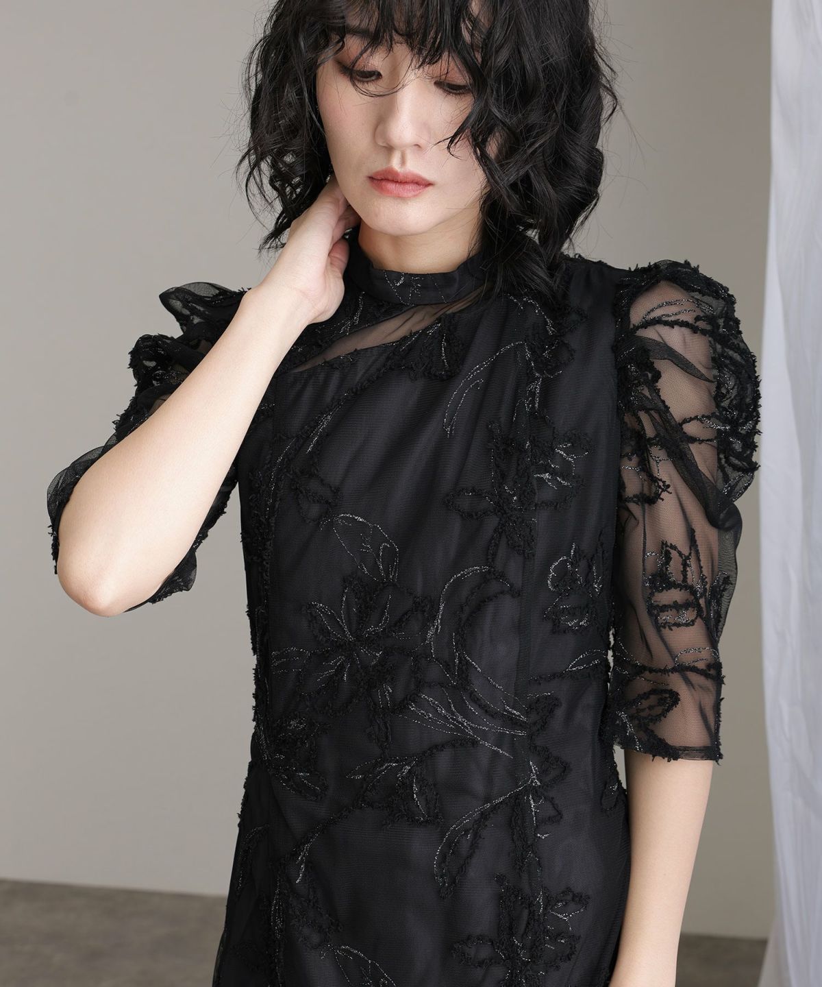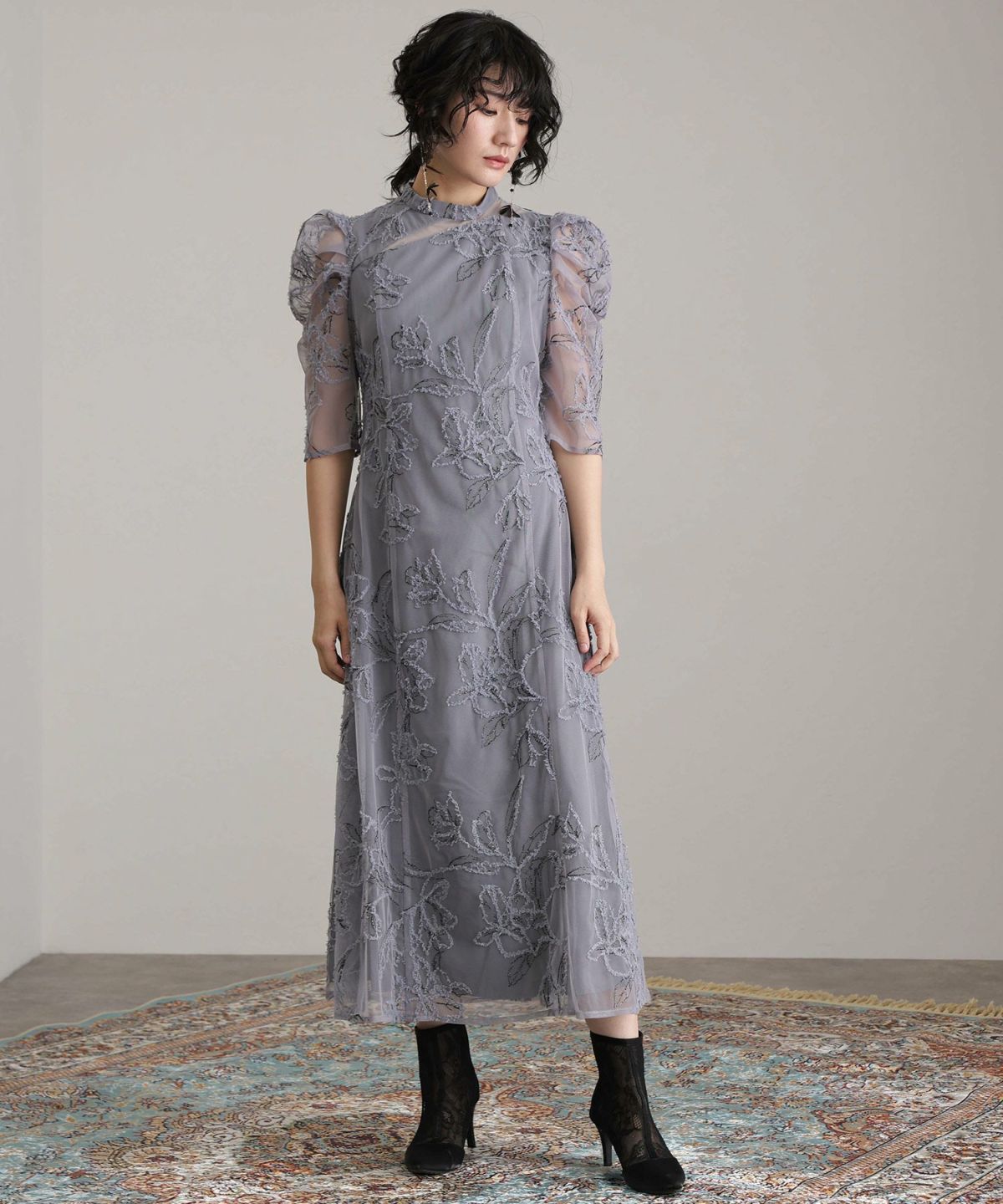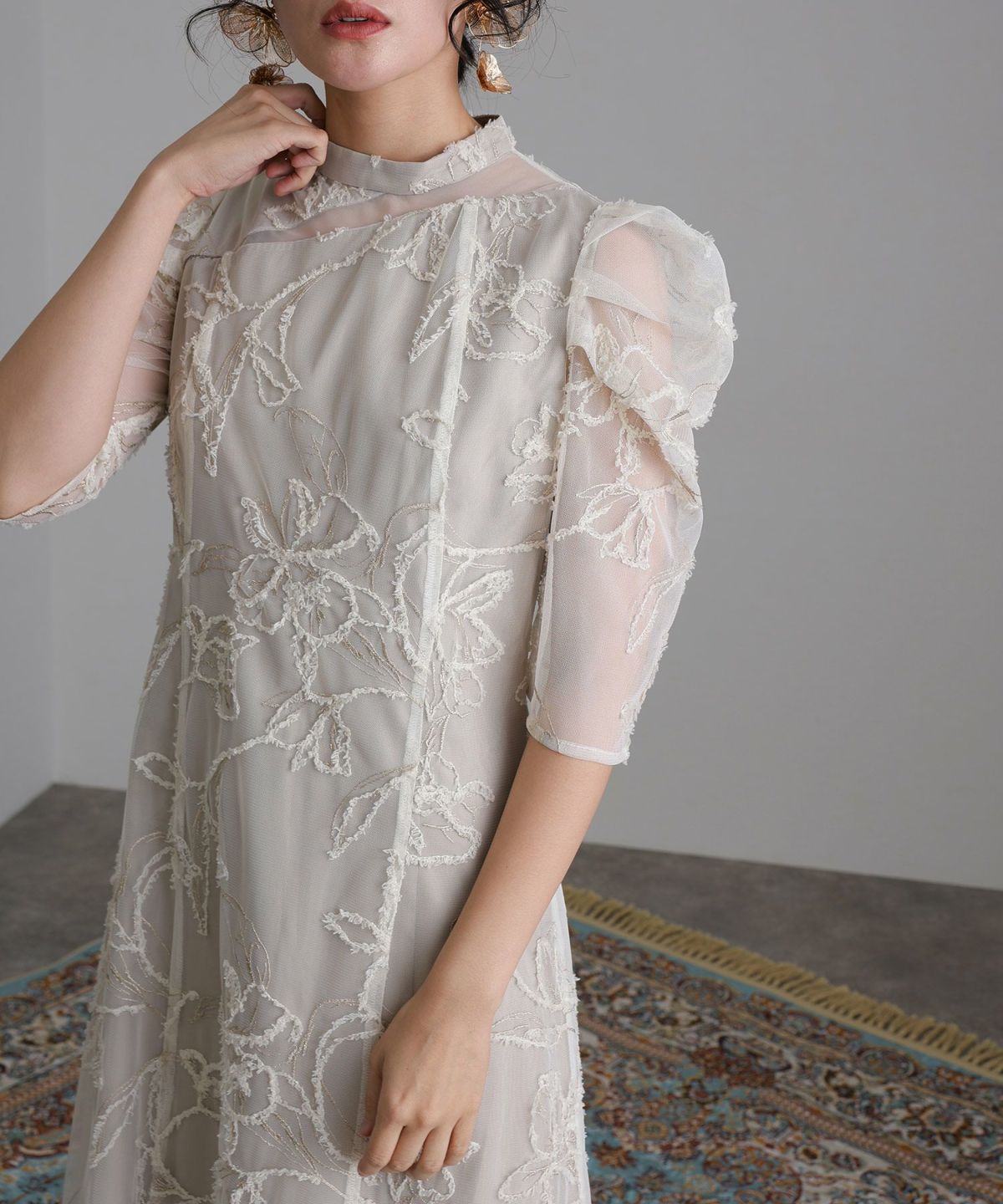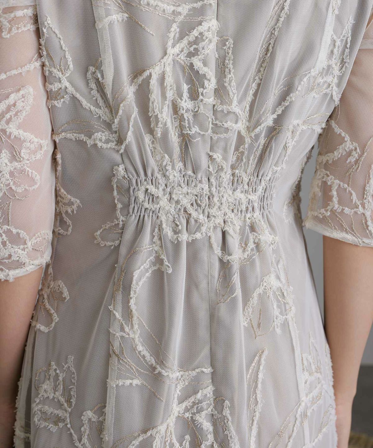 立体刺繍レースが魅力のアシンメトリーカットドレス