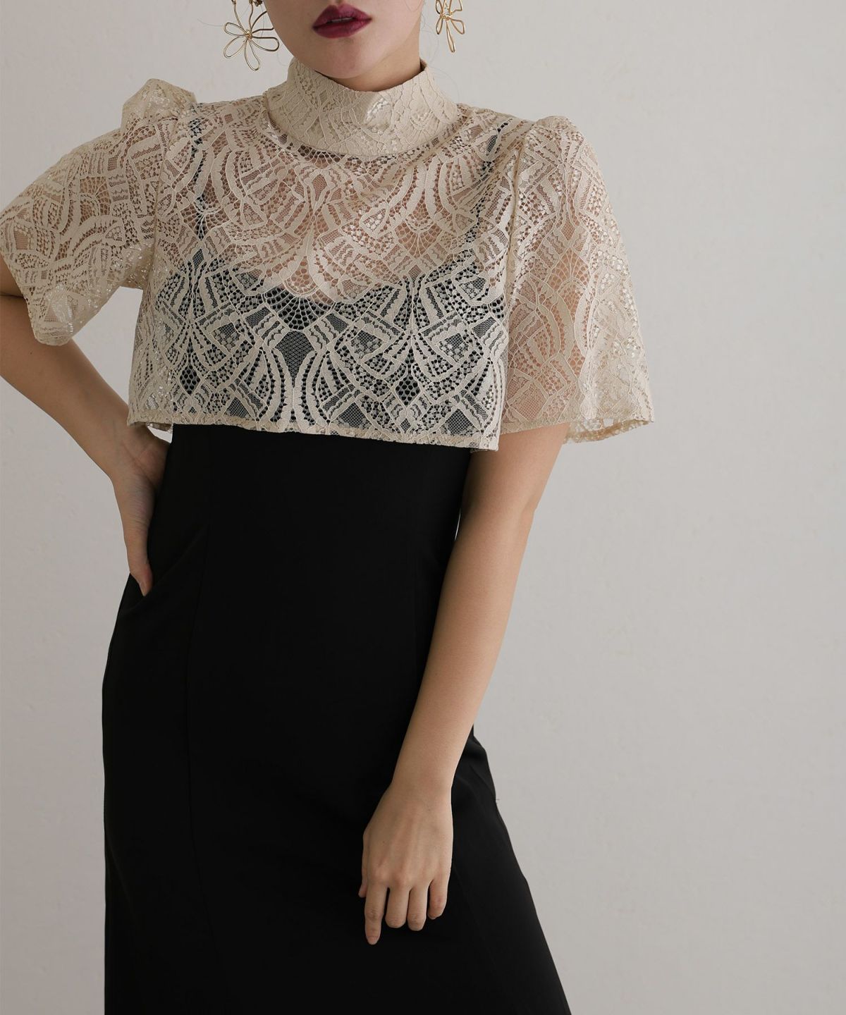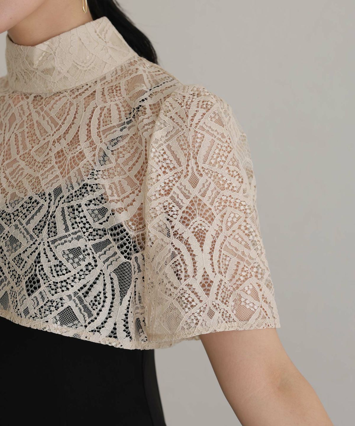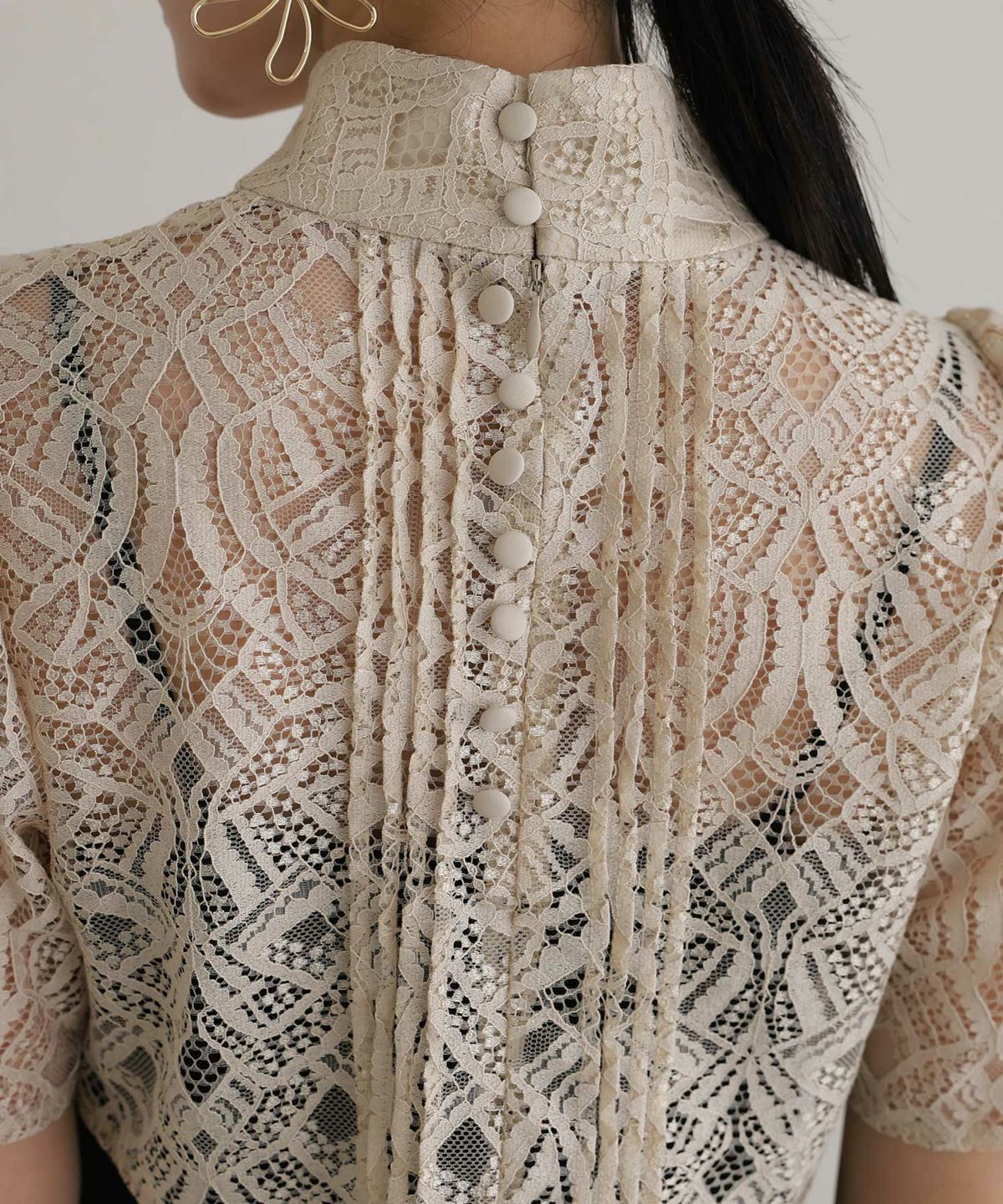 ラメ糸が使用されたレーストップスが華やかさを演出。