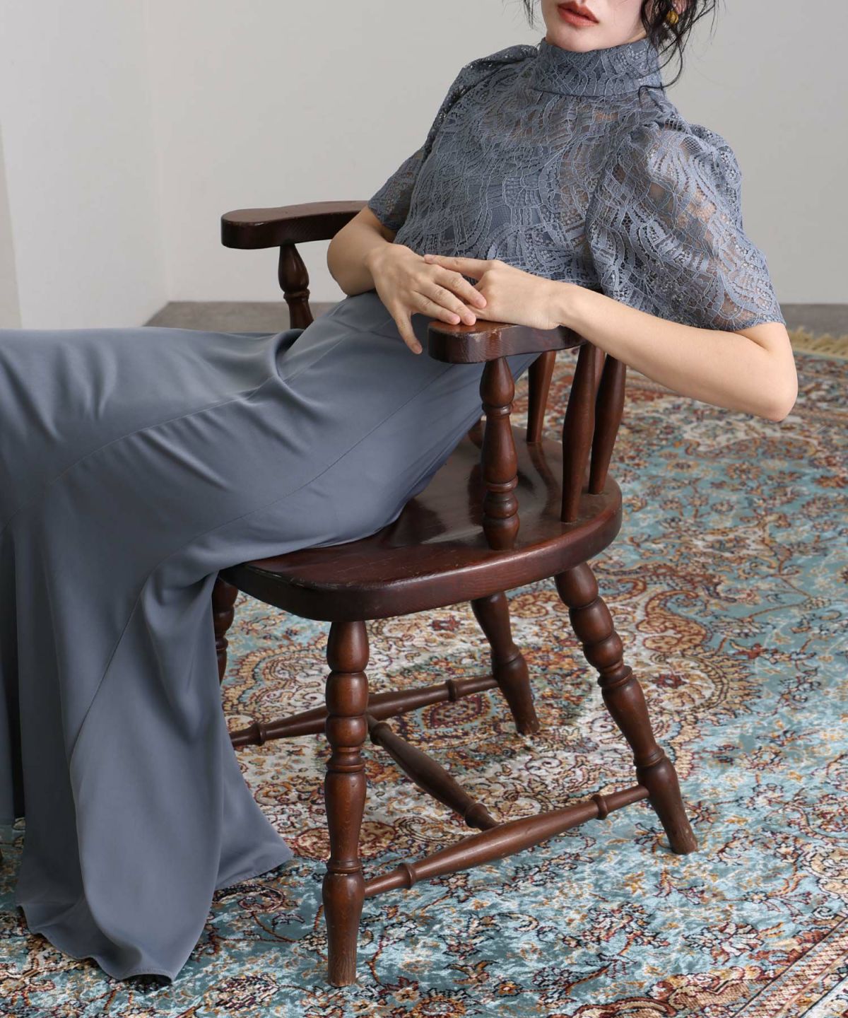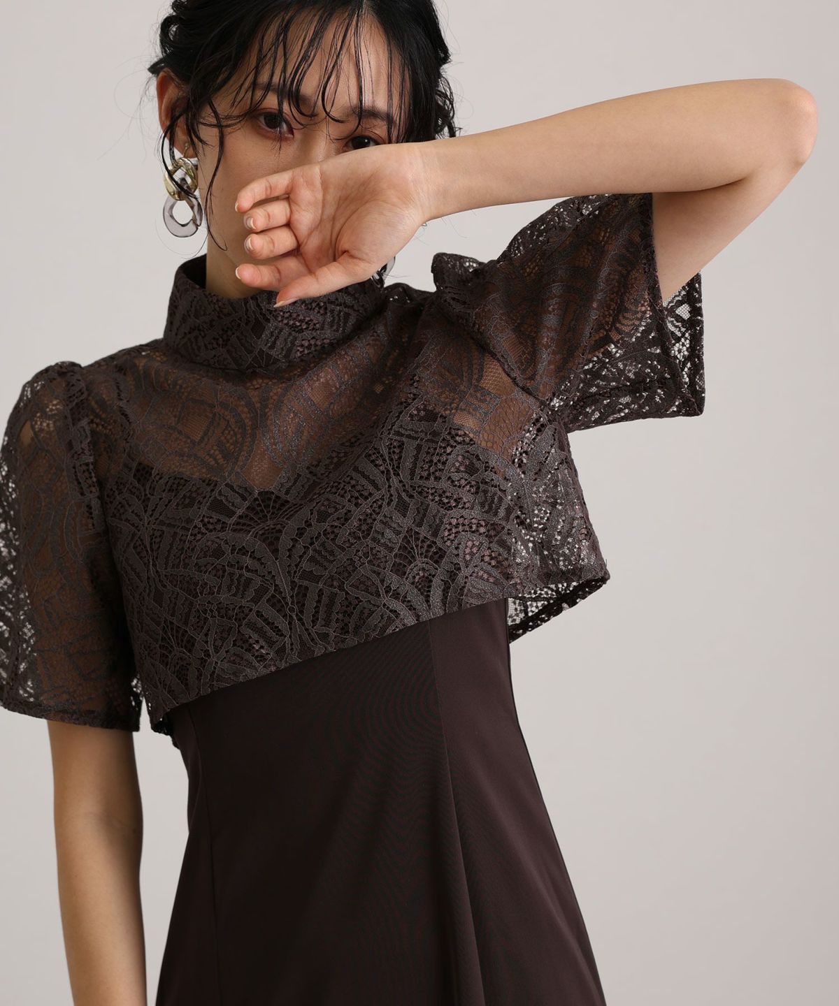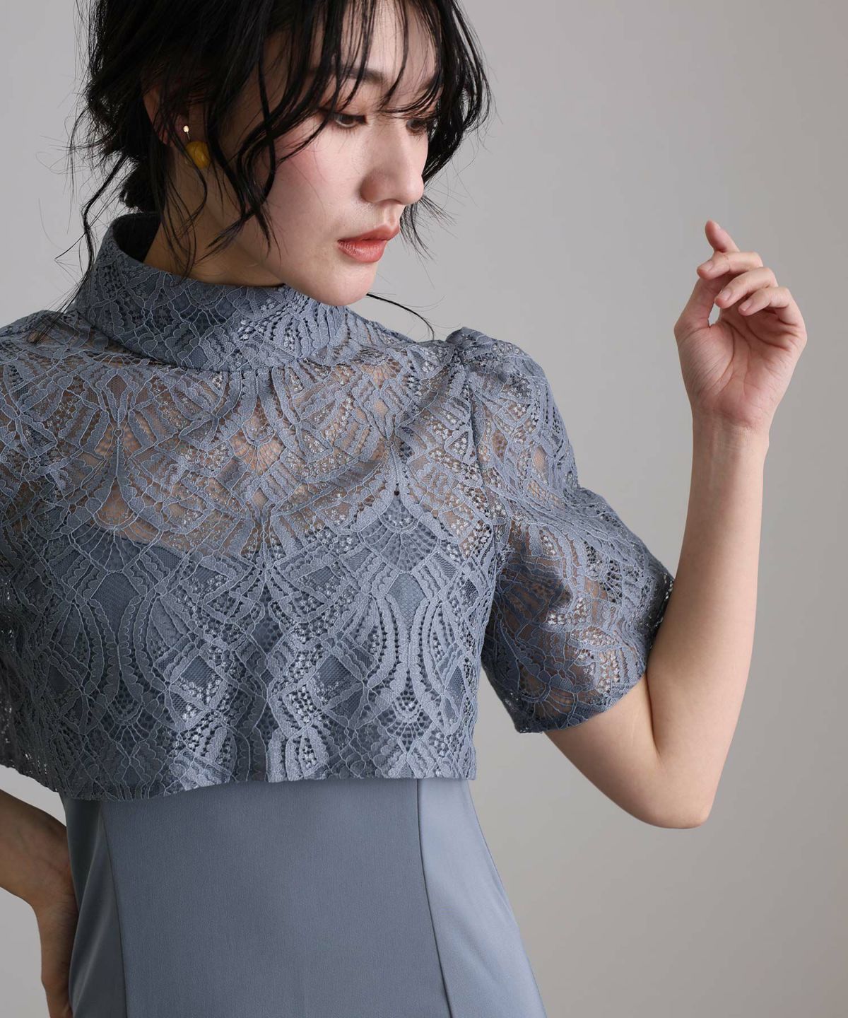 ラメ糸が使用されたレーストップスが華やかさを演出。