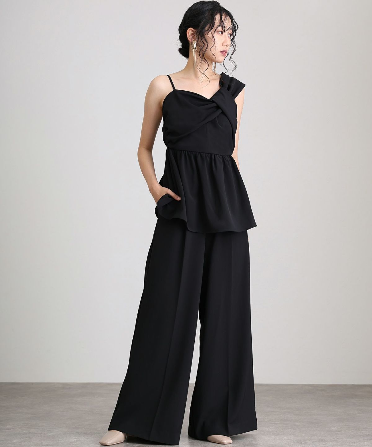 アシンメトリービスチェとパンツの2点セットで、エレガントかつモダンな印象を与えるドレスです。