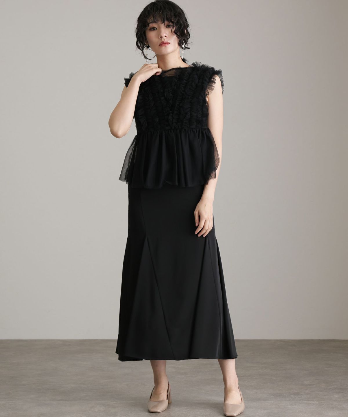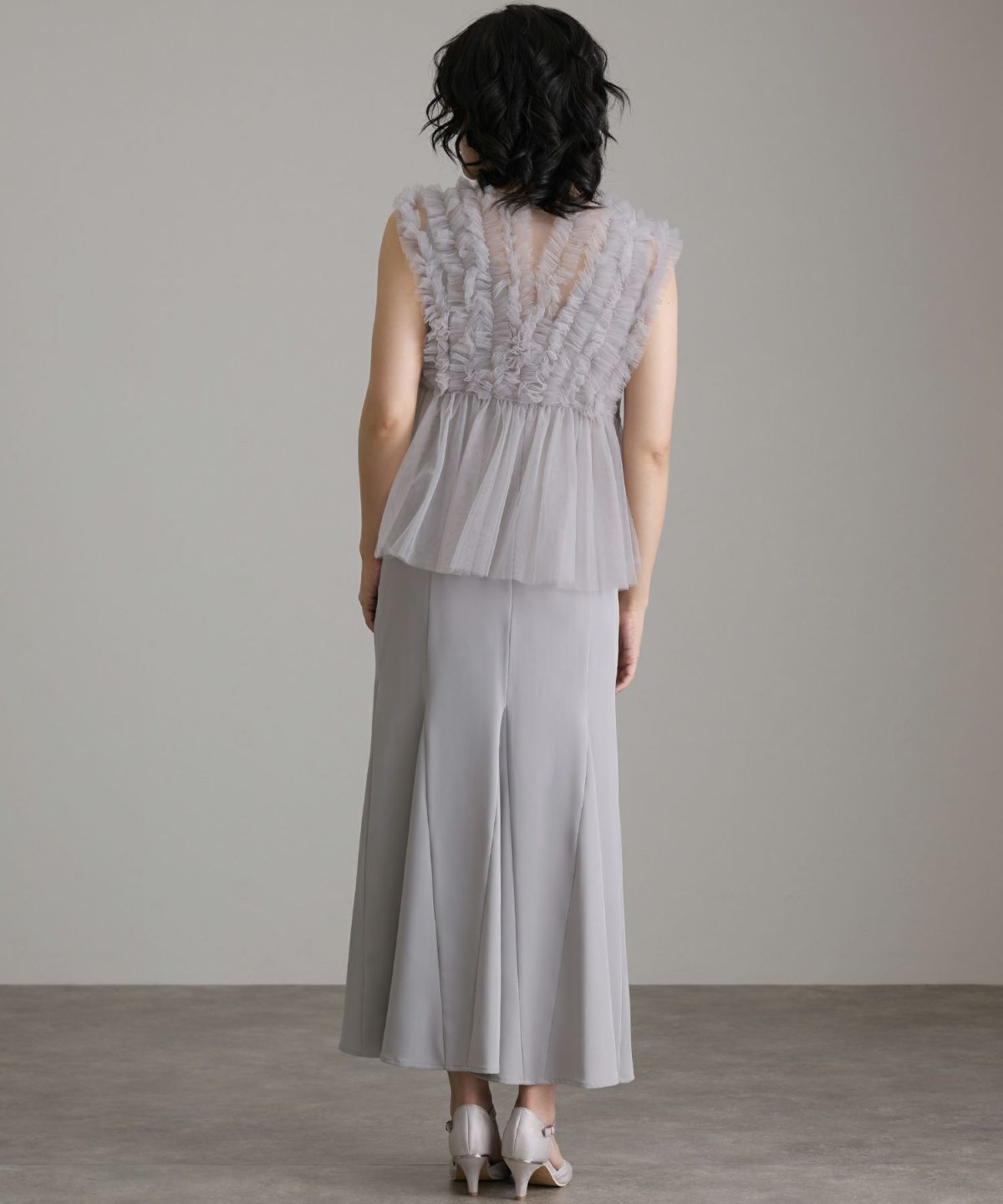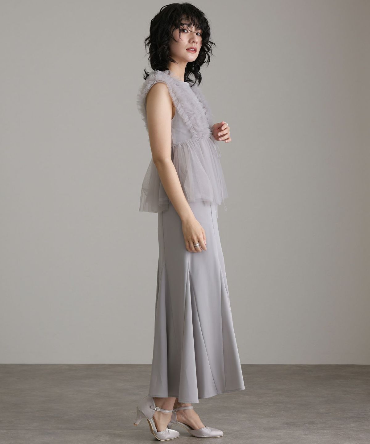 マーメイドラインスカートが、動くたびに揺れて華やかさを演出します。