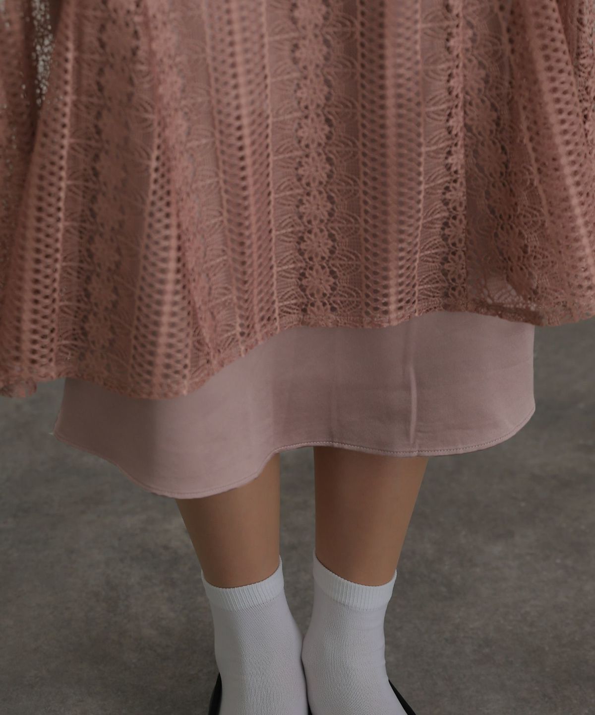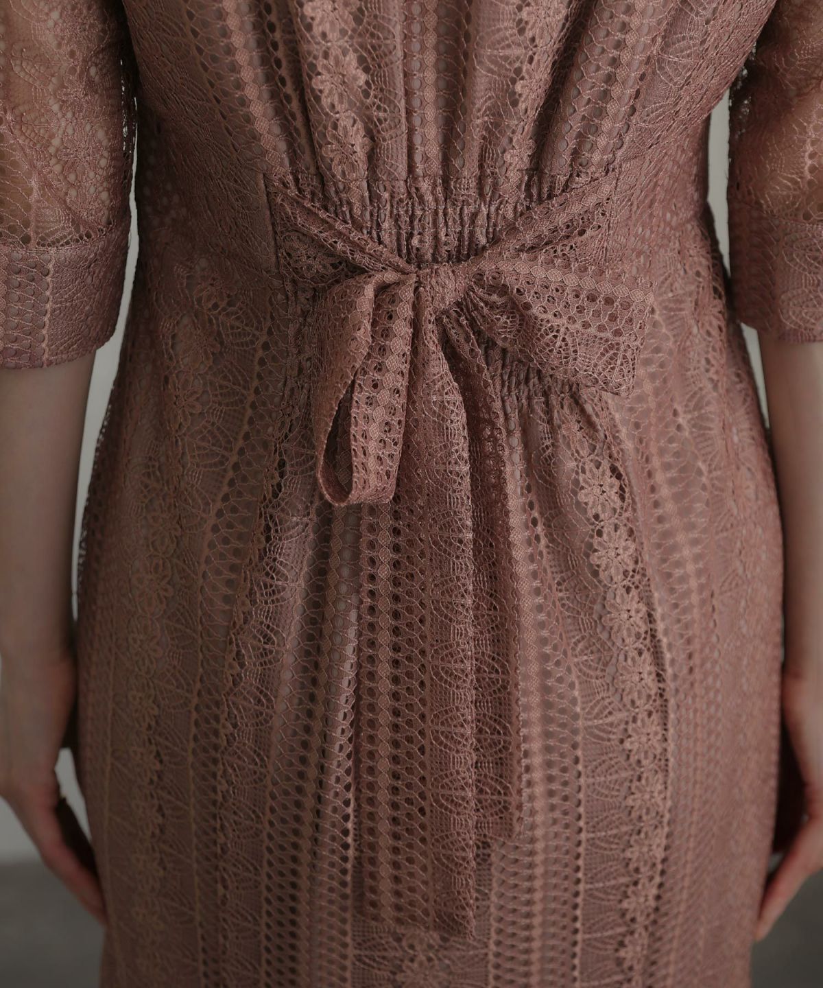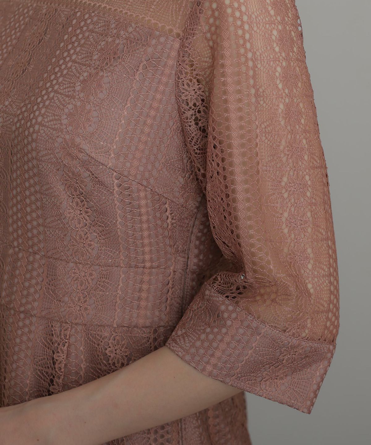 レースの五分丈の袖はさり気なく二の腕部分をカバーしてくれます。