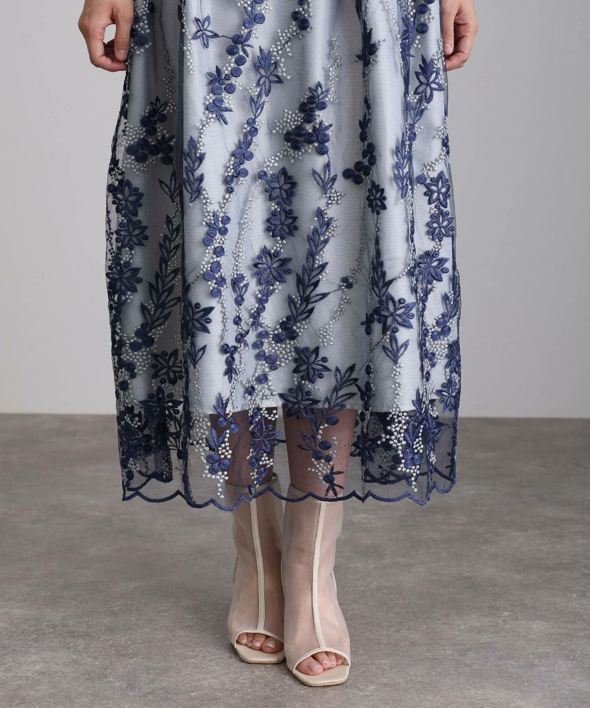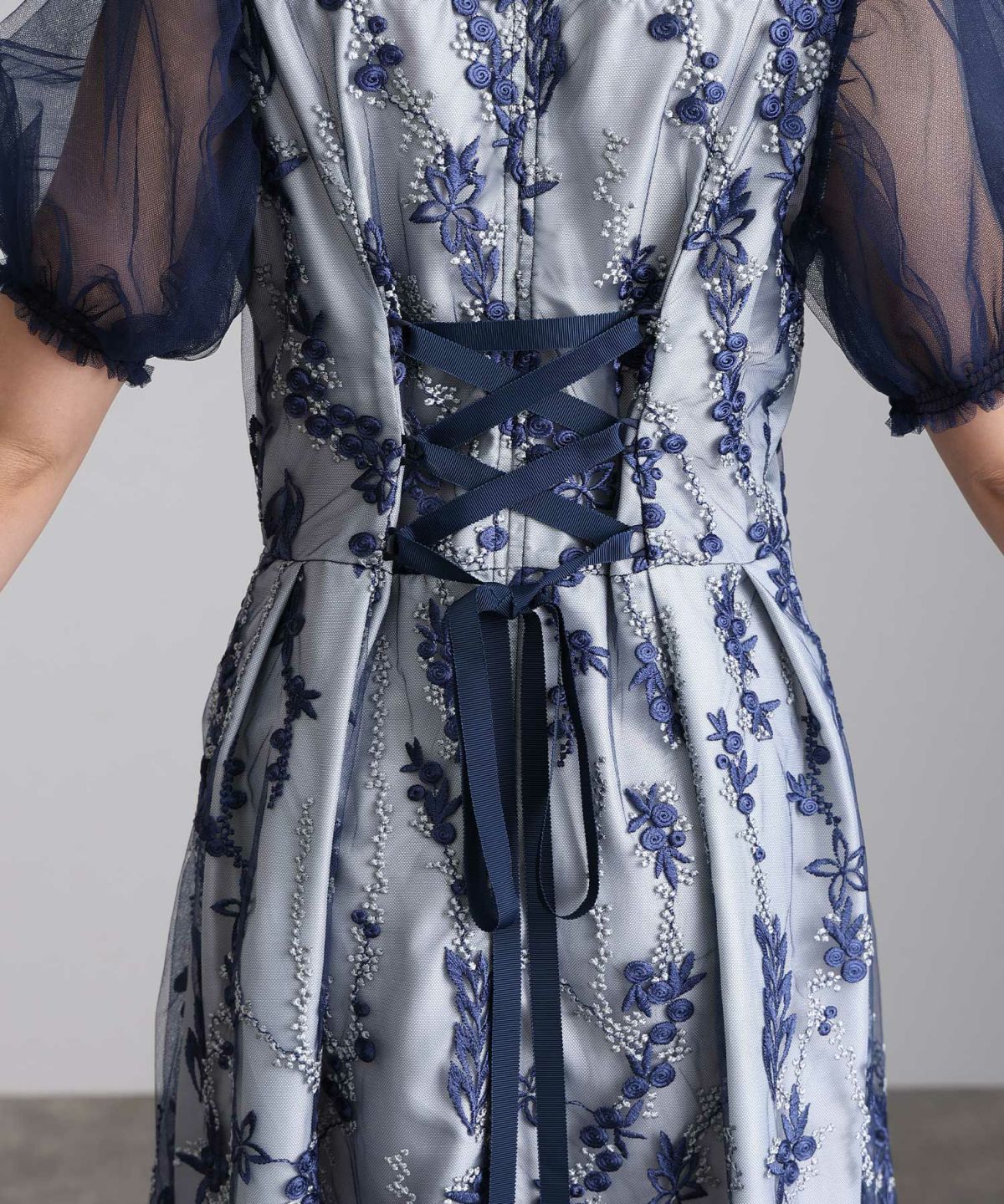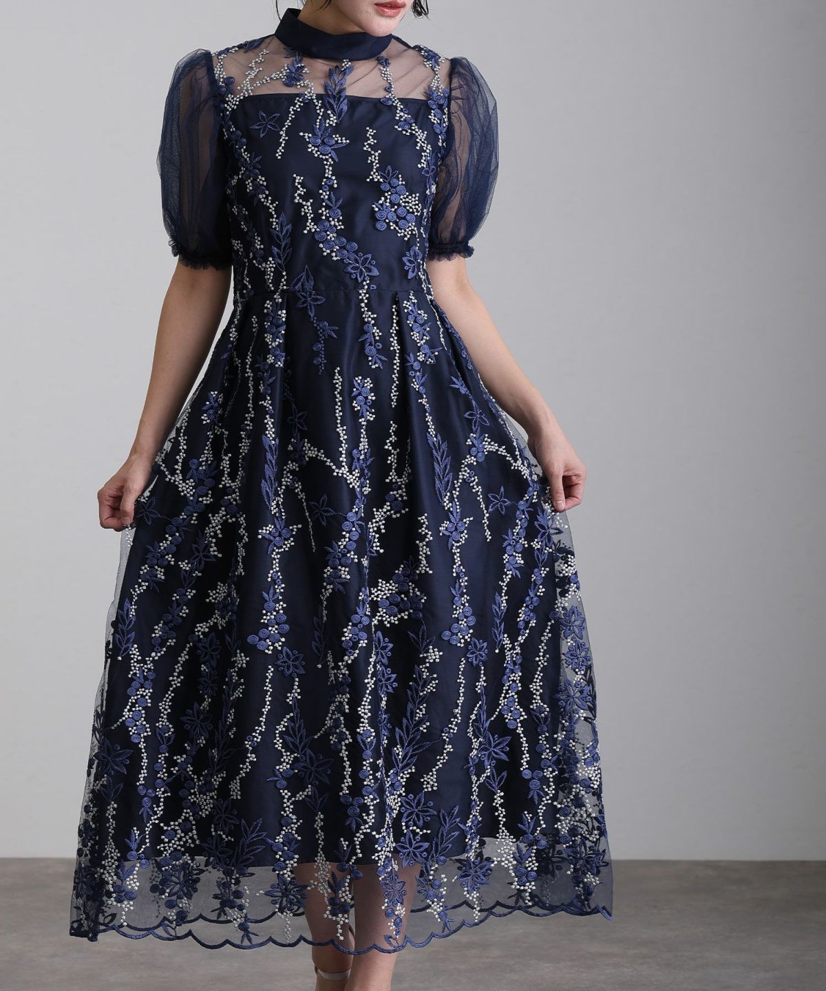 繊細な刺繍レースが施された、エレガントなフレアドレス。