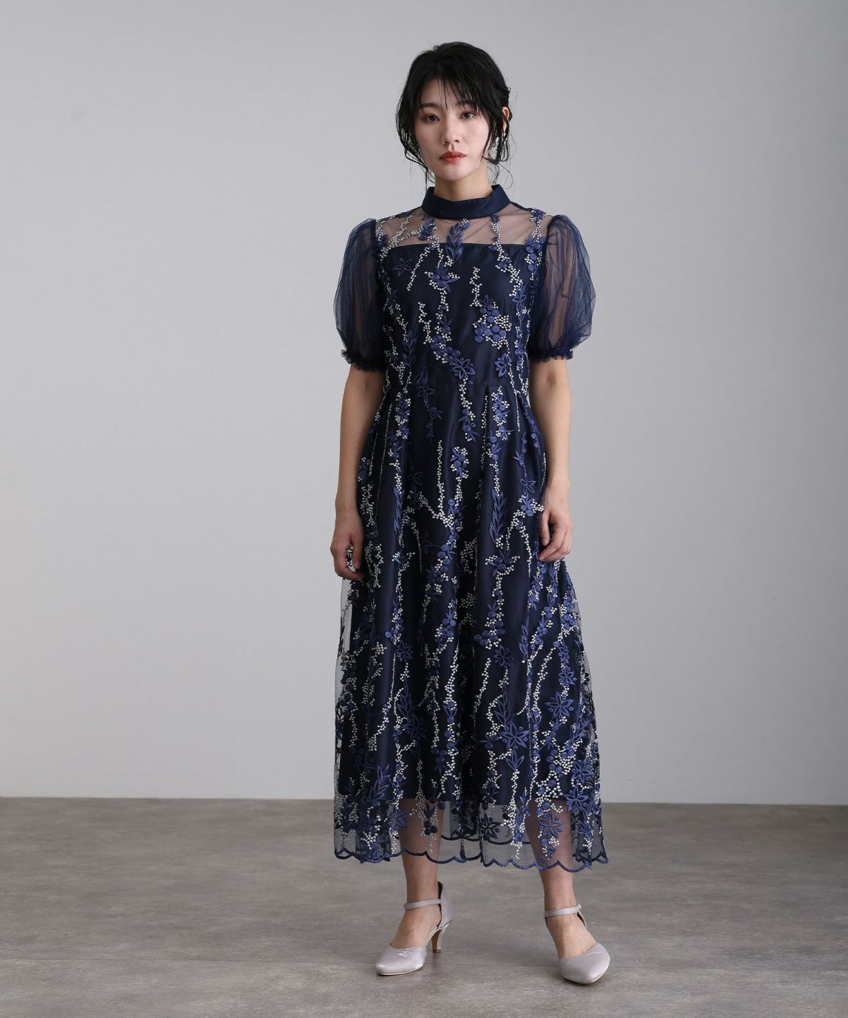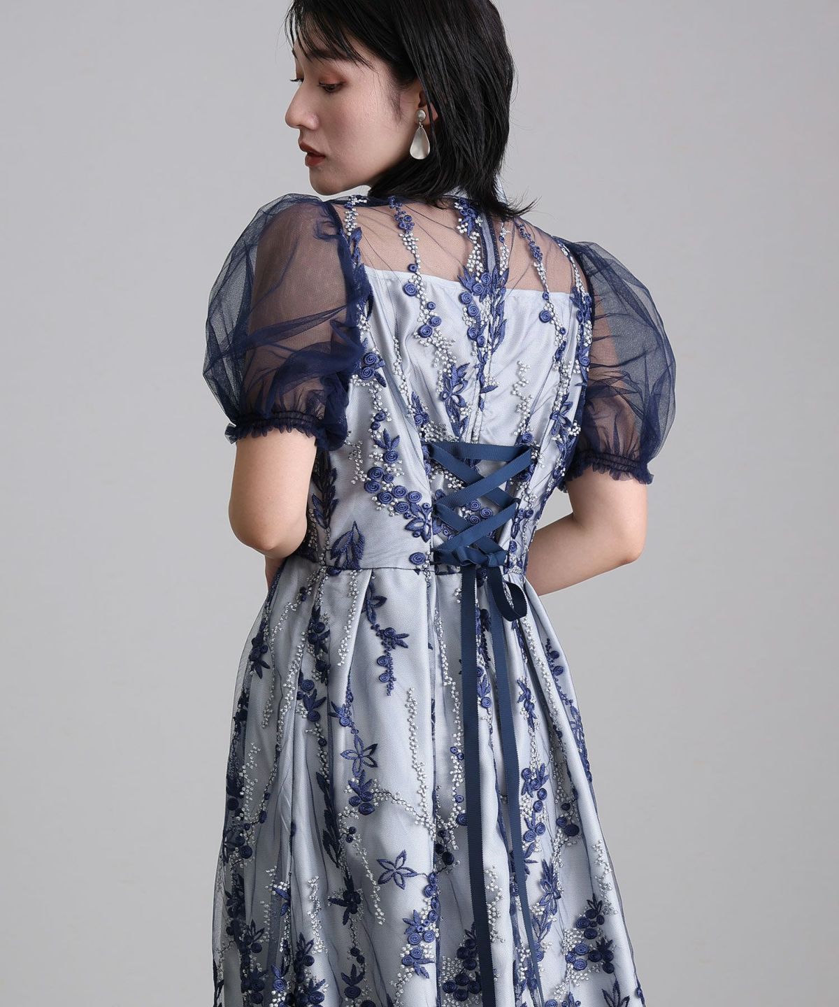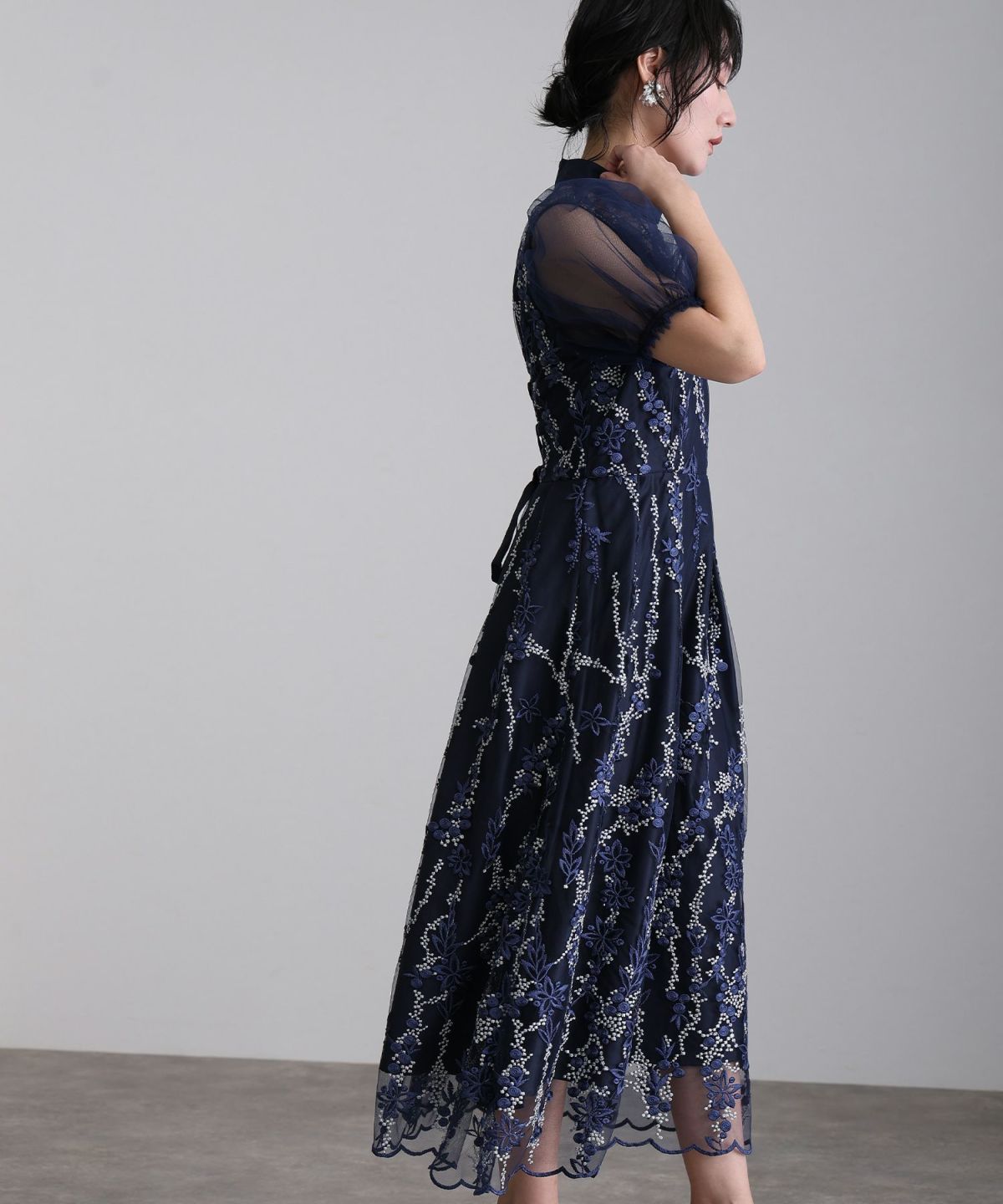繊細な刺繍レースが施された、エレガントなフレアドレス。