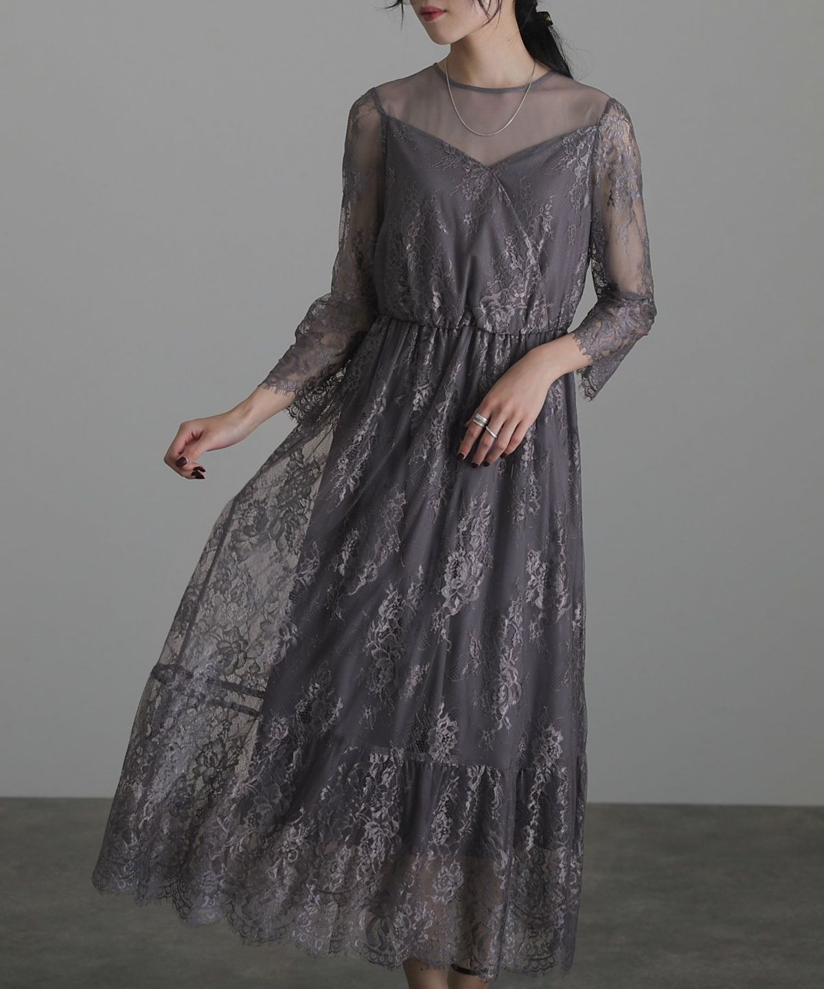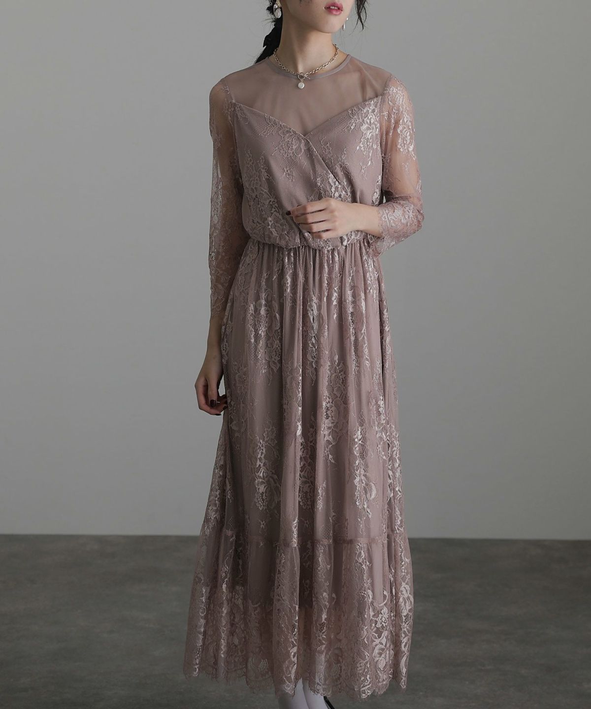 ■艶レース×カシュクールデザイン艶やかな総レースと透け感が上品な一着。カシュクールデザインによるすっきりとした首元で顔周りも華やかに。袖や裾に施されたスカラップレースで細やかな部分もオシャレなデザイン。アンニュイなカラーバリエーションがかわいらしくも大人な印象を与えてくれます。