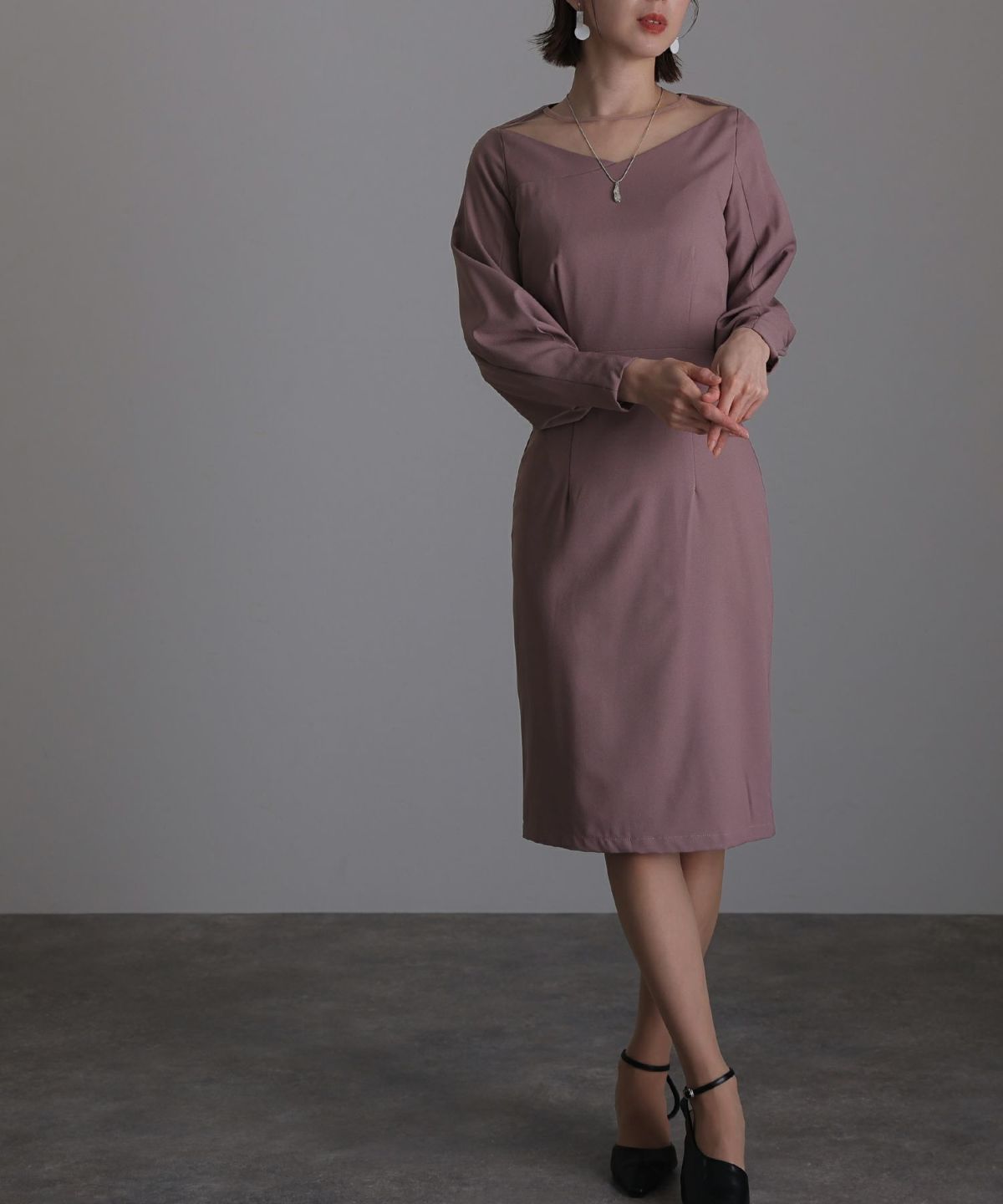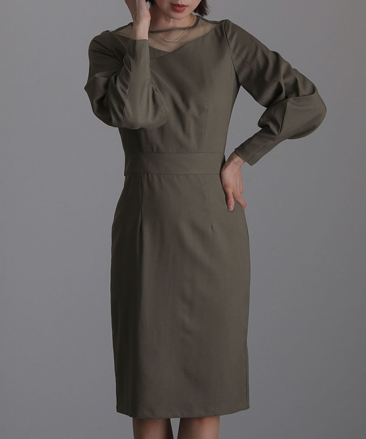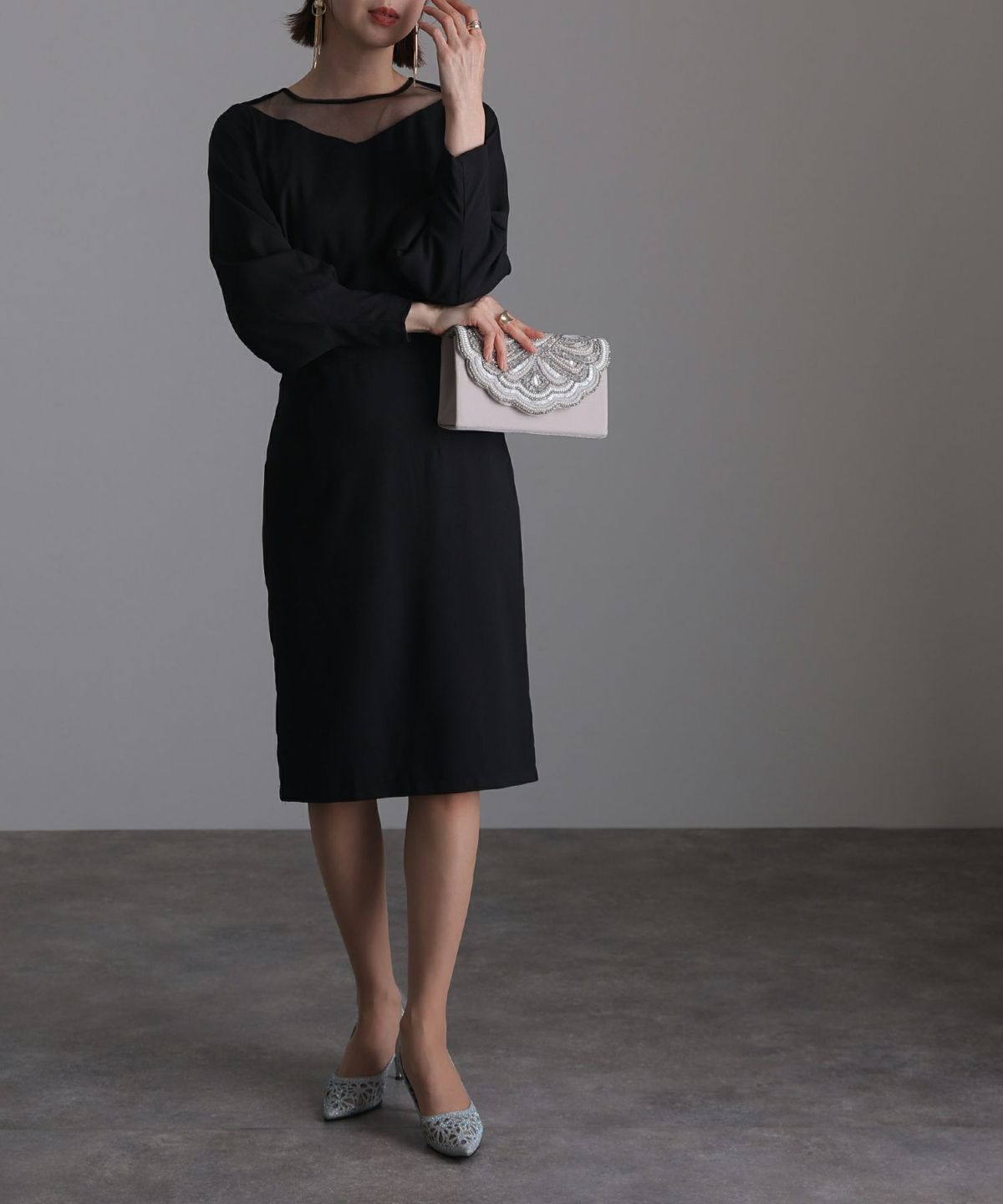 ■チュールとの切り替えがおしゃれデコルテのチュールの透け感が程よく、ドレスとの切り替えが美しい上品な一着です。