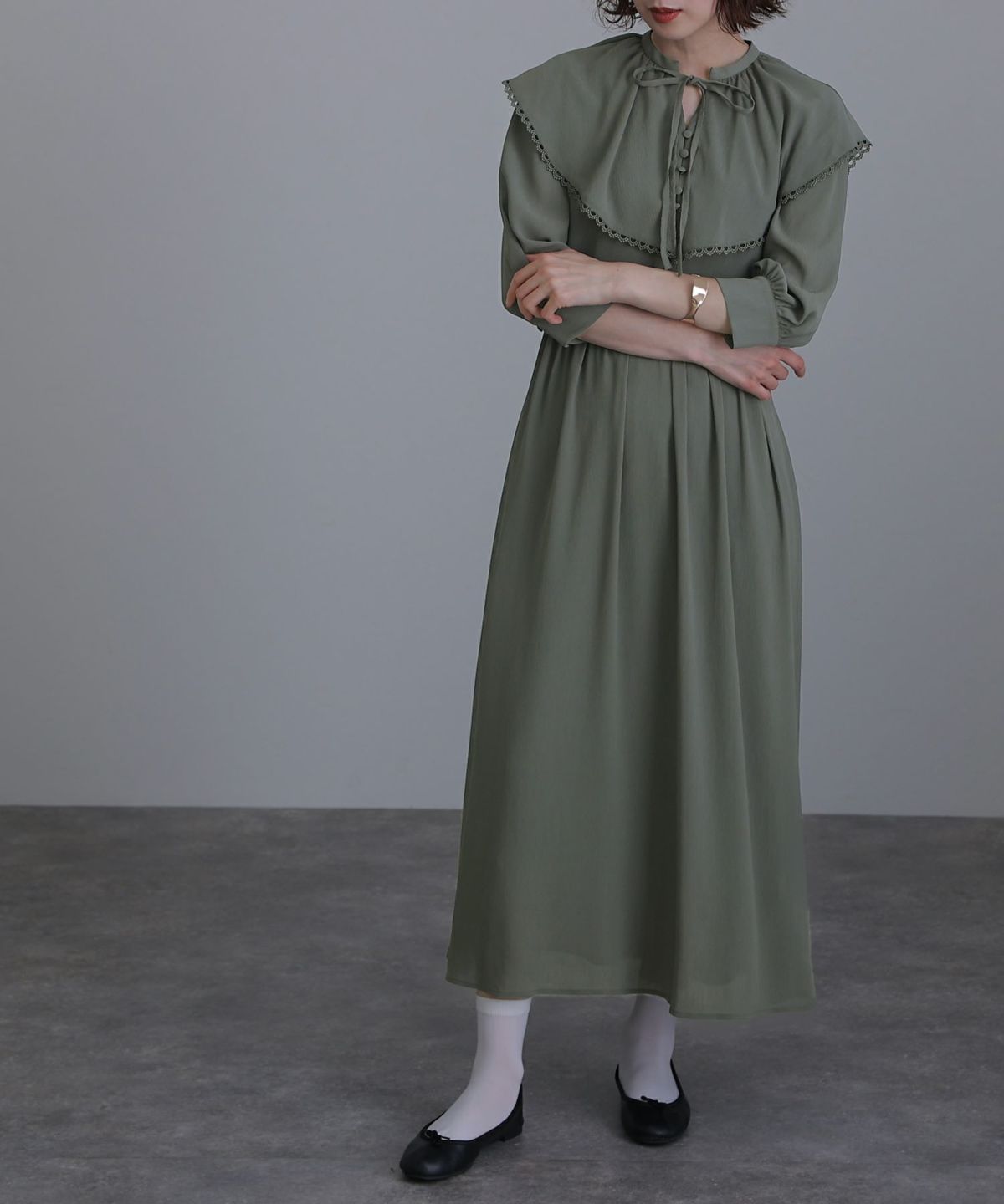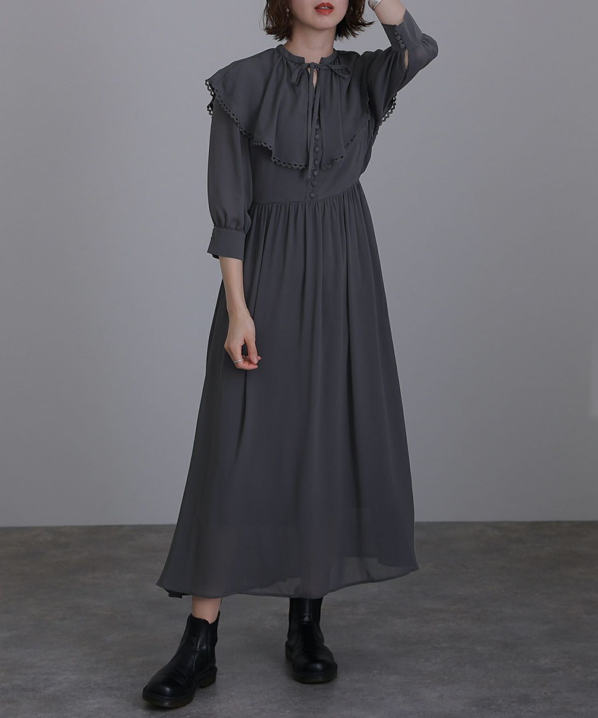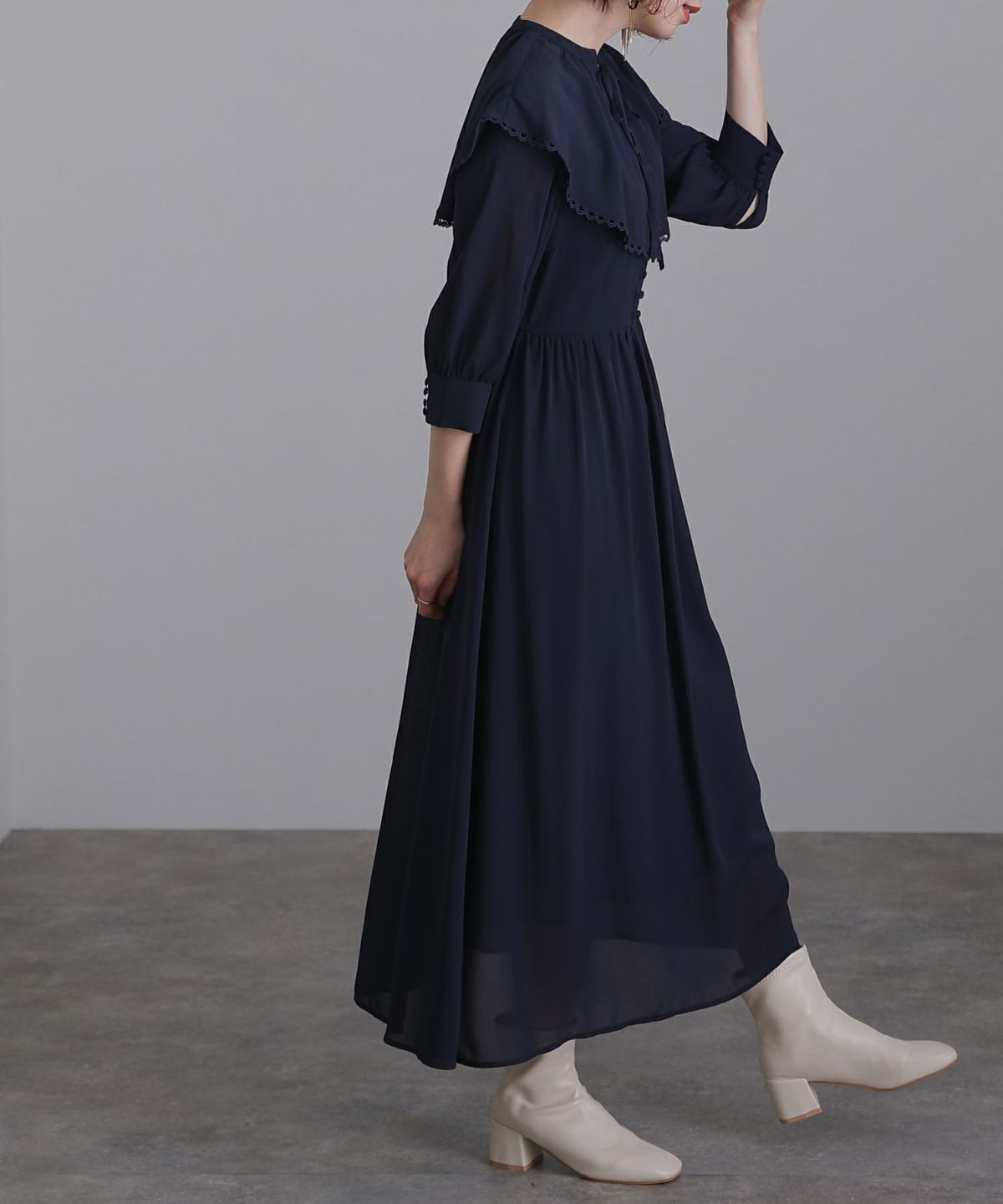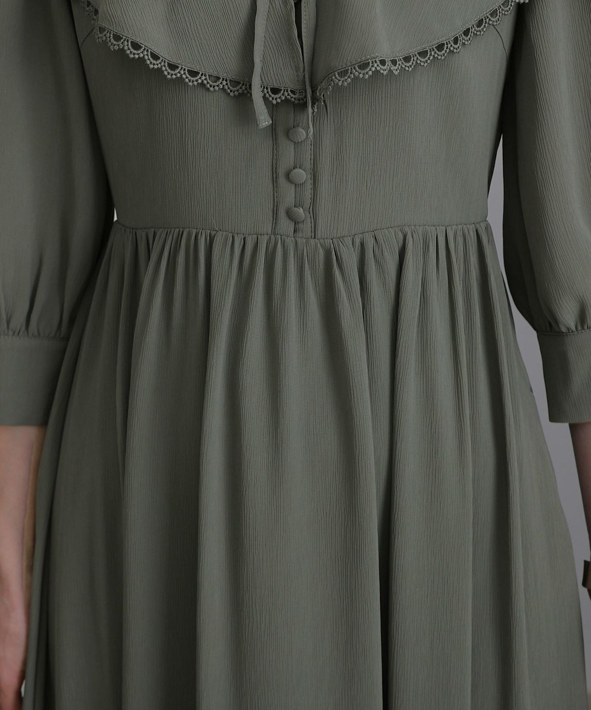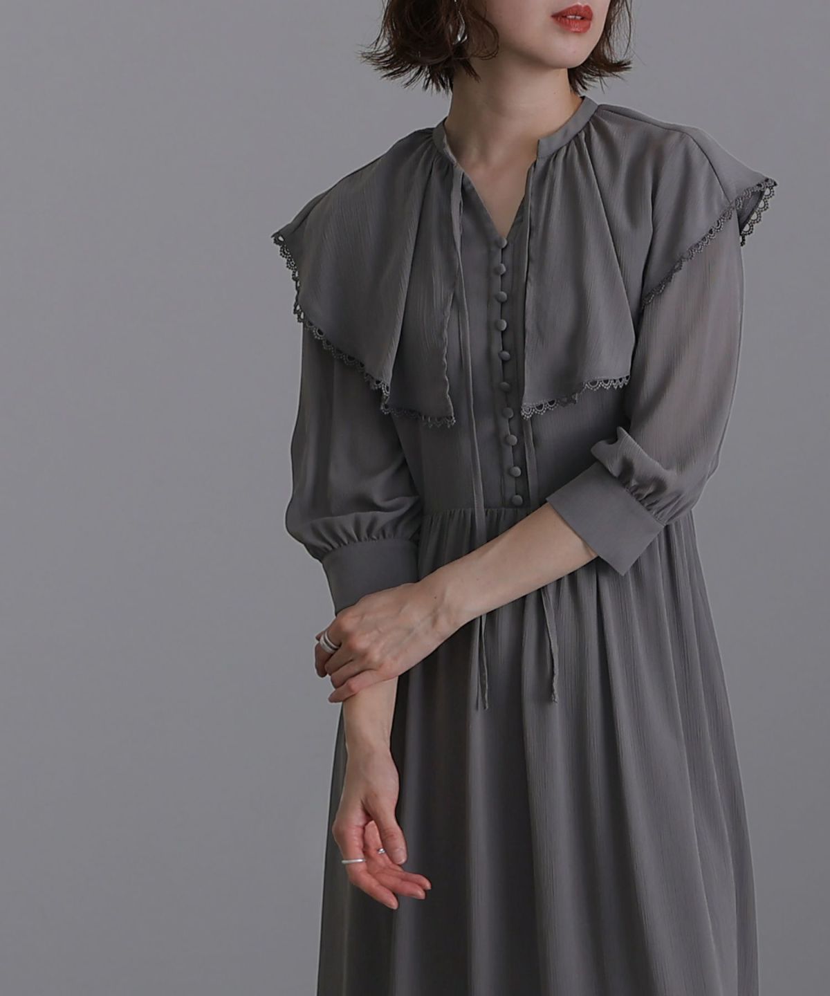 ■ビックカラー×総シフォントレンドのビックカラーを取り入れたクラシカルで大人可愛いワンピースです。総シフォンのためお肌の透きを気にせず上品で落ち着きのある雰囲気を演出。胸元のリボンとさりげないボタンがアクセントのお洒落なデザイン。パーティードレスとしてはもちろん、デイリーでも活躍できる着回しアイテムです。