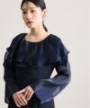 ふんわり広がるボリューム襟と、光沢感のある長袖で優美な雰囲気に。