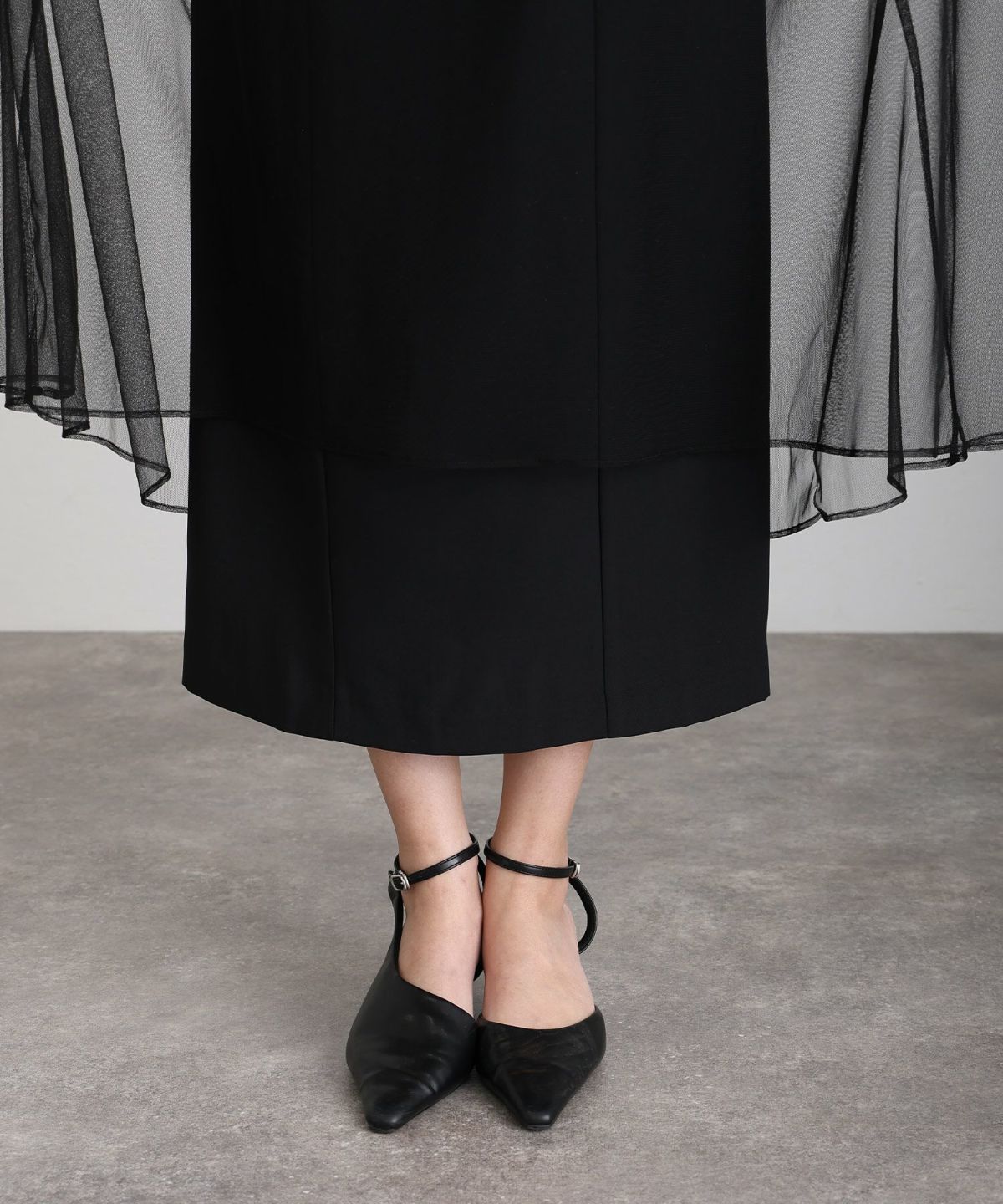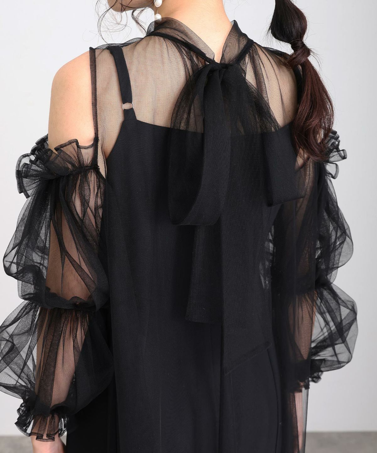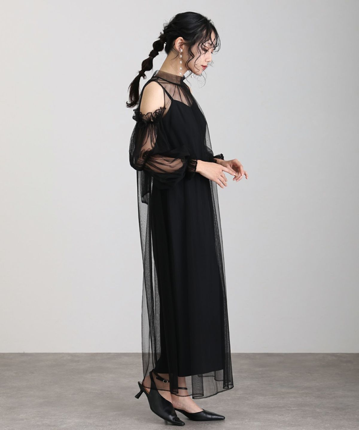 ふんわりとしたチュールとシンプルなキャミワンピースが組み合わさった上品なセットドレス。