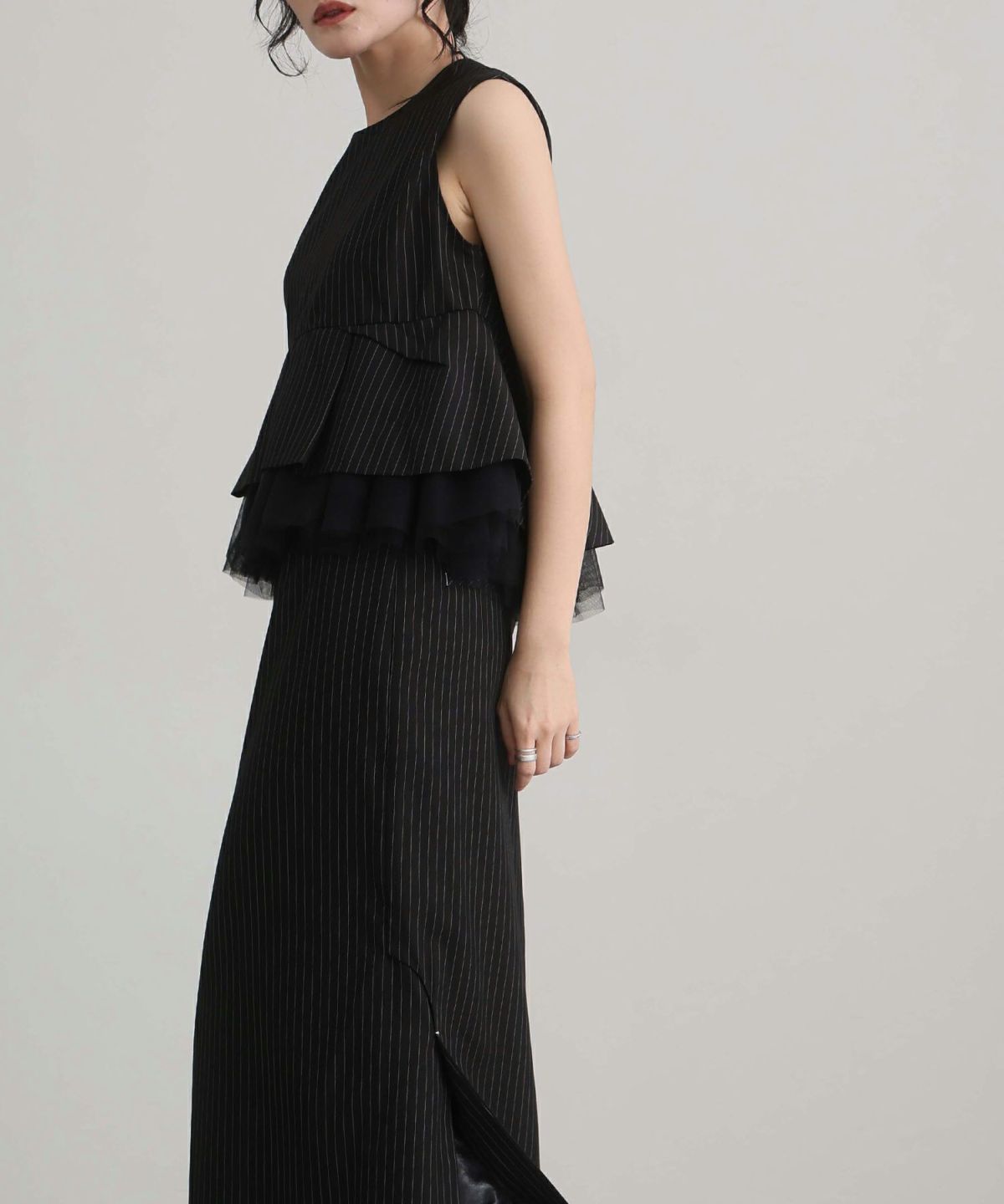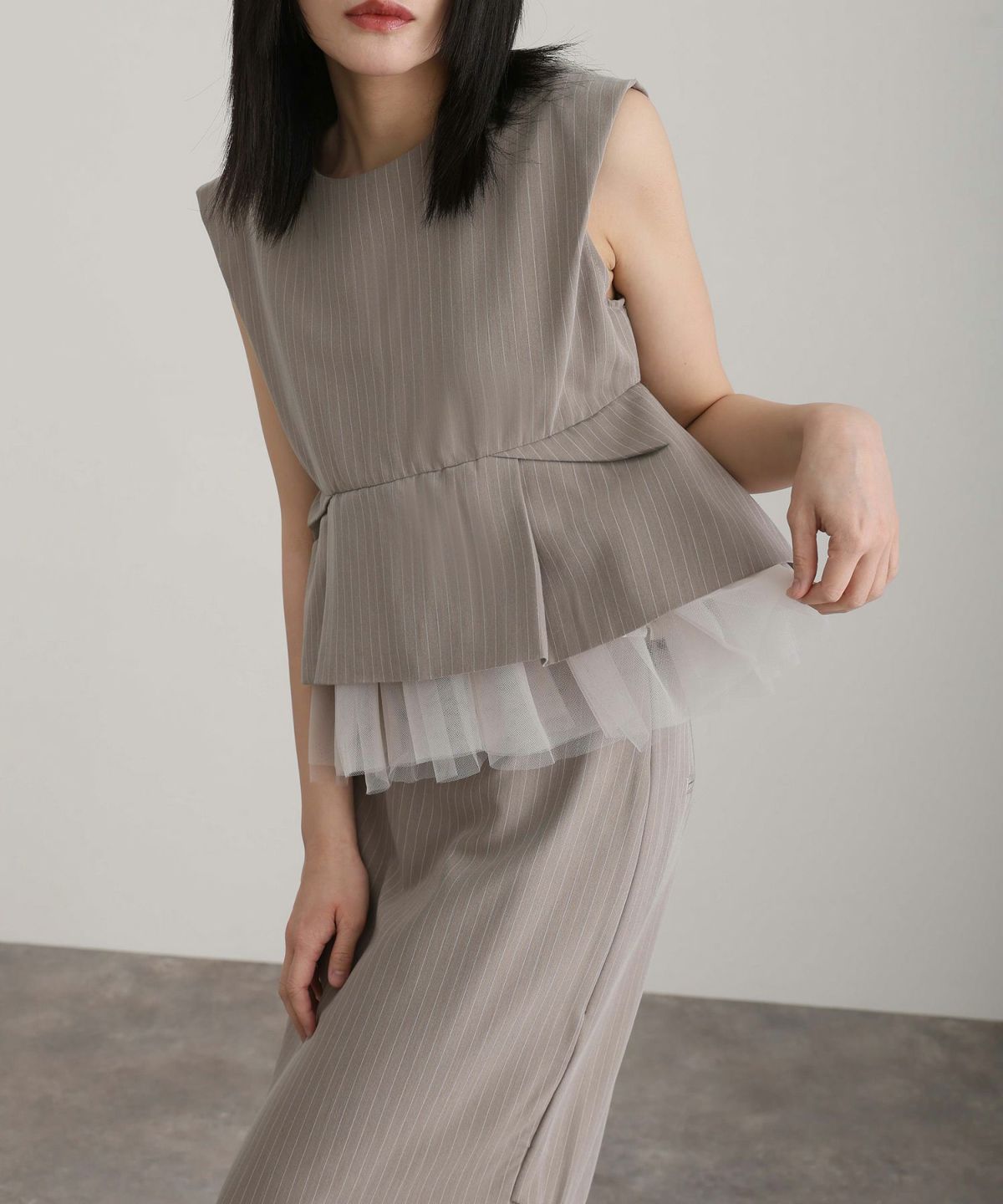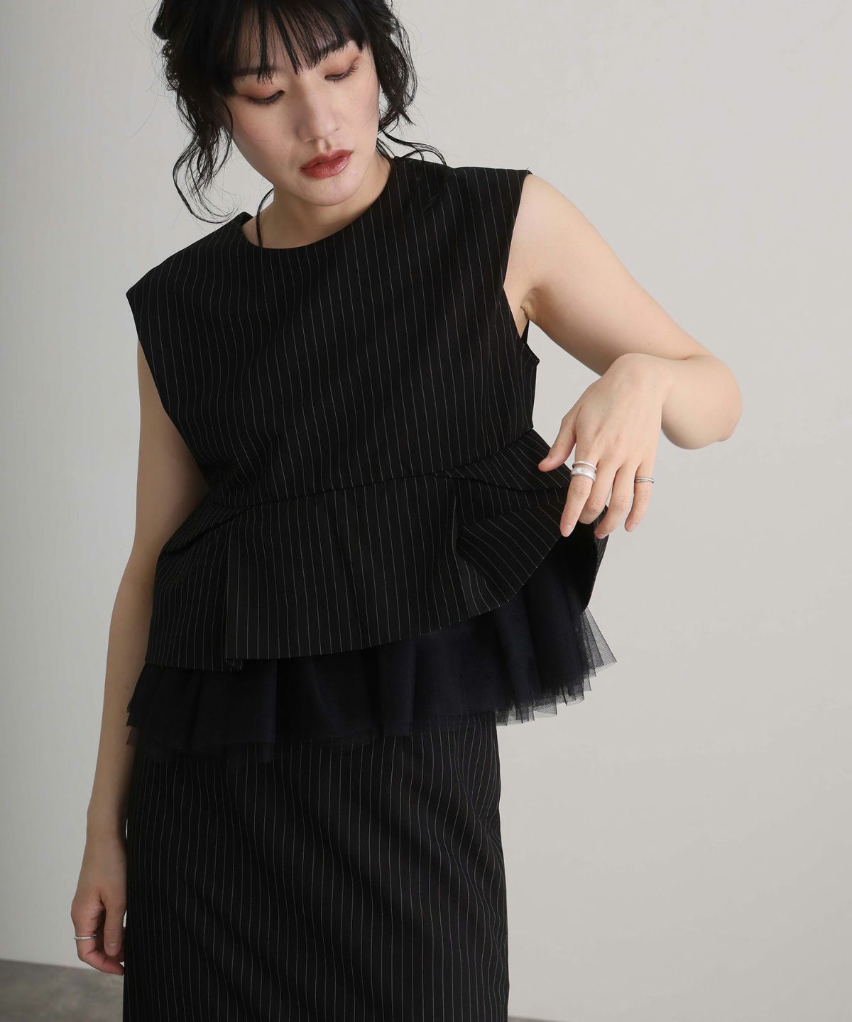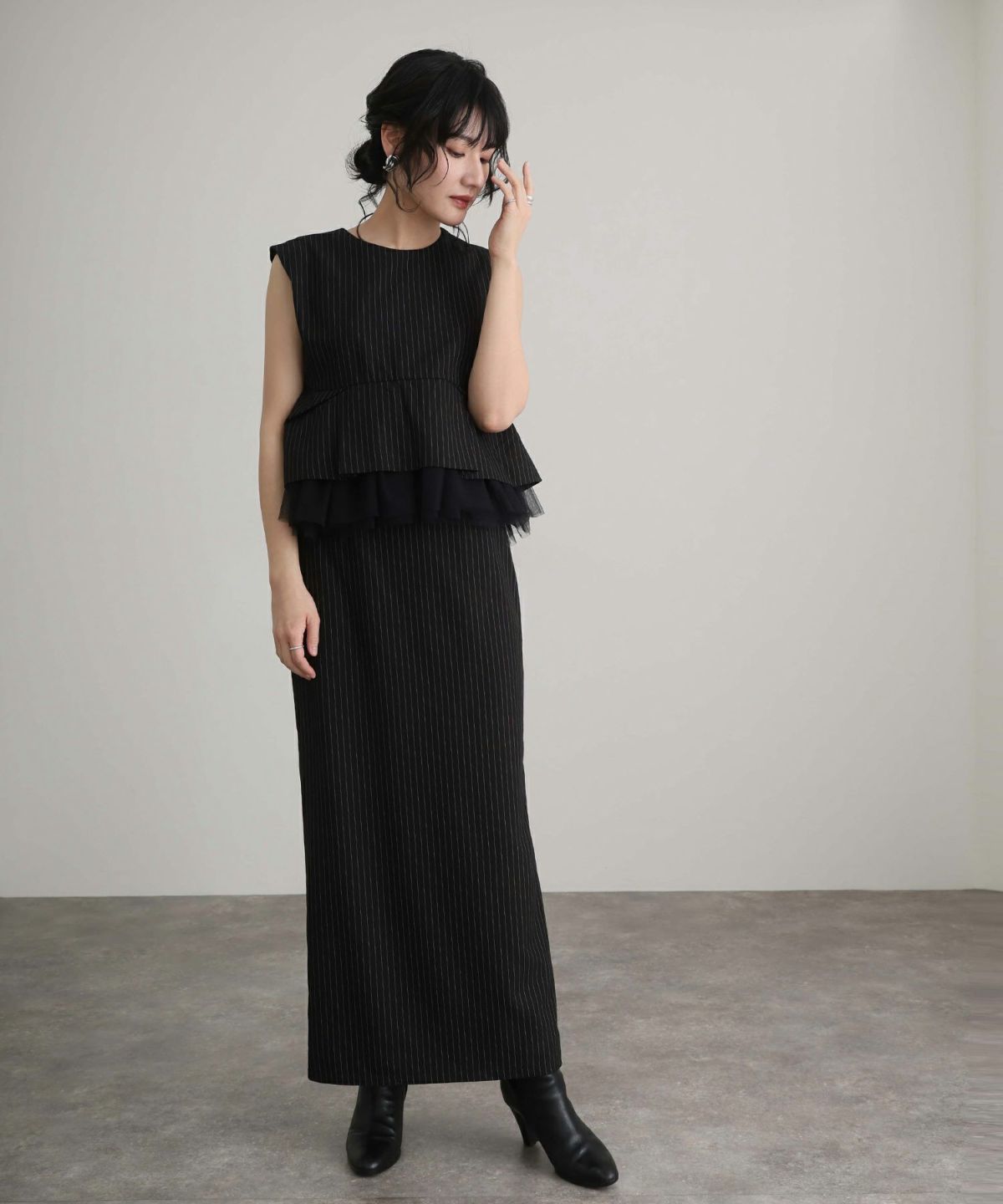 マニッシュな印象を引き立てるピンストライプ素材が魅力のペプラムセットアップ。