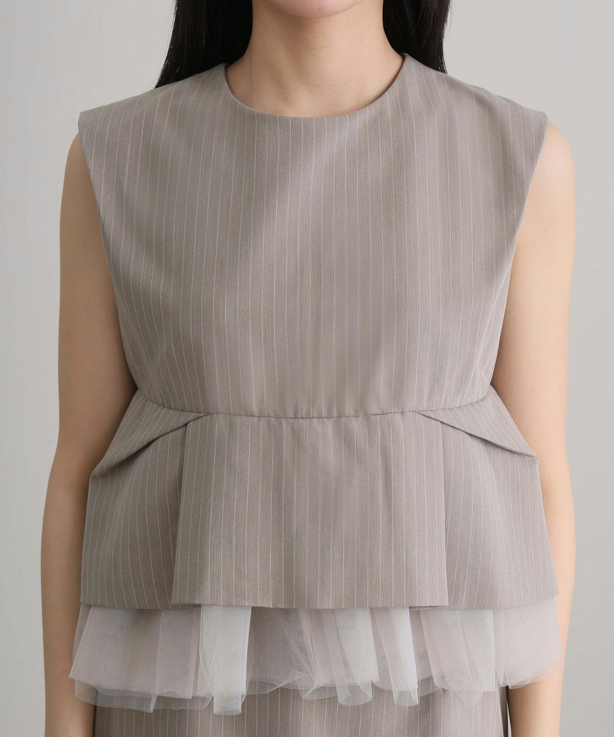 トップスの裾に施されたチュールで軽やかさもプラス。