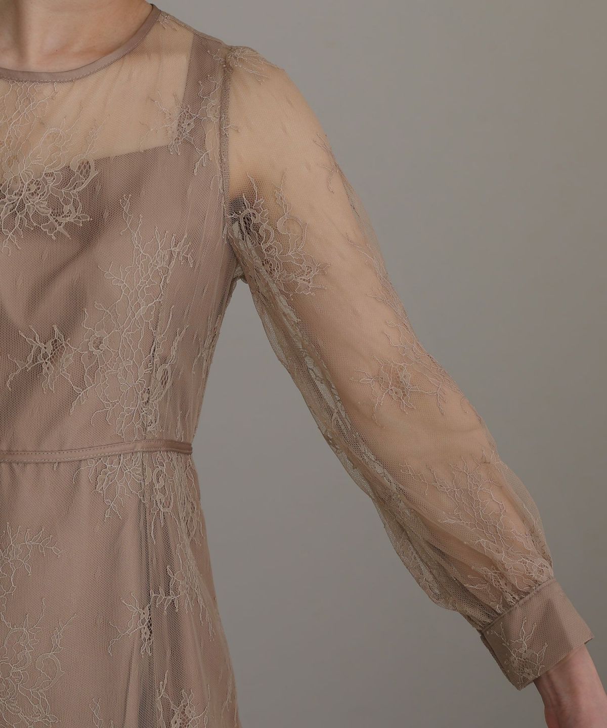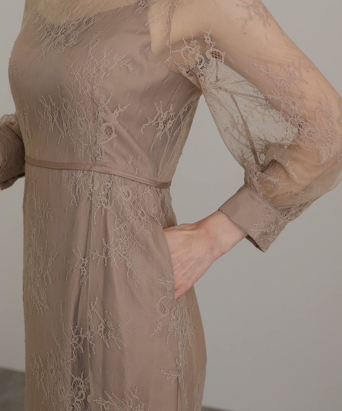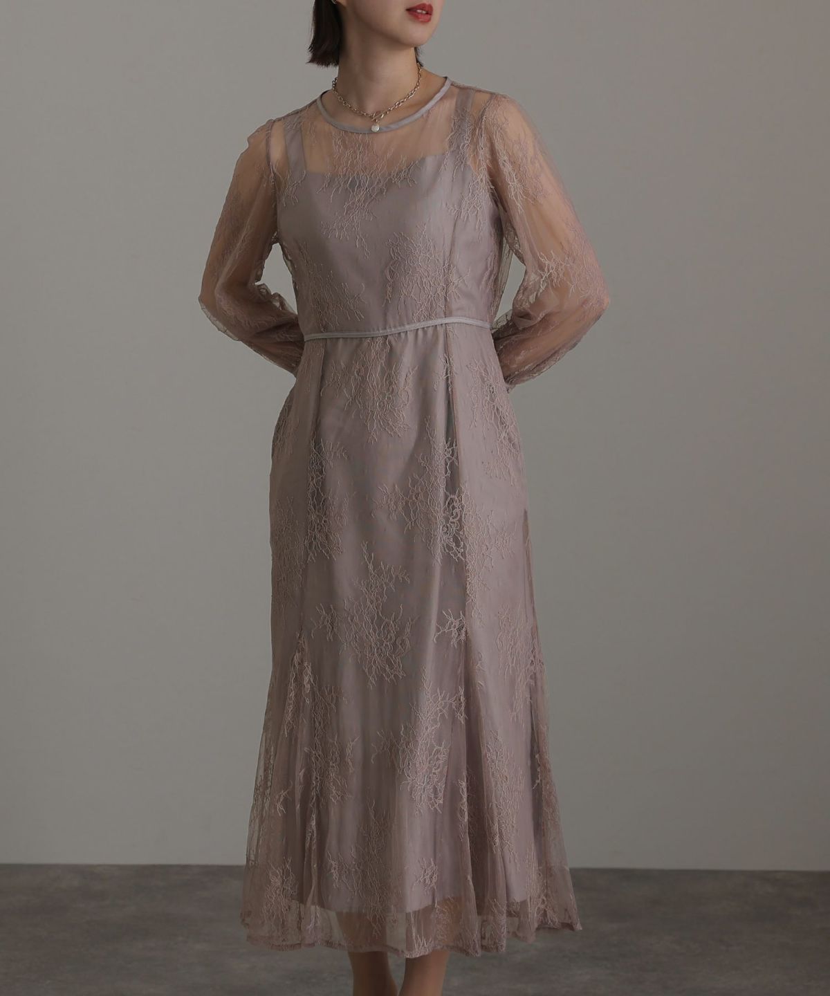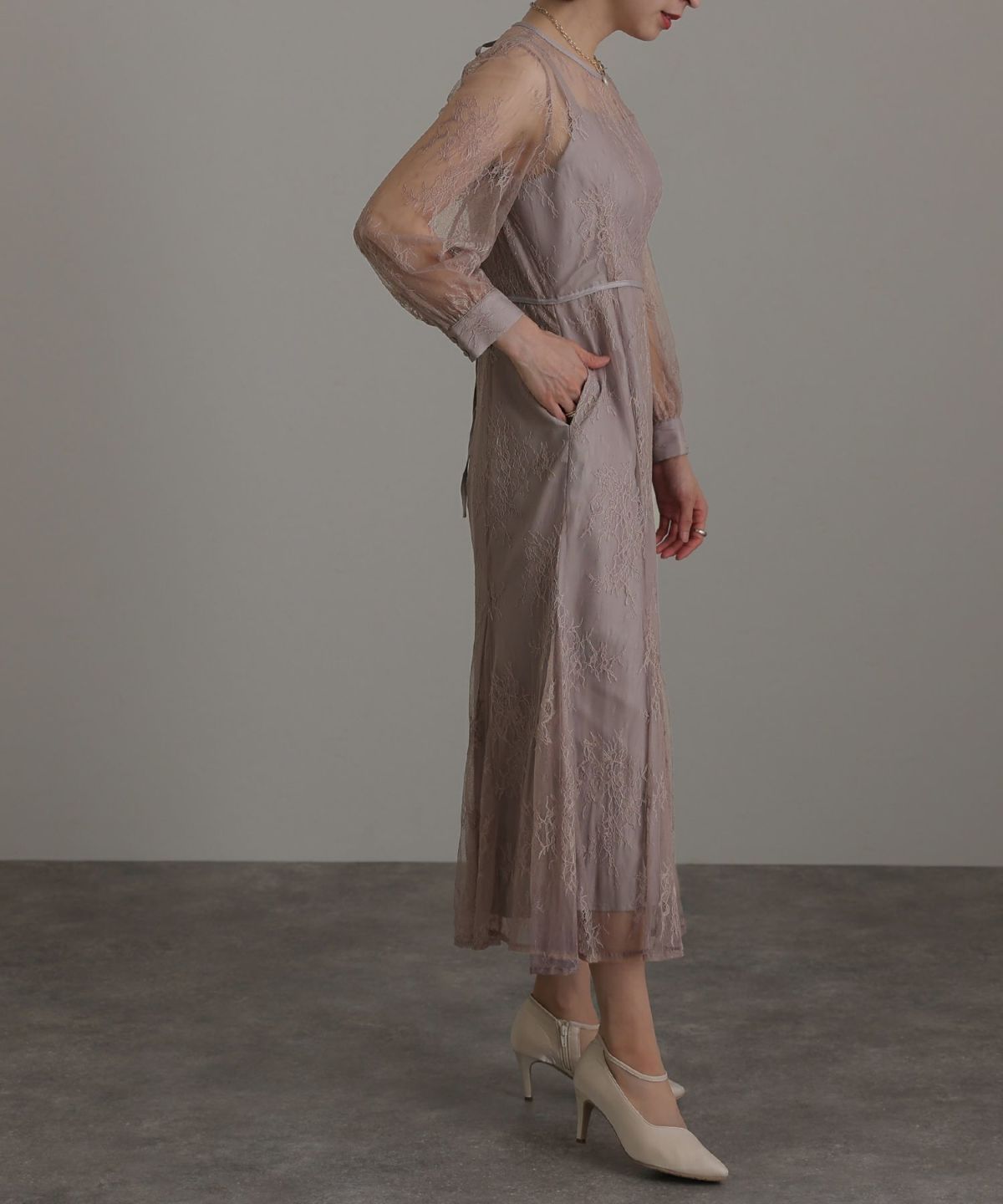 ■上品な総レース仕上げで華やかな印象のドレス膝をカバーしてくれるロング丈で安心。透け感レースが軽やかな印象に。