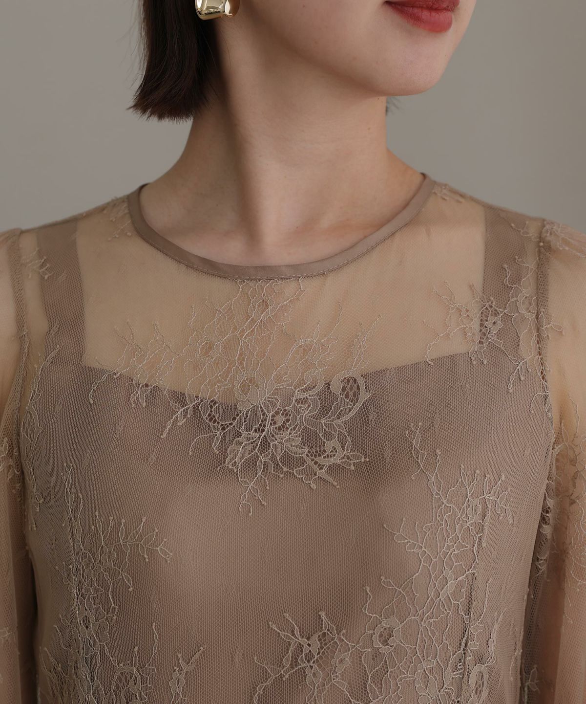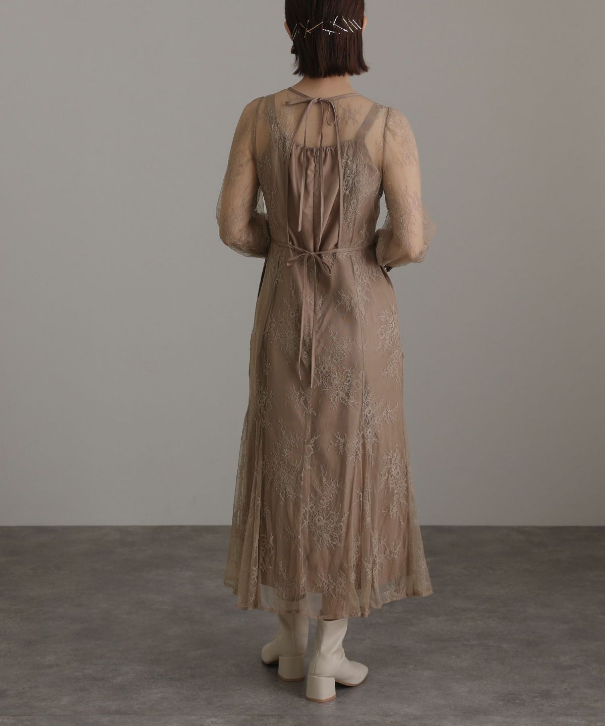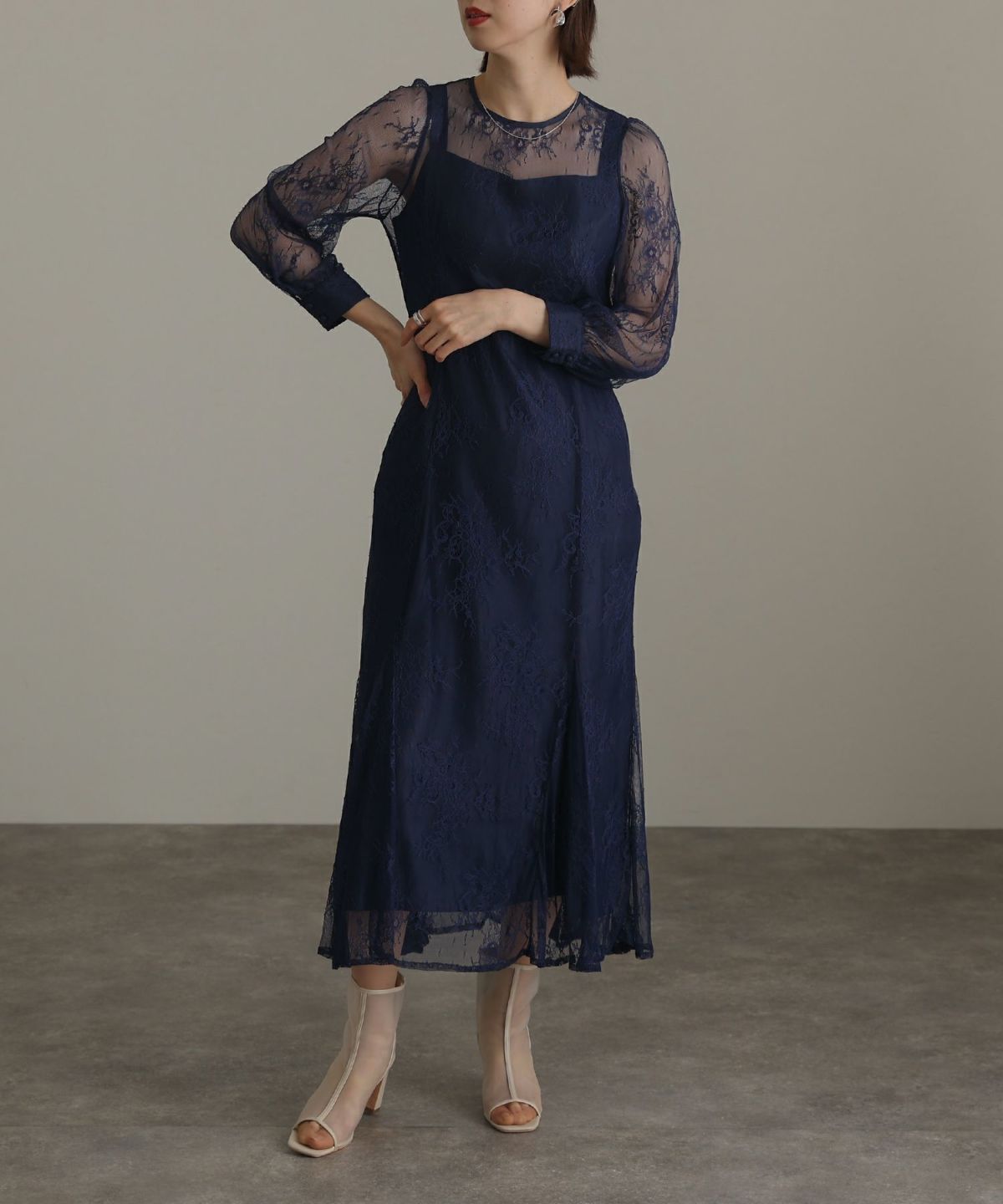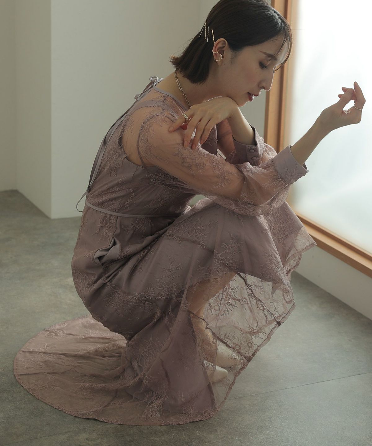 ■上品な総レース仕上げで華やかな印象のドレス膝をカバーしてくれるロング丈で安心。透け感レースが軽やかな印象に。