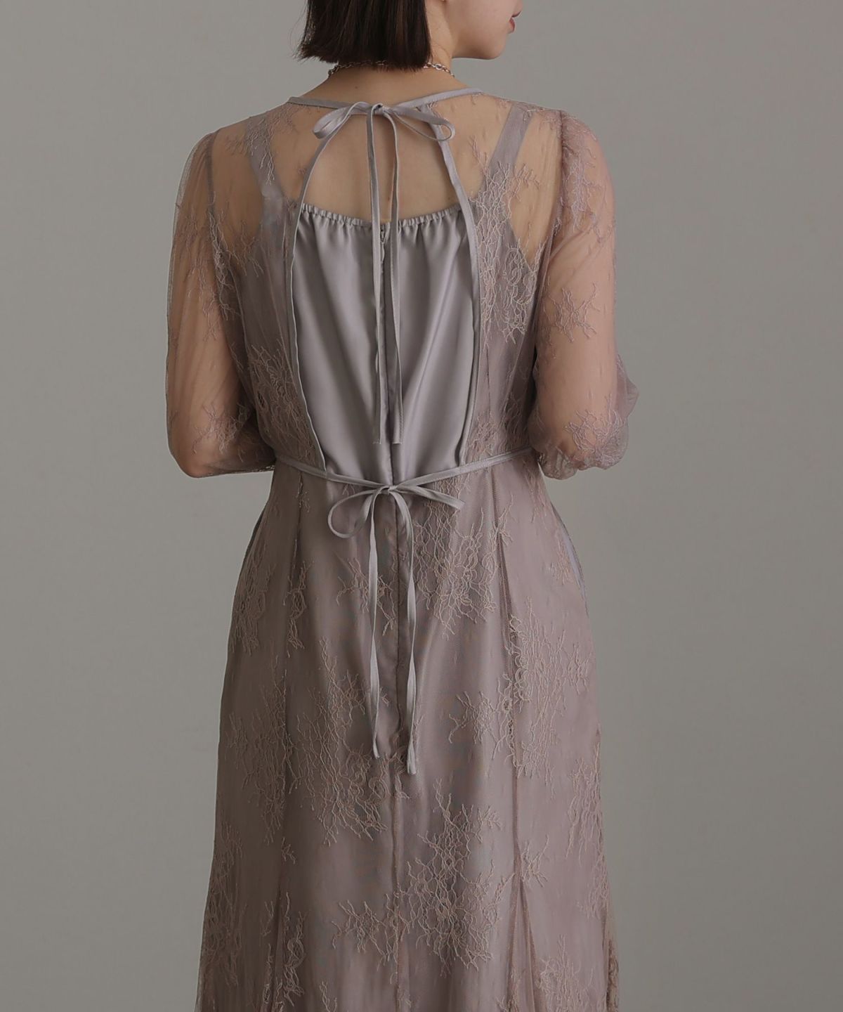 ■バックリボン×総レース露出しすぎない背中あきワンピースで上品なアイテムです。バックスタイルのリボンが上品な中に女性らしさをプラス。繊細な総レースのロングワンピースが煌びやかな雰囲気に。パーティーや結婚式2次会などの華やかなシーンにおすすめのドレスです。