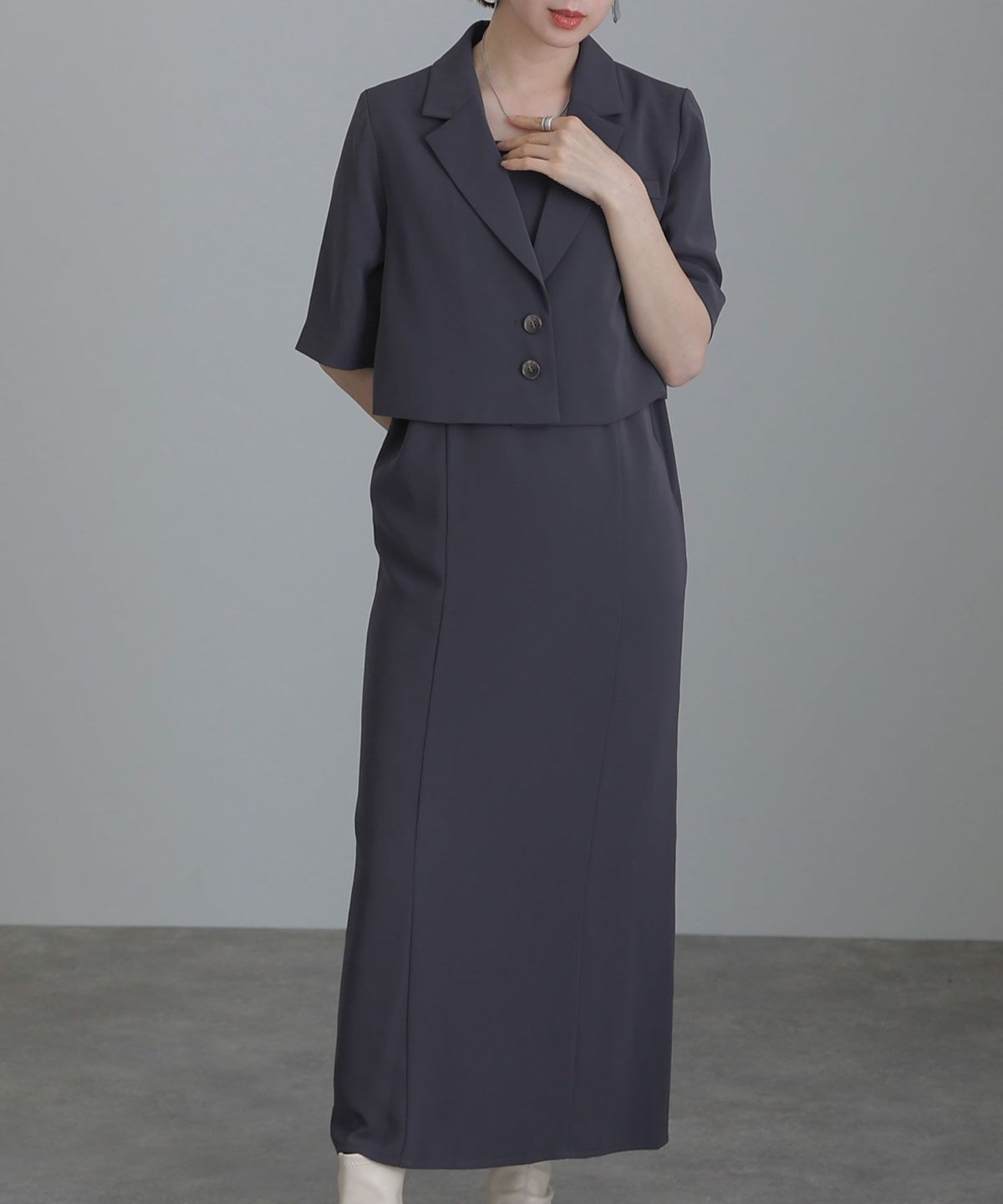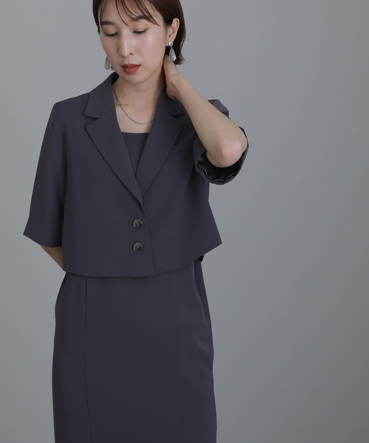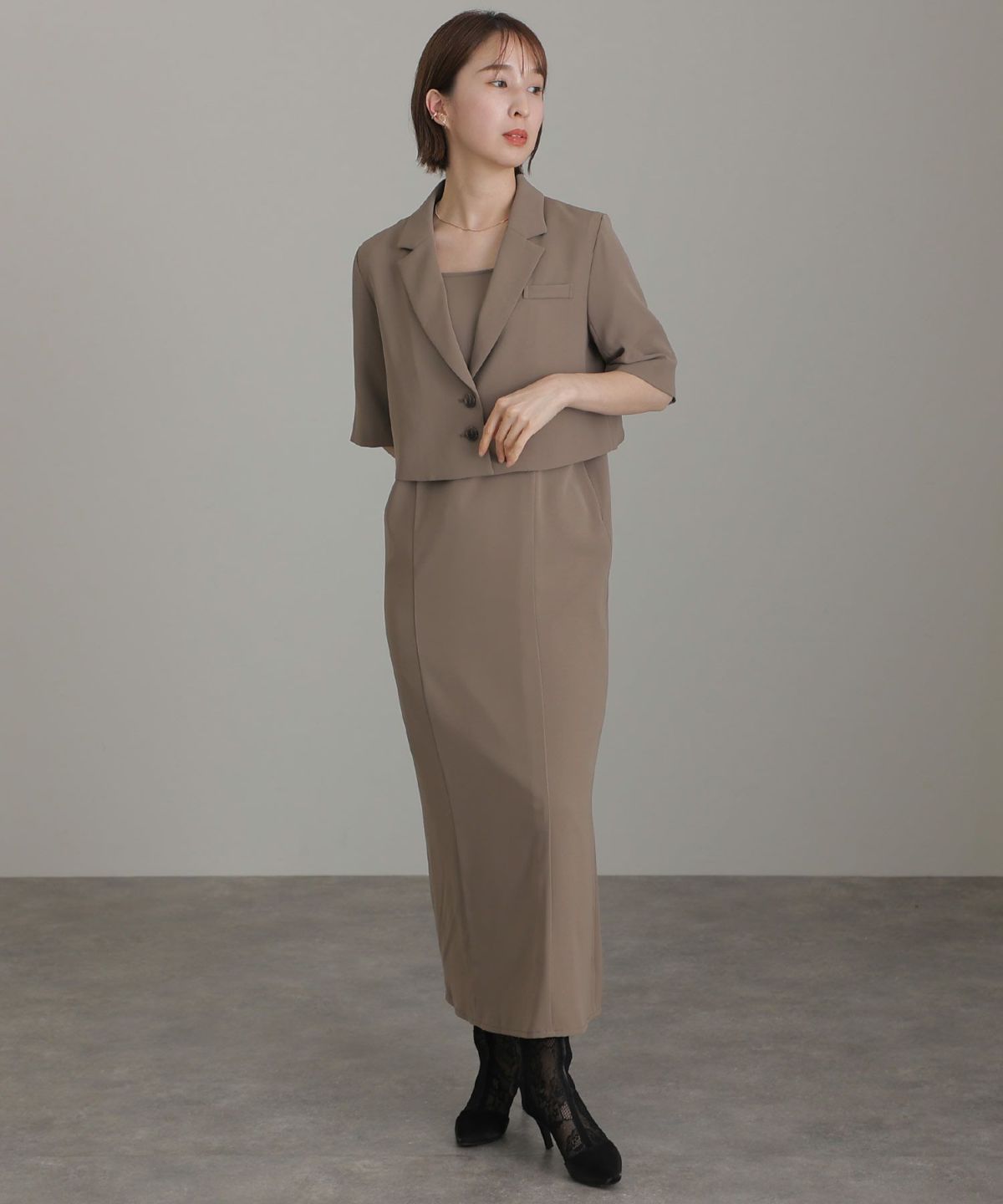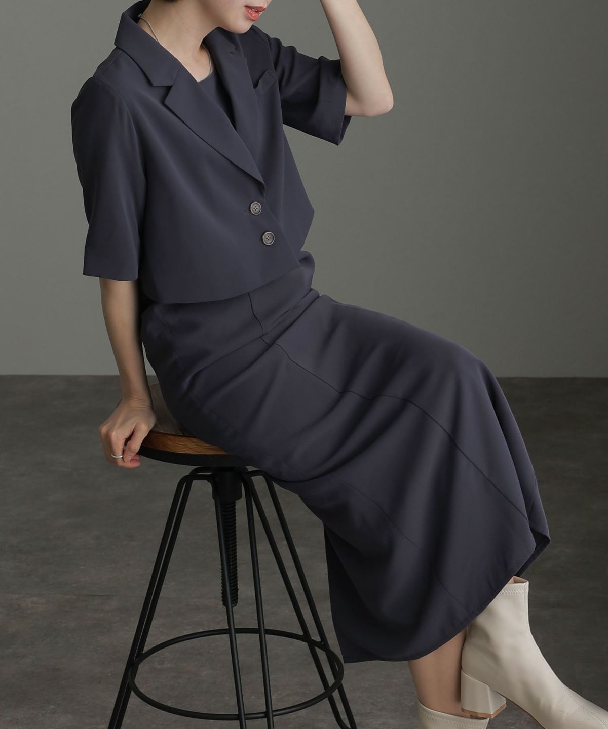 ■ジャケット×ワンピースショート丈ジャケットとタイトシルエットワンピースのセットアップ。シンプルでモードな雰囲気がおしゃれなアイテムです。タイトなワンピースが上品で女性らしい印象に。ワンピースとジャケットを別々に着用できるのでコーデの幅も広がります。