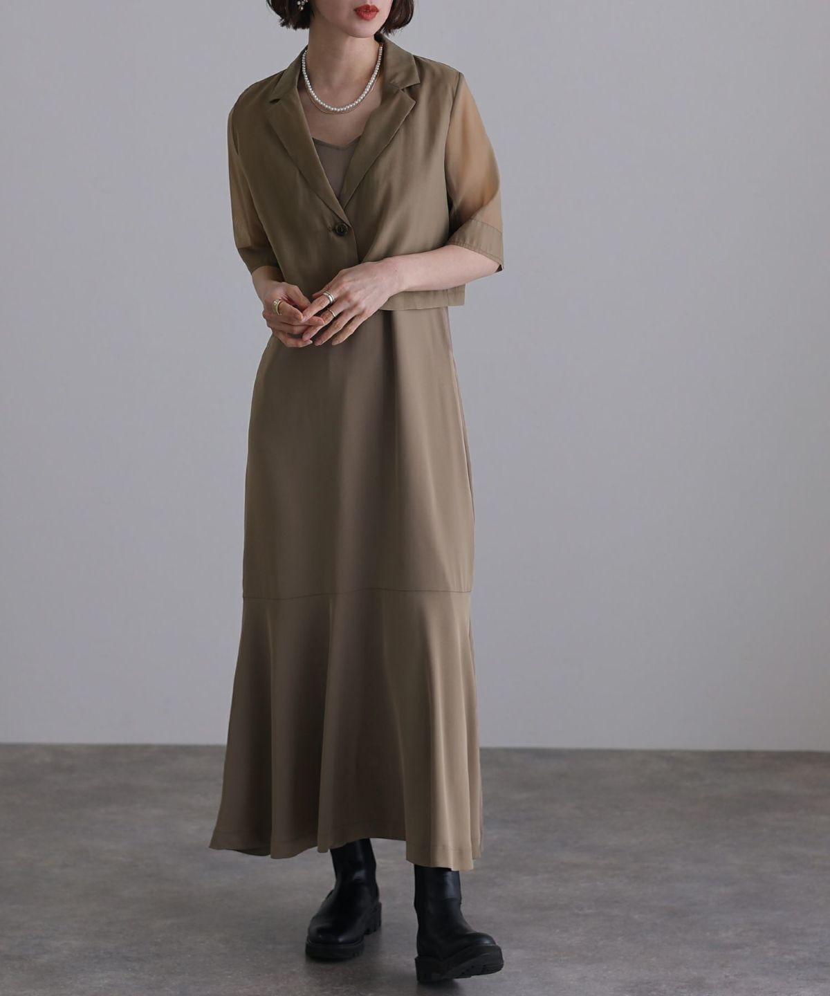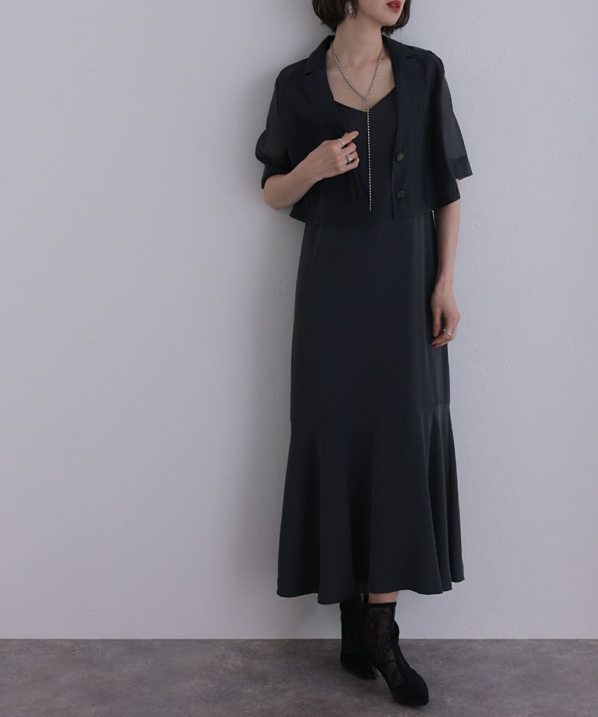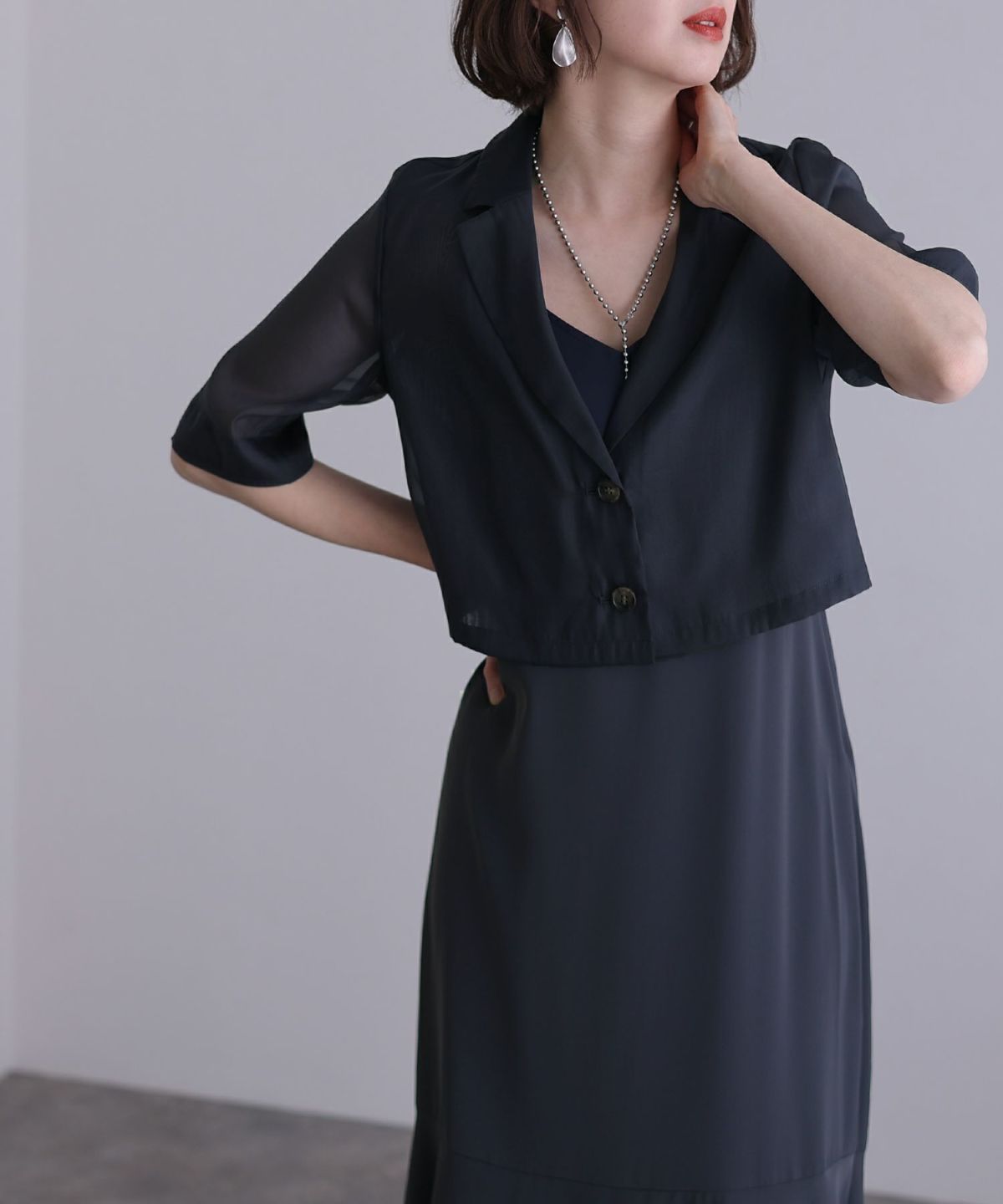■ジャケット×タイトワンピースショート丈ジャケットとタイトシルエットワンピースのセットアップ。首元がスッキリしたショート丈ジャケットがキャミワンピースと相性ピッタリ。ワンピースとジャケットは別々に着用してもコーデしやすいです。オケージョンシーンはもちろんデイリーにも活躍します。