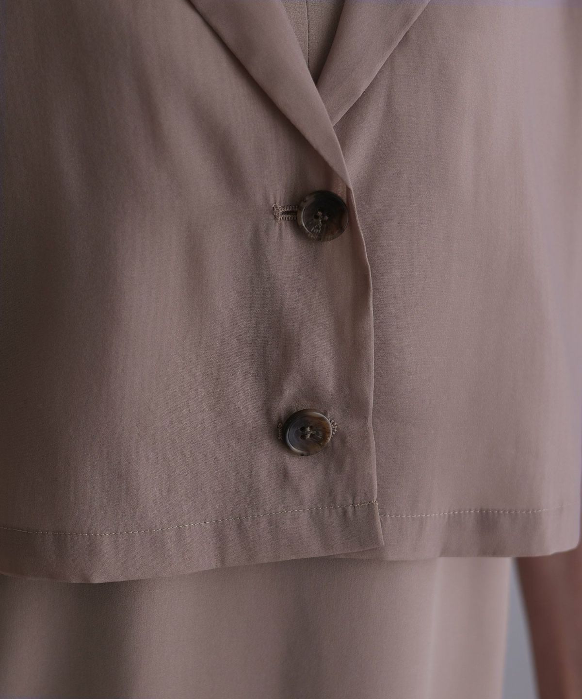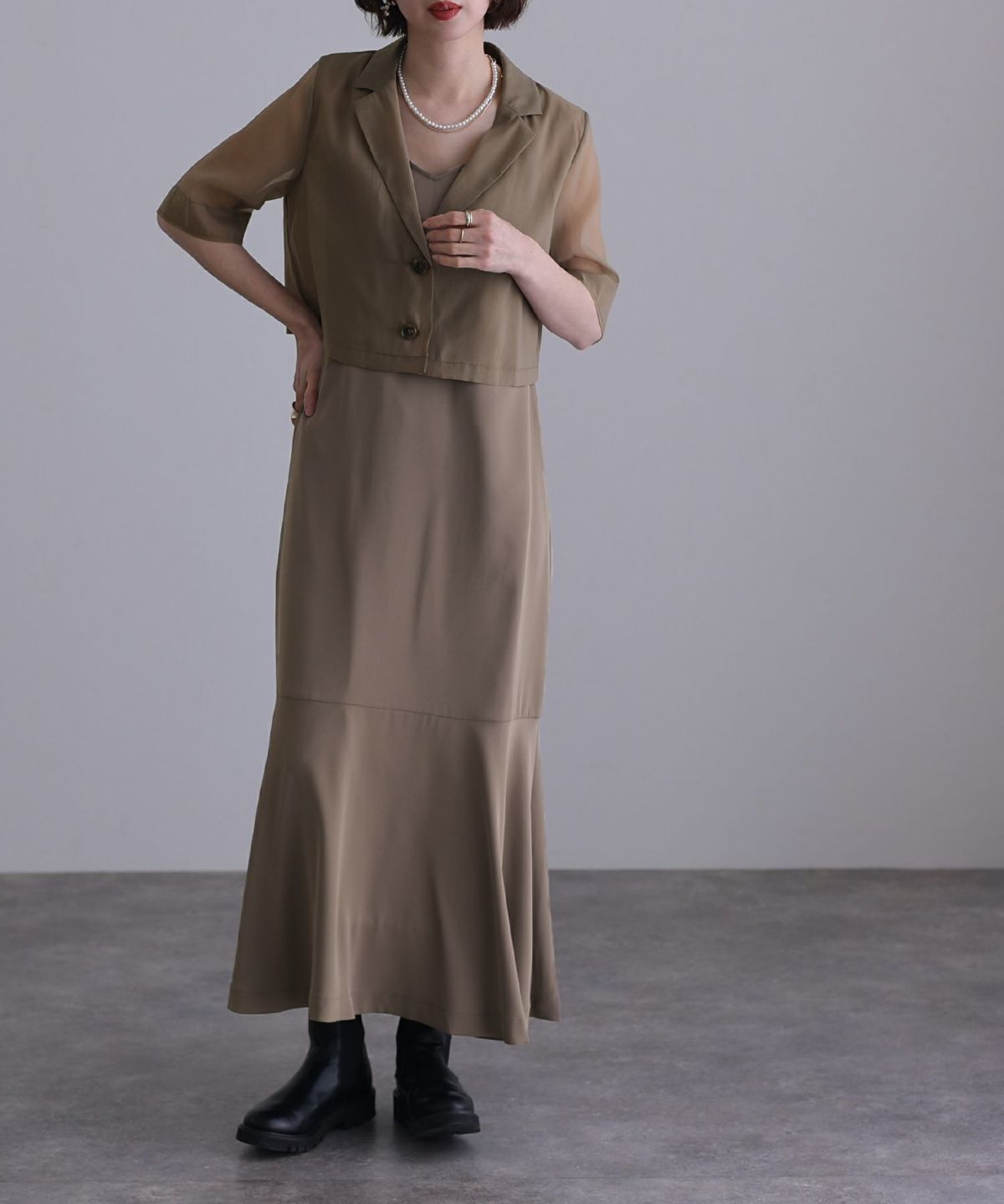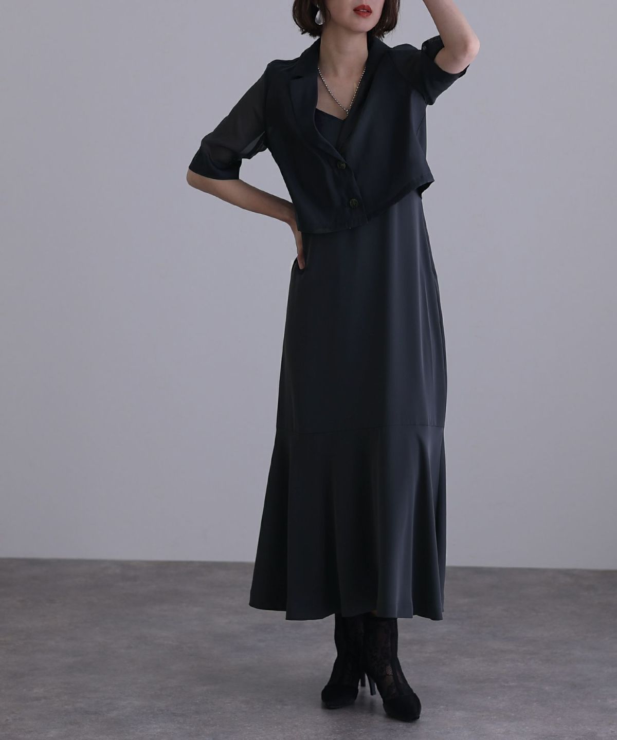 ■ジャケット×タイトワンピースショート丈ジャケットとタイトシルエットワンピースのセットアップ。首元がスッキリしたショート丈ジャケットがキャミワンピースと相性ピッタリ。ワンピースとジャケットは別々に着用してもコーデしやすいです。オケージョンシーンはもちろんデイリーにも活躍します。