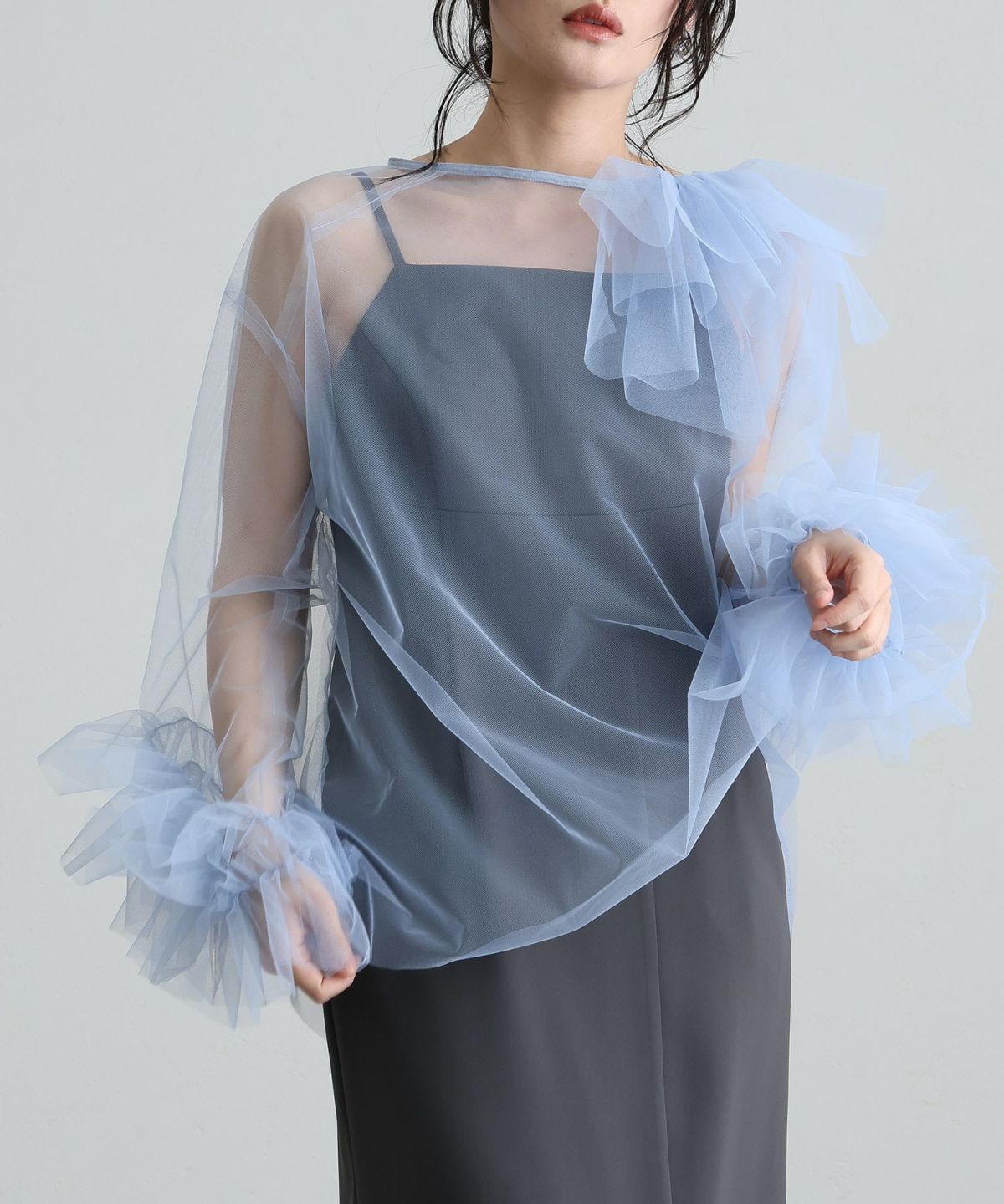 立体感とエアリーさを絶妙に両立させた、チュールフリルトップスとキャミワンピースのセットアイテム。