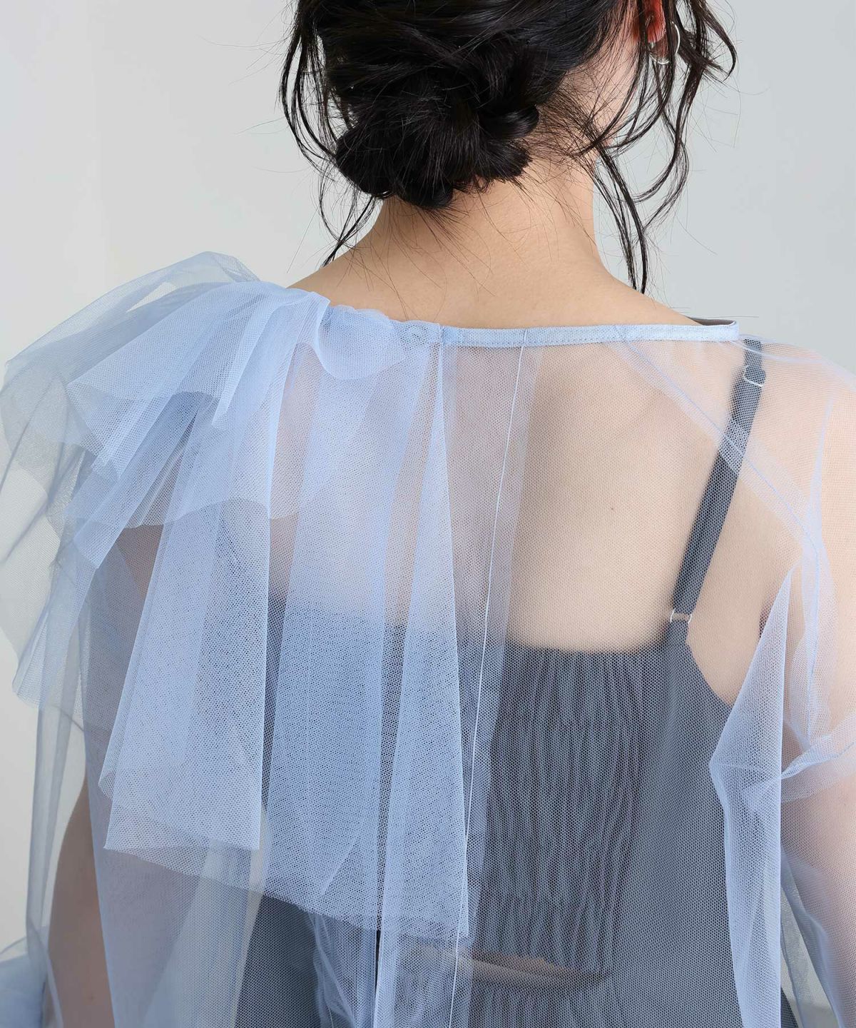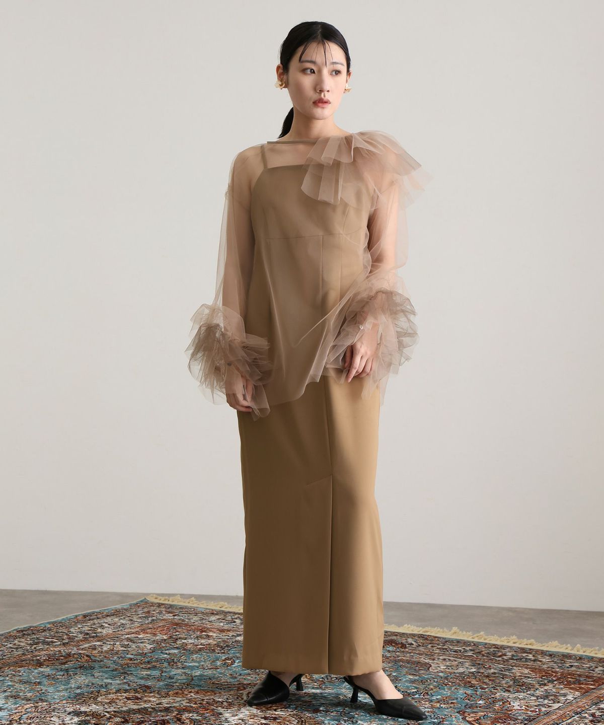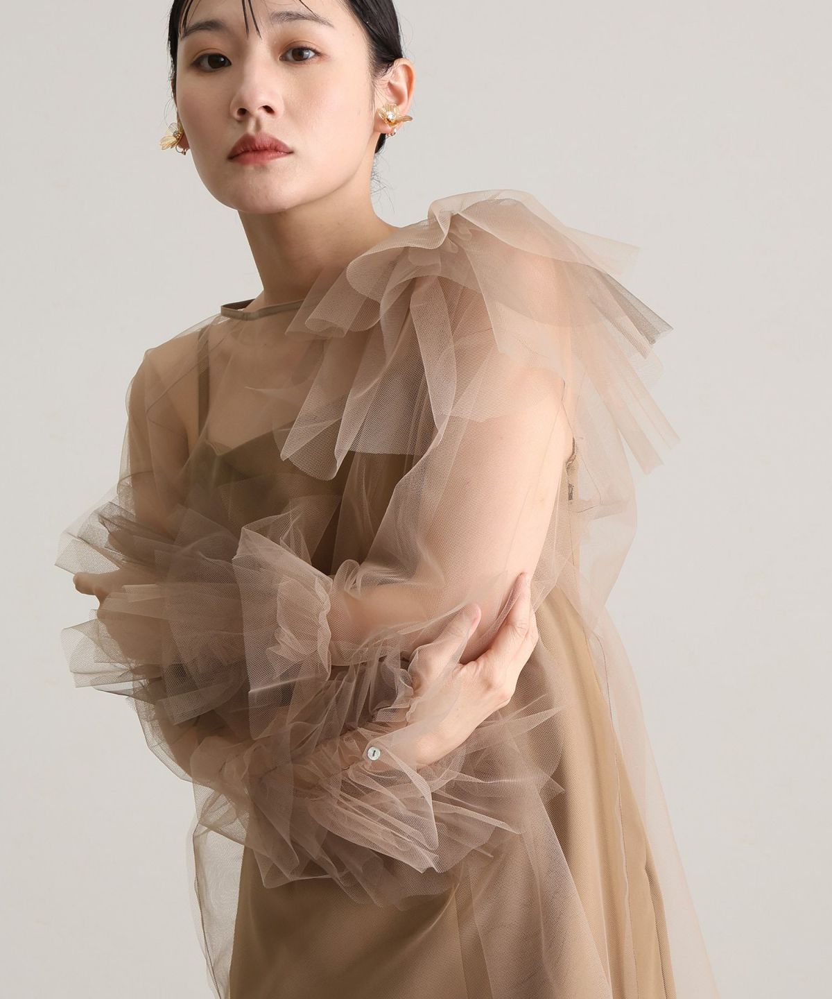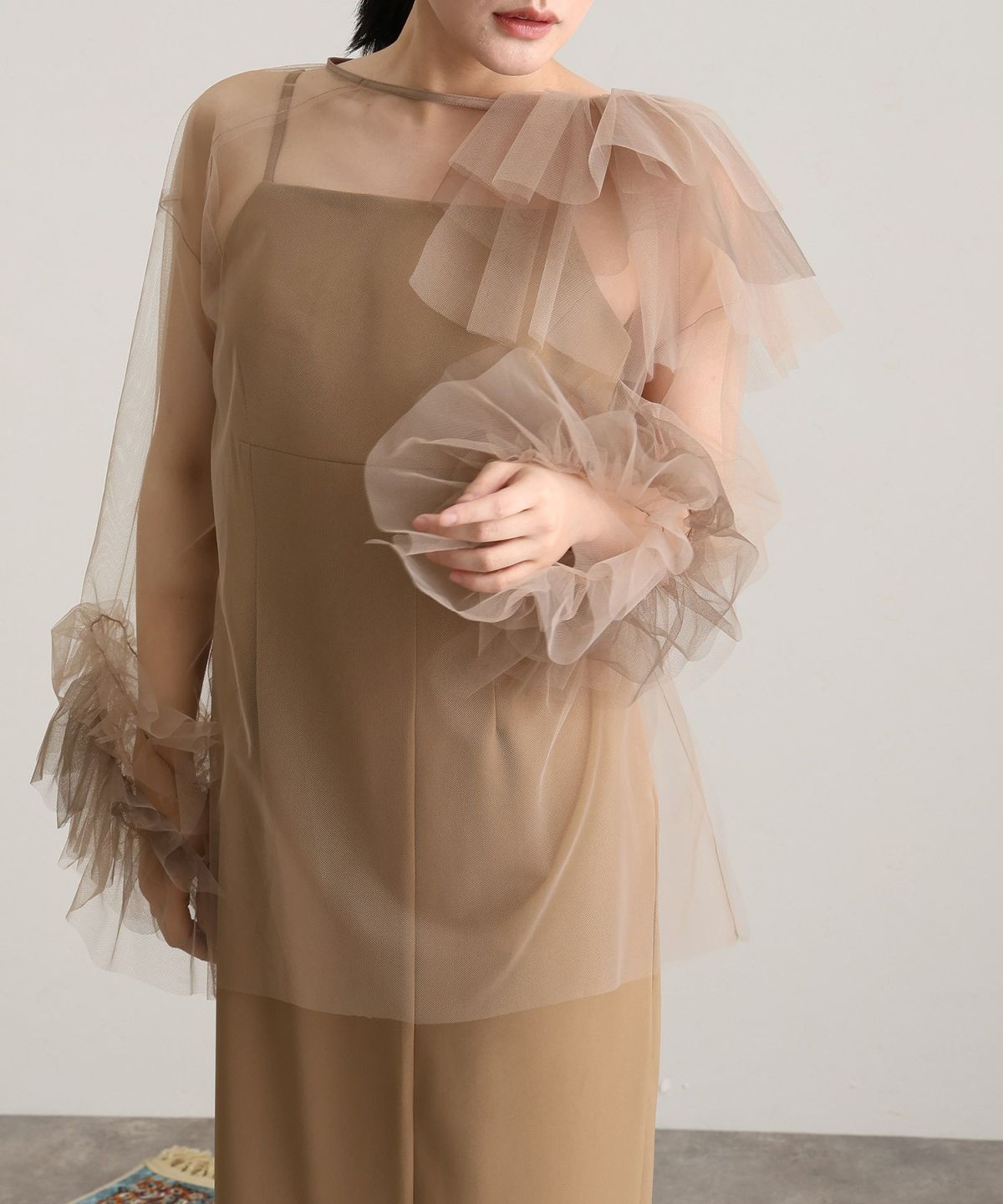 立体感とエアリーさを絶妙に両立させた、チュールフリルトップスとキャミワンピースのセットアイテム。