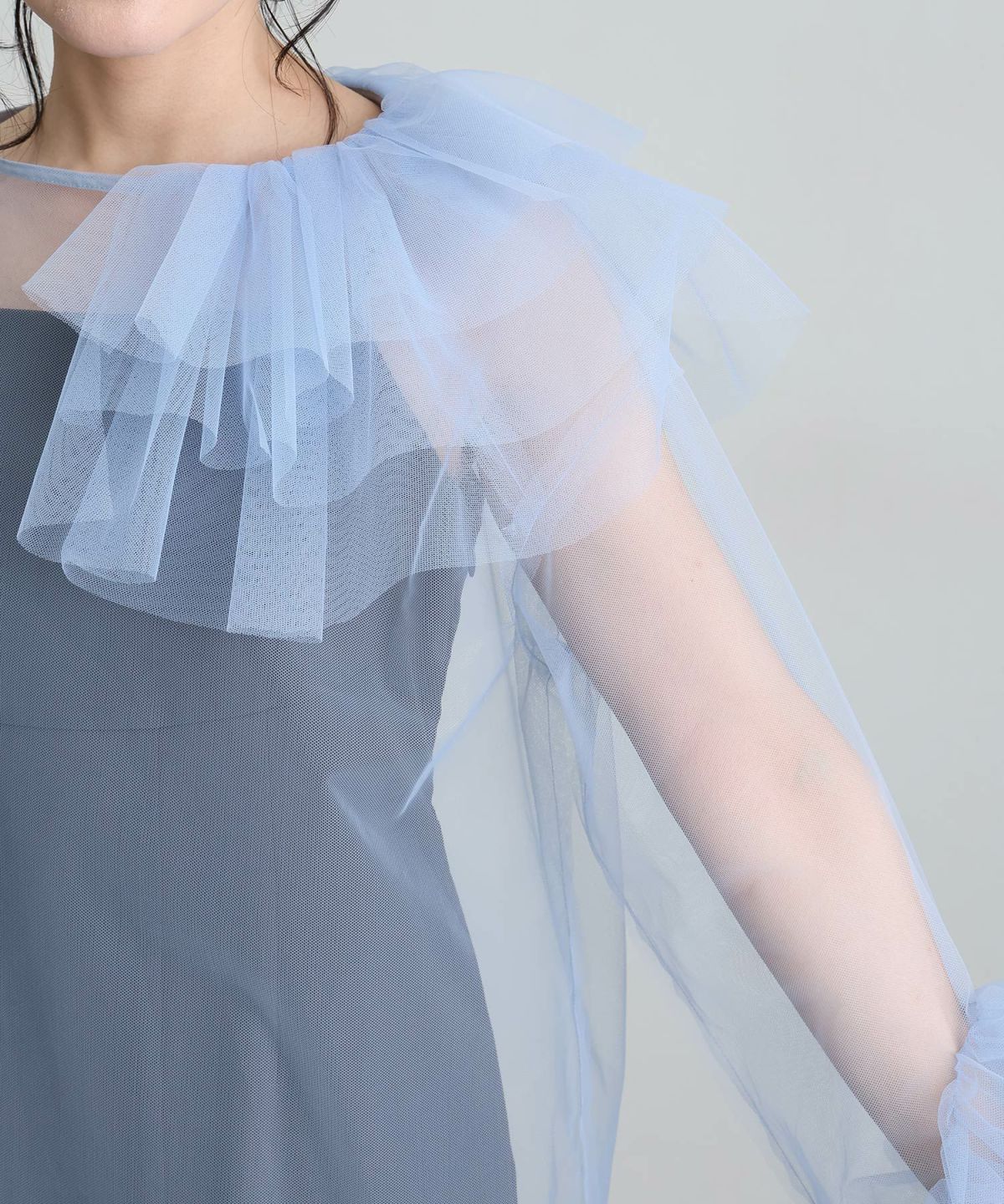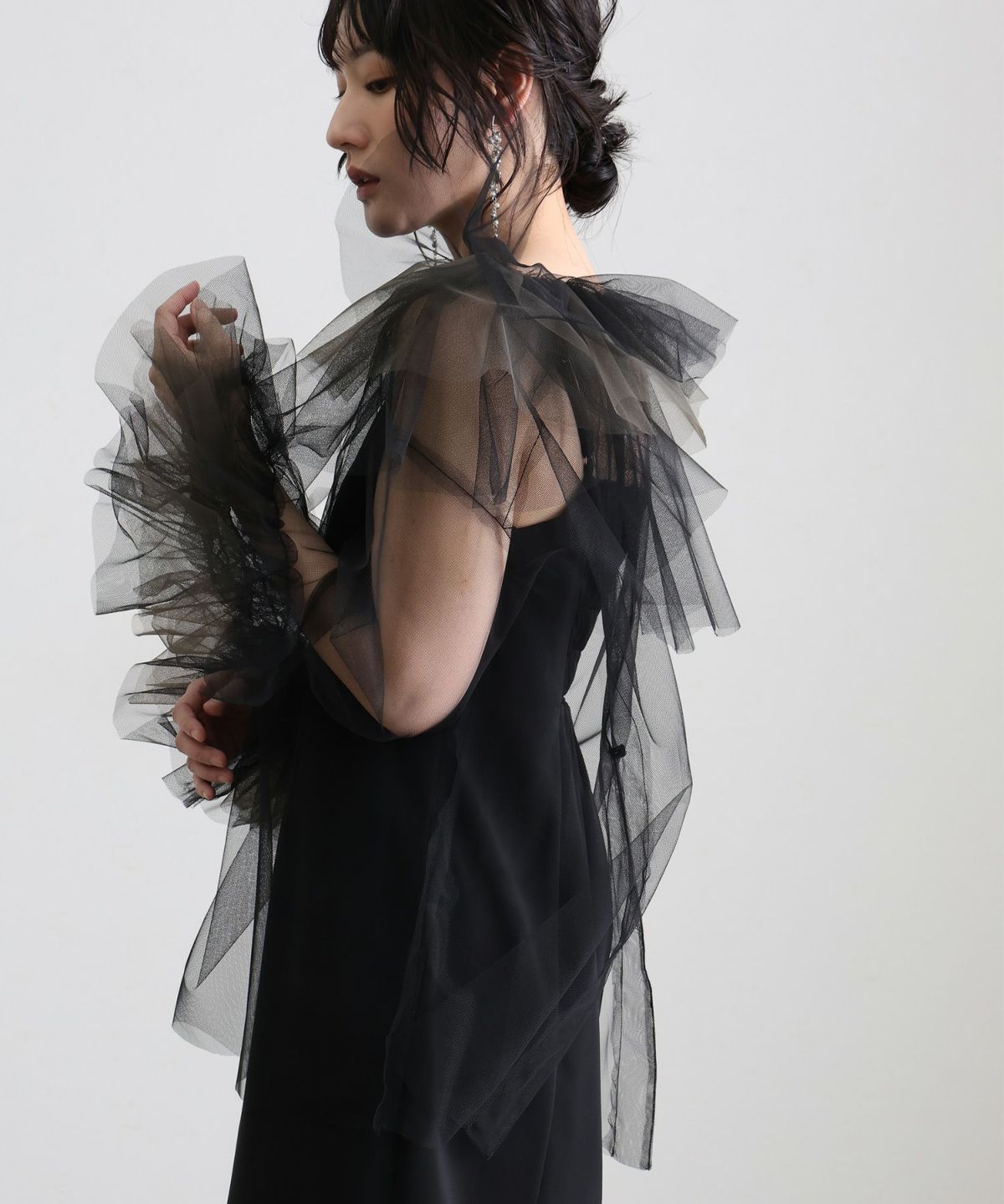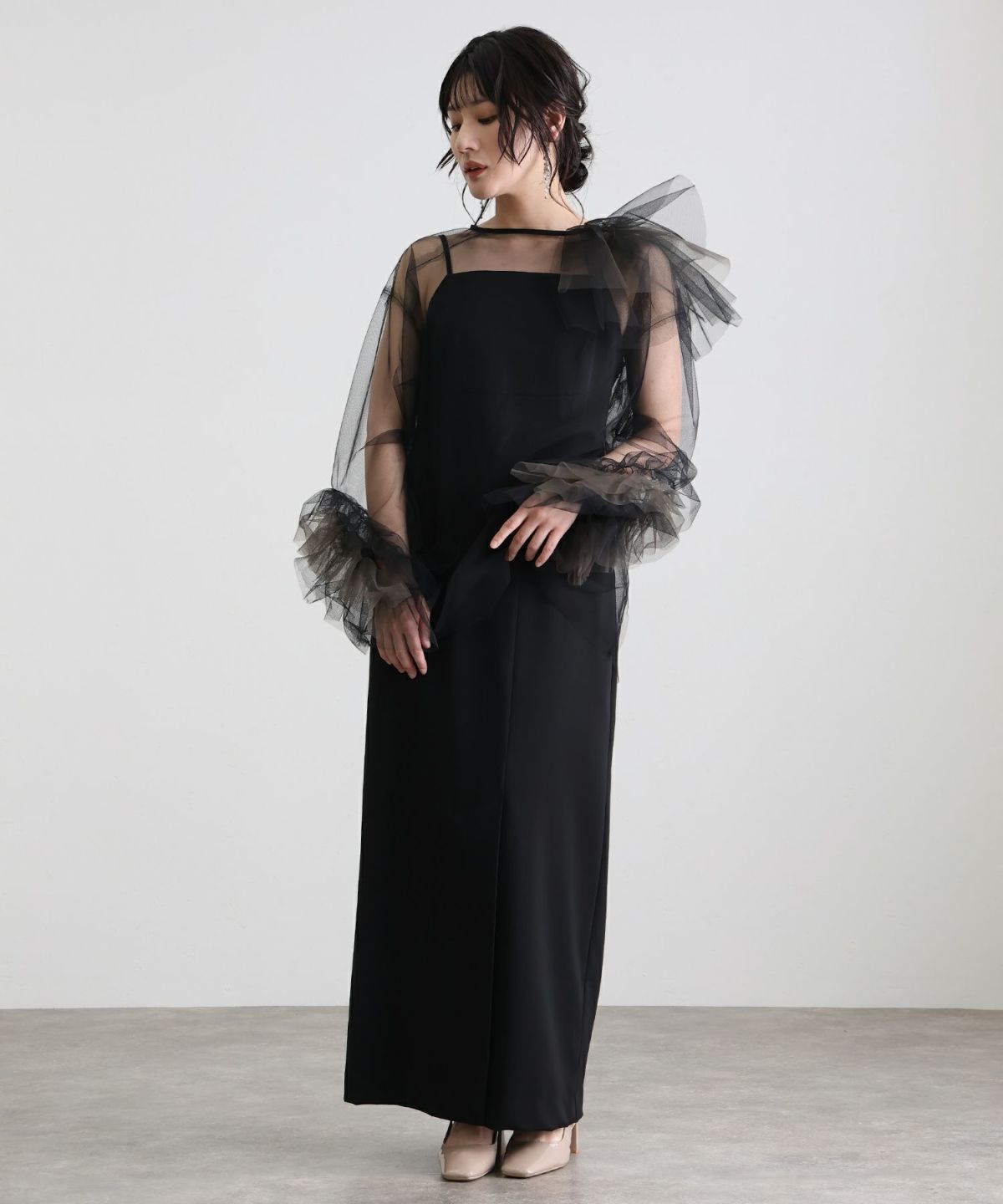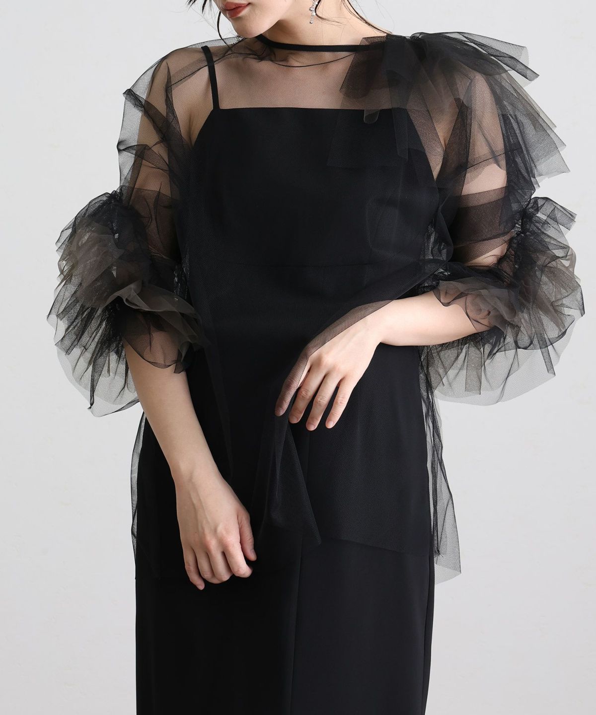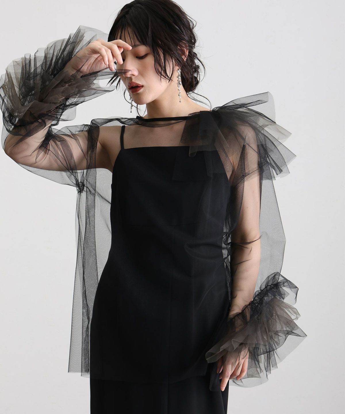 立体感とエアリーさを絶妙に両立させた、チュールフリルトップスとキャミワンピースのセットアイテム。