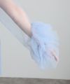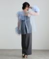 トップスは、アシンメトリーに配した肩のフリルと袖口のフリルが印象的。