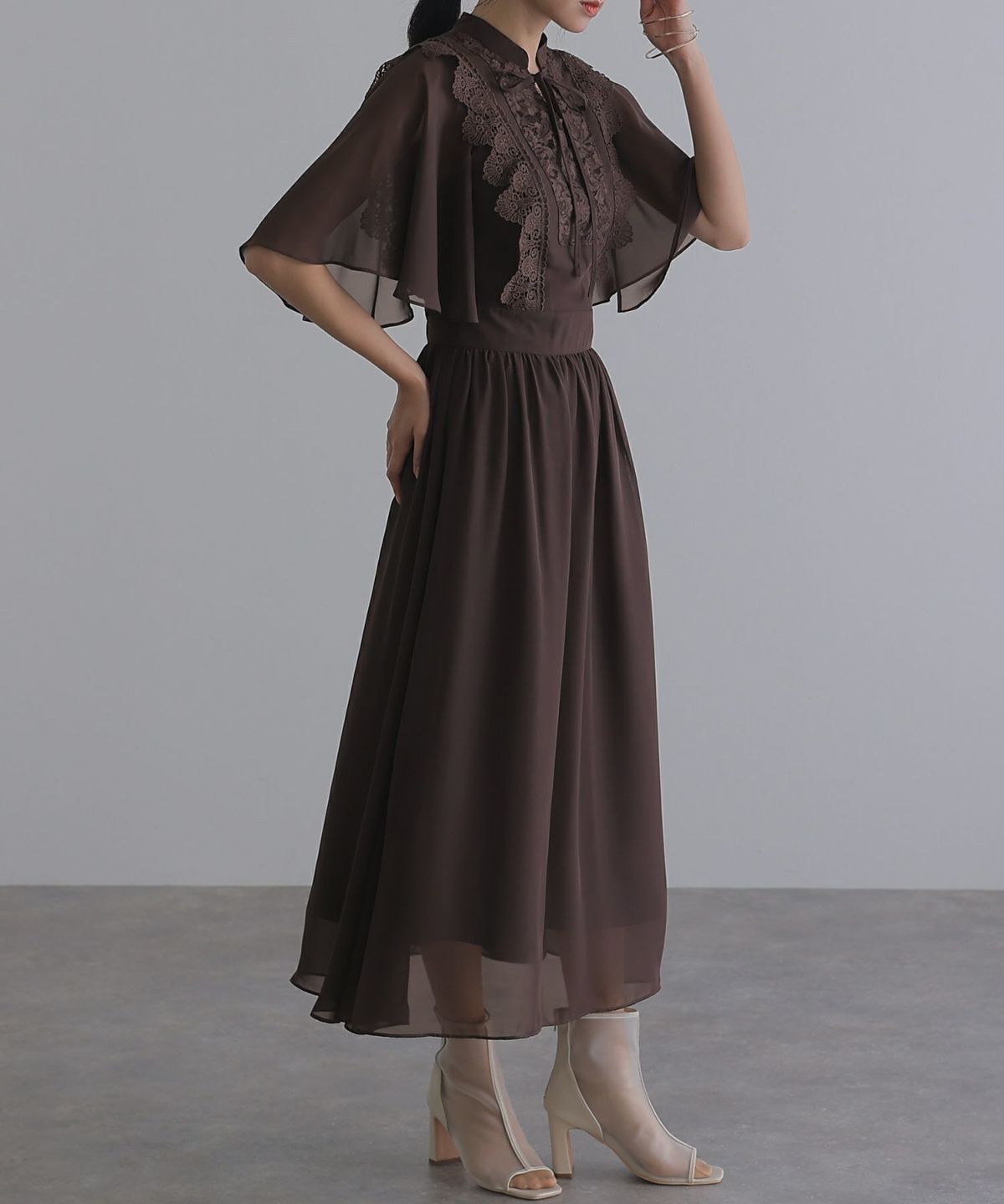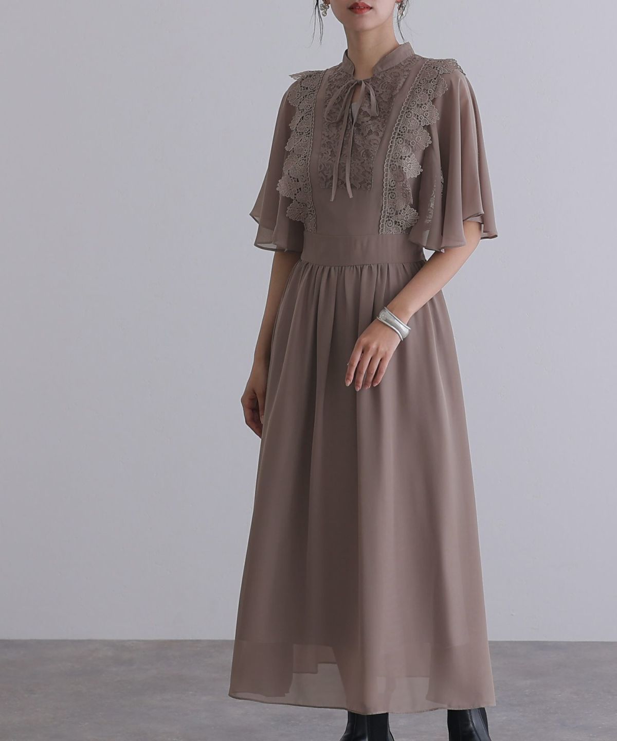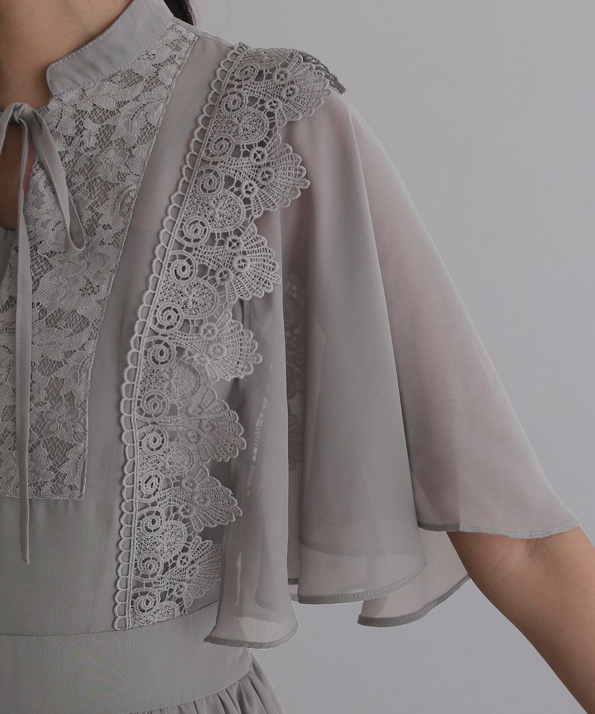 ■ケープカラー×シフォン総シフォンなので着心地も軽やかで裾の広がりも綺麗なドレスです。胸元のリボンでさらに可愛らしさアップ。肩部分のケミカルレースが華やかで、周りと差を付けたい方におすすめ。オケージョンや女子会など様々なシーンでお使いいただけます。