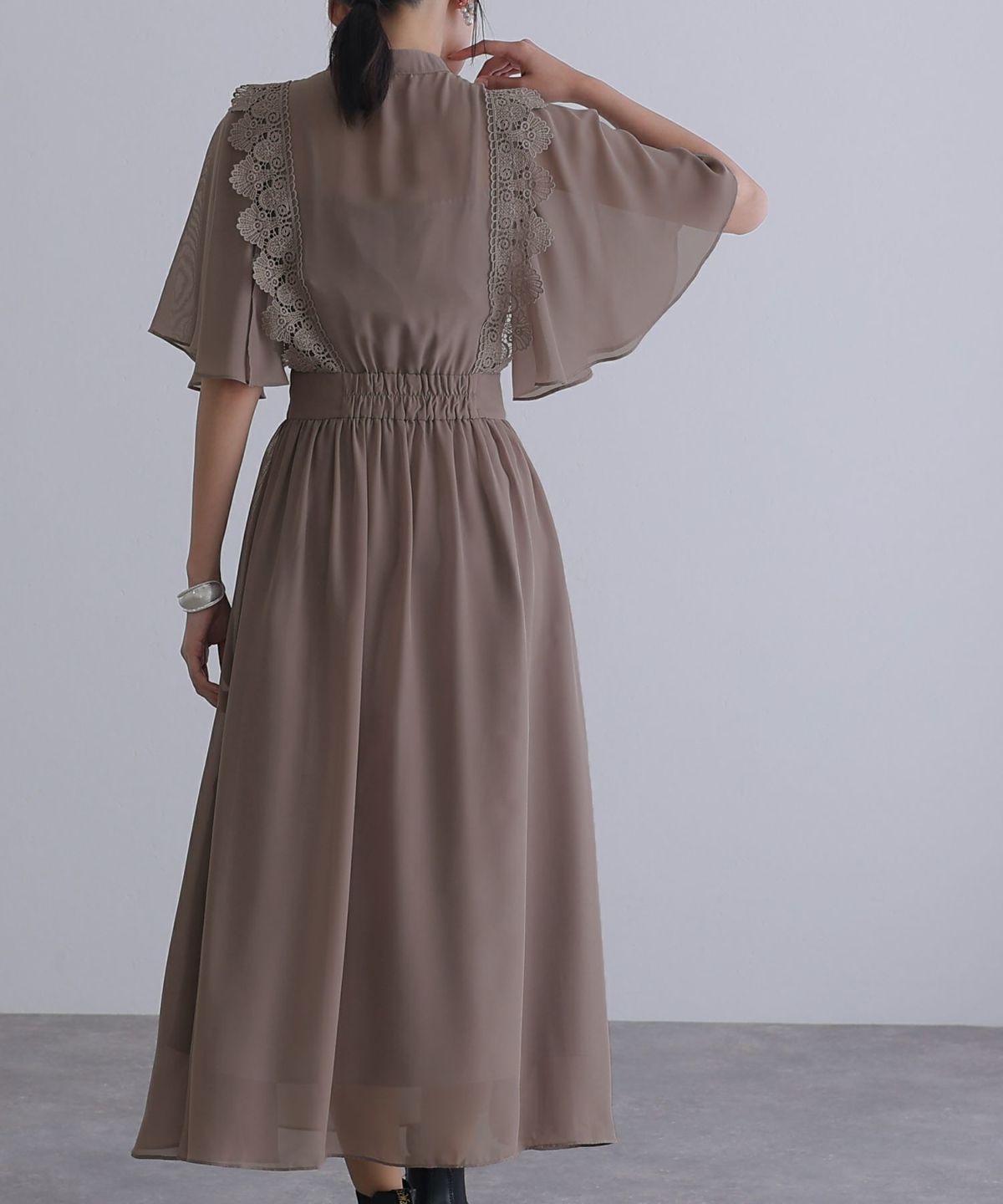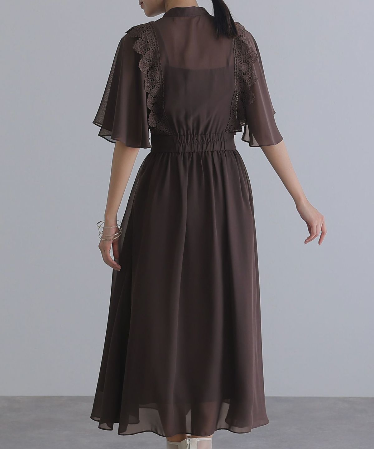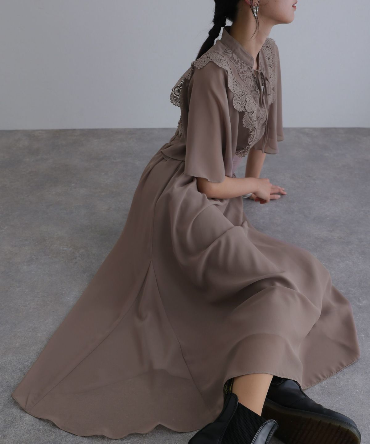 ■ケープカラー×シフォン総シフォンなので着心地も軽やかで裾の広がりも綺麗なドレスです。胸元のリボンでさらに可愛らしさアップ。肩部分のケミカルレースが華やかで、周りと差を付けたい方におすすめ。オケージョンや女子会など様々なシーンでお使いいただけます。