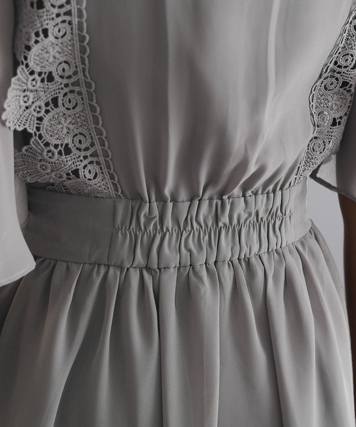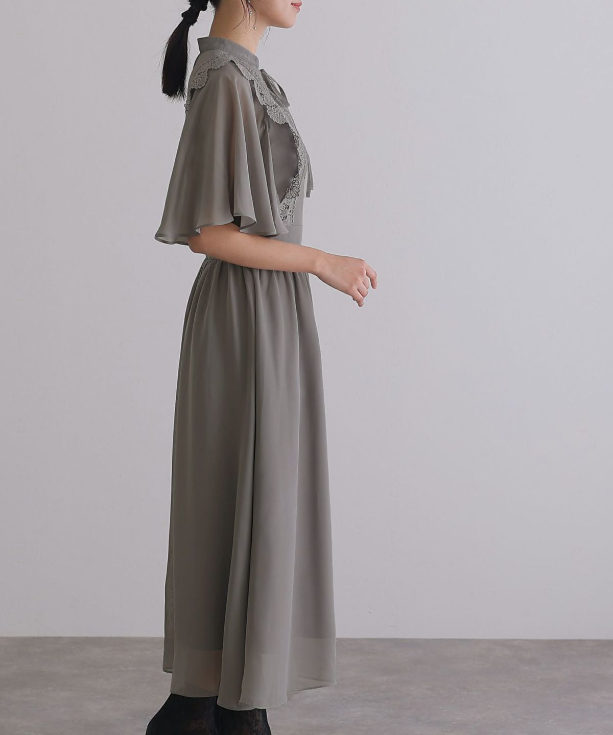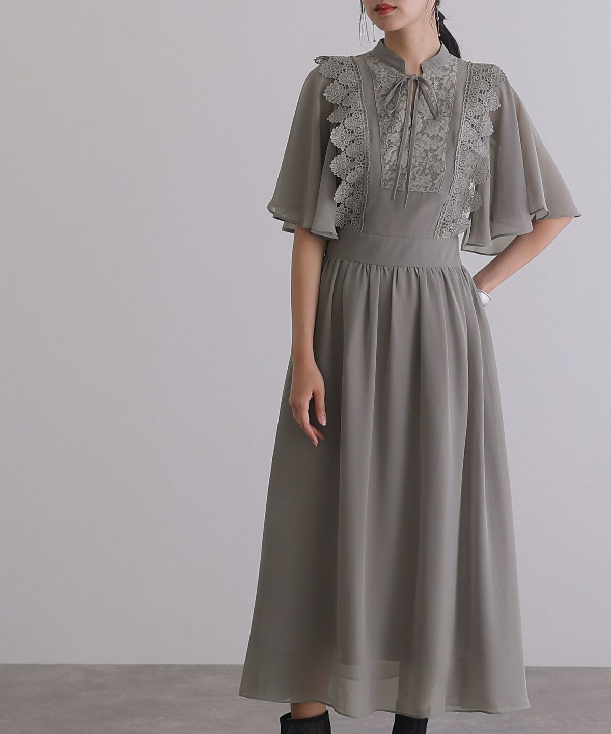 ■ケープカラー×シフォン総シフォンなので着心地も軽やかで裾の広がりも綺麗なドレスです。胸元のリボンでさらに可愛らしさアップ。肩部分のケミカルレースが華やかで、周りと差を付けたい方におすすめ。オケージョンや女子会など様々なシーンでお使いいただけます。