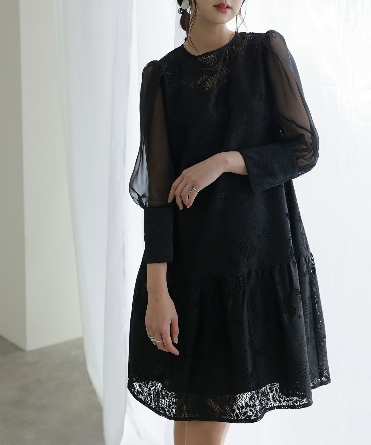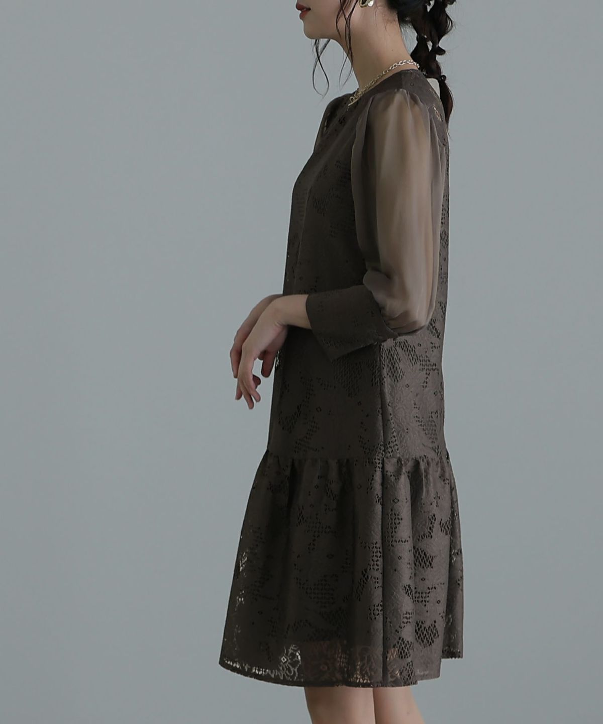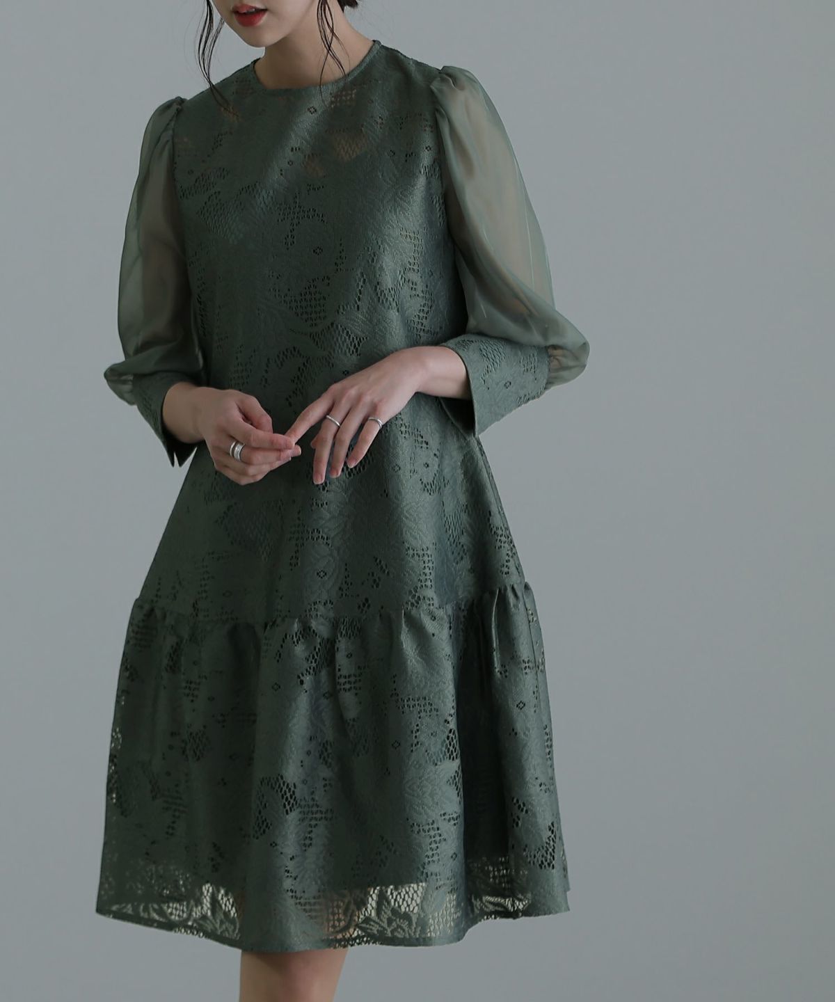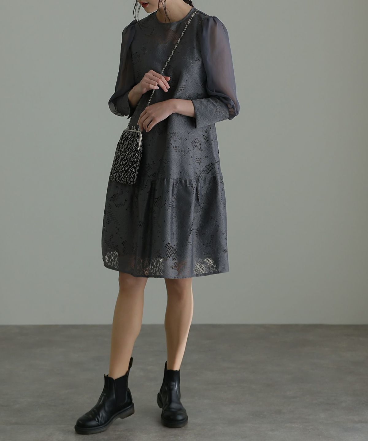 ■オーガンジー×レース膝丈のワンティアードワンピースです。落ち着いた柄のレースで年齢問わず着ていただけます。適度な透け感と上品なレースが大人女性向けなデザイン。オケージョンはもちろん、女子会やデートにもおすすめです。