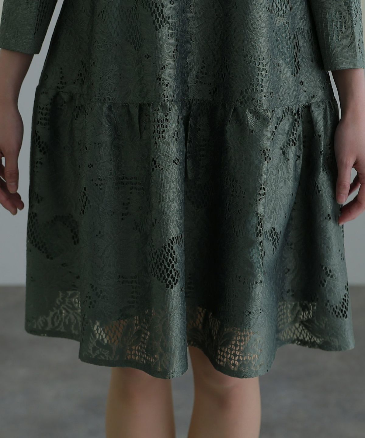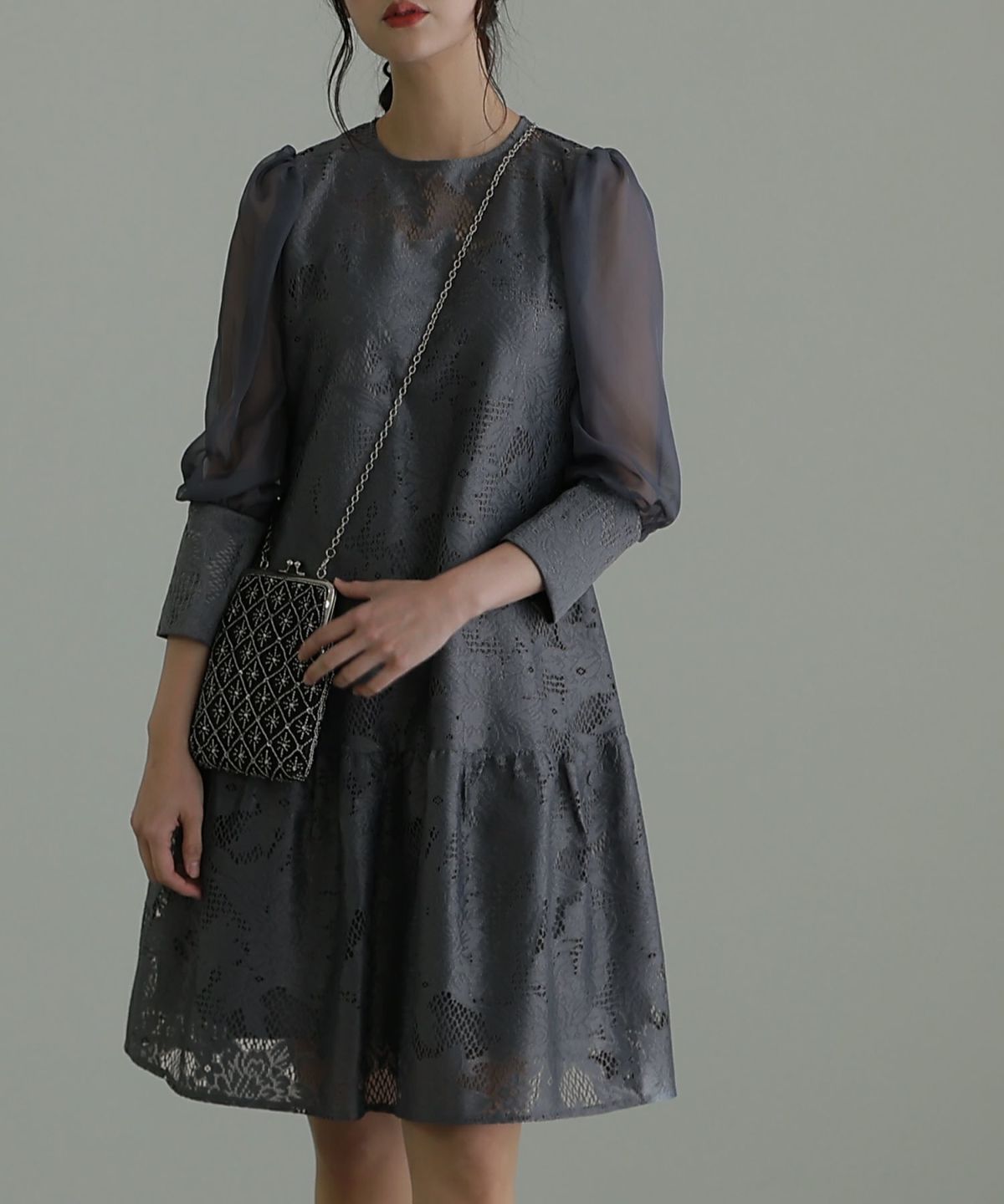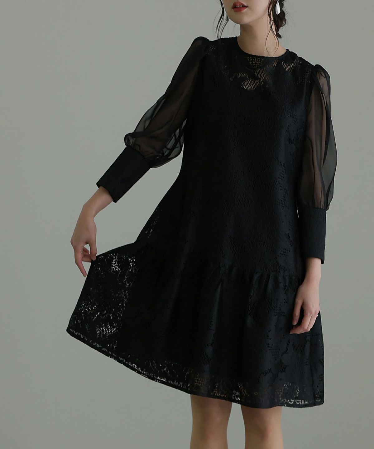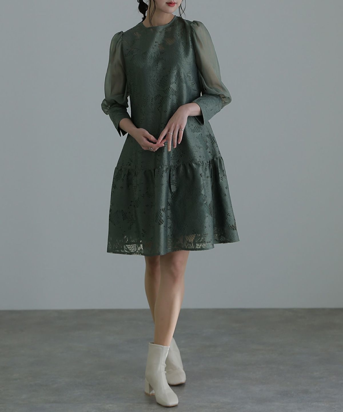 ■オーガンジー×レース膝丈のワンティアードワンピースです。落ち着いた柄のレースで年齢問わず着ていただけます。適度な透け感と上品なレースが大人女性向けなデザイン。オケージョンはもちろん、女子会やデートにもおすすめです。