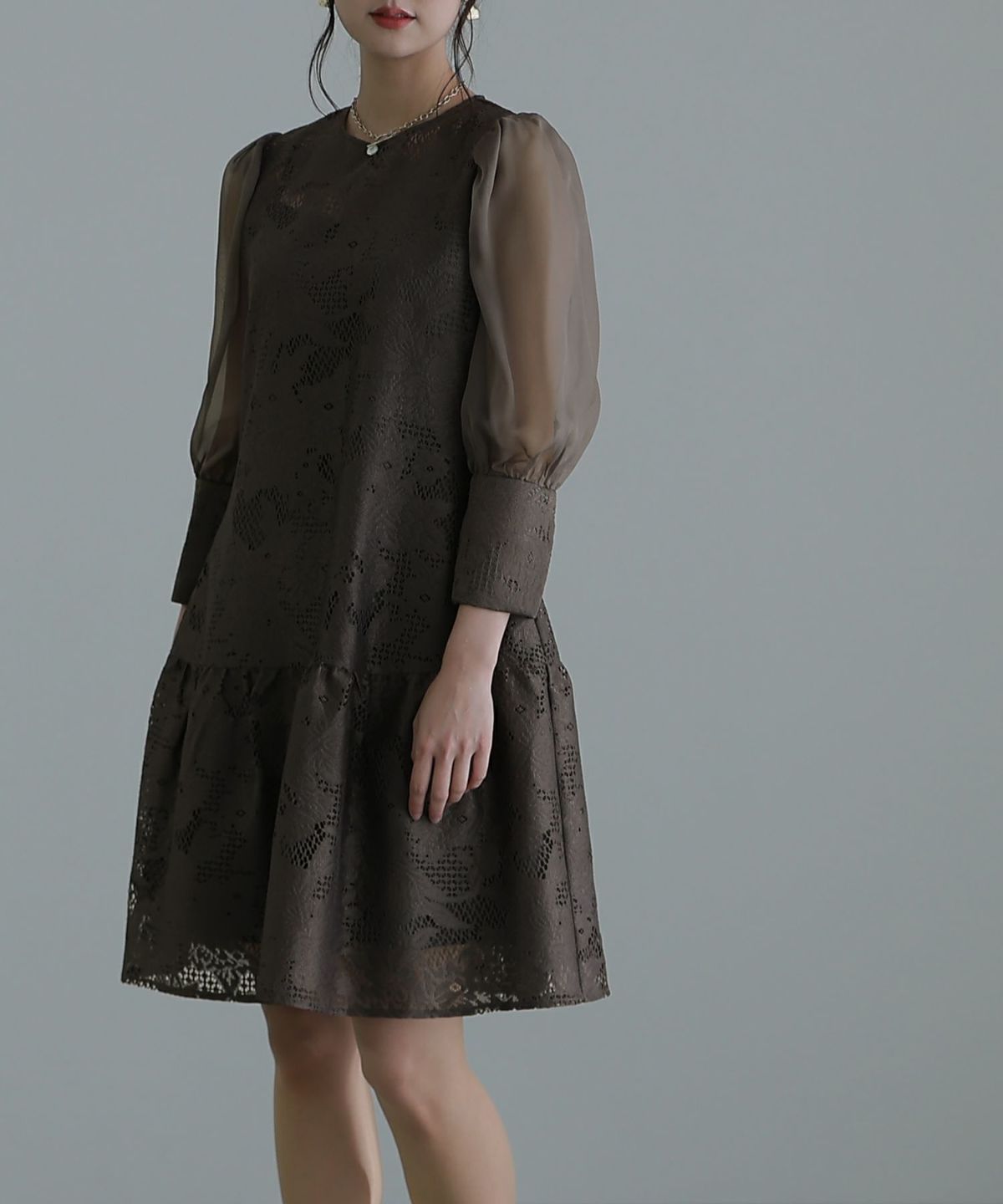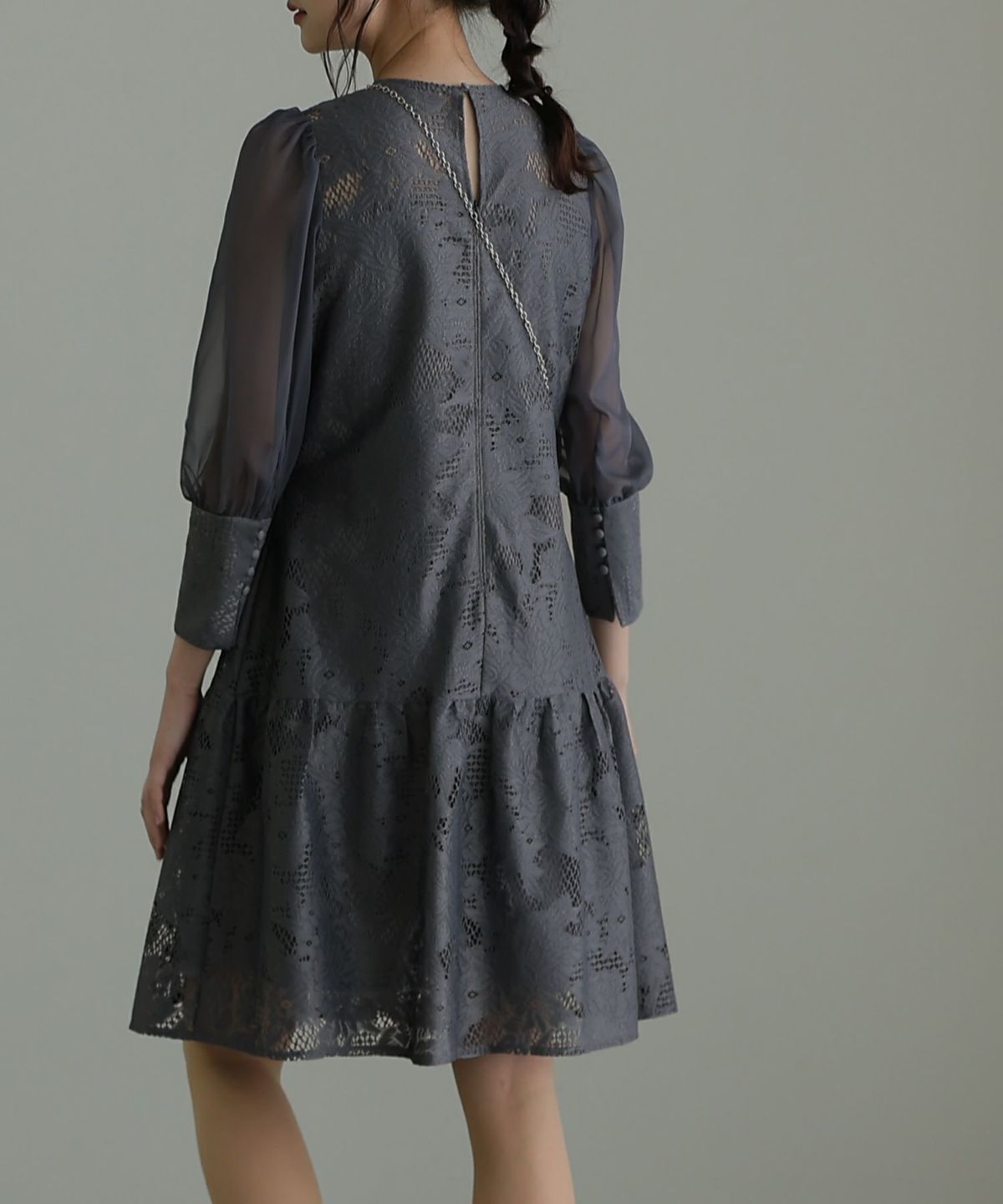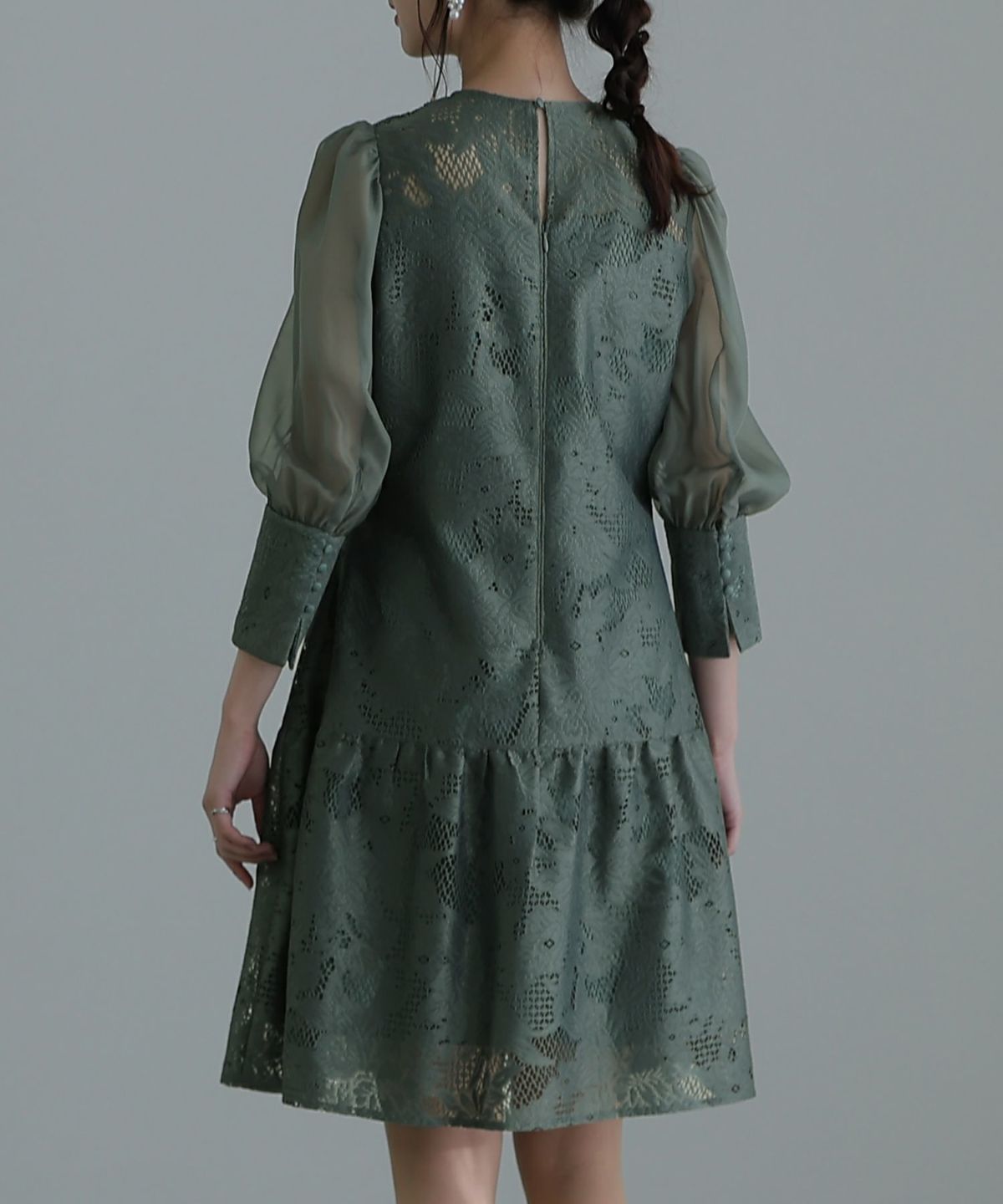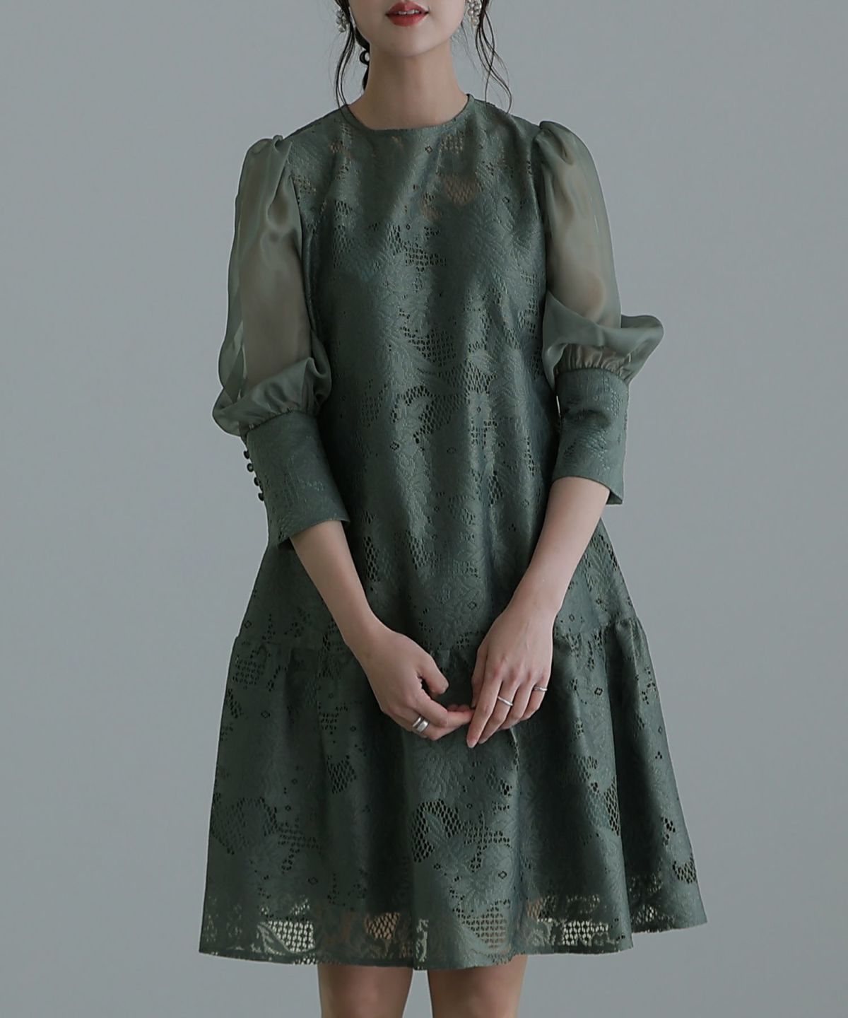 ■オーガンジー×レース膝丈のワンティアードワンピースです。落ち着いた柄のレースで年齢問わず着ていただけます。適度な透け感と上品なレースが大人女性向けなデザイン。オケージョンはもちろん、女子会やデートにもおすすめです。