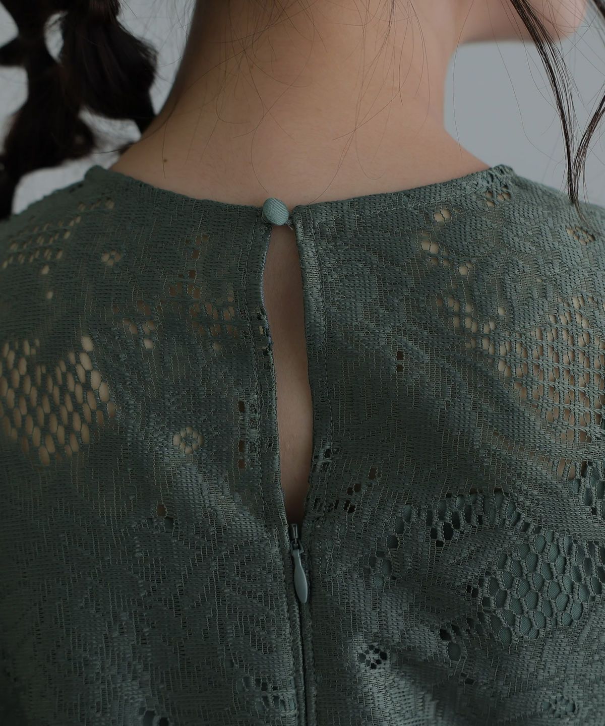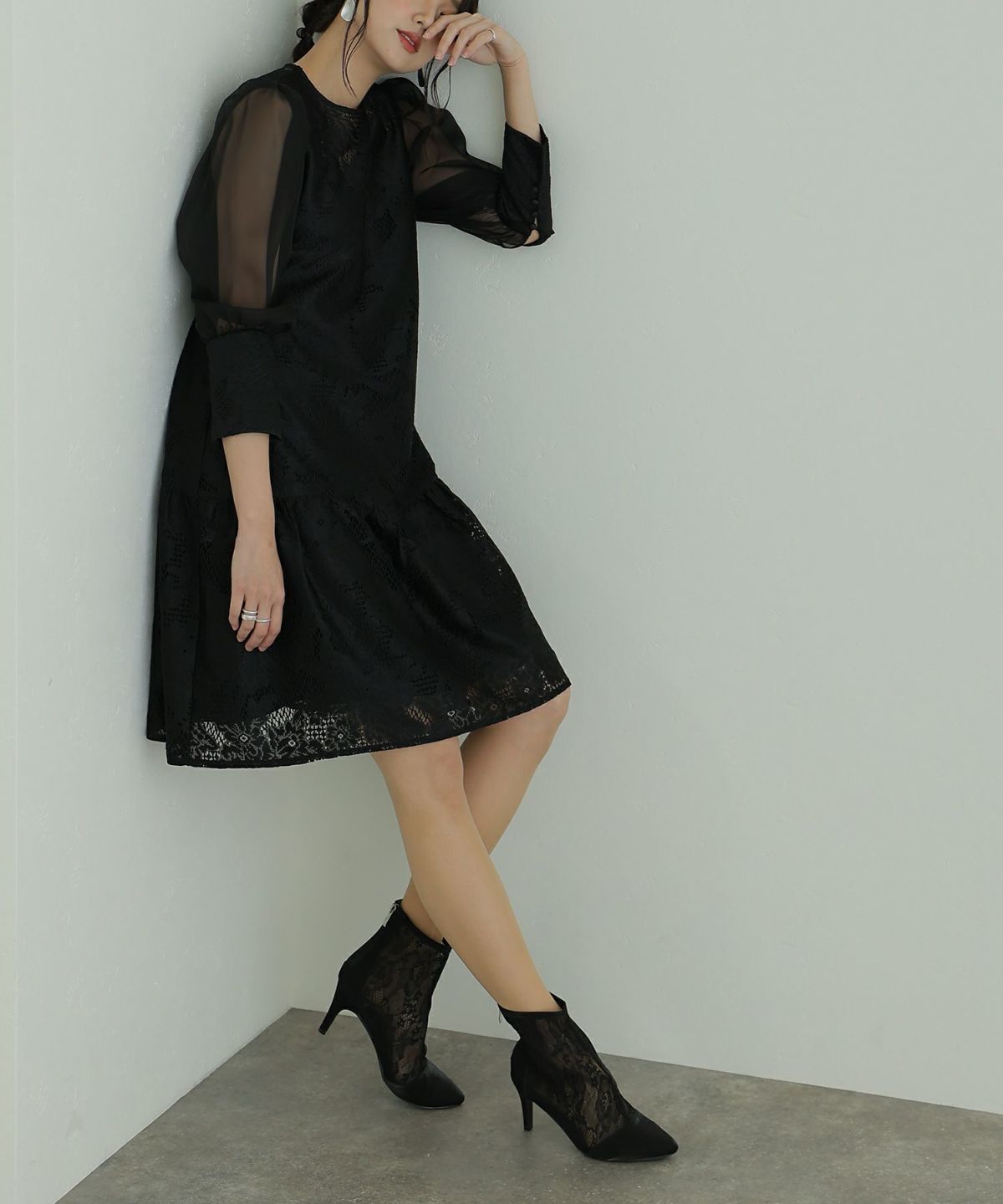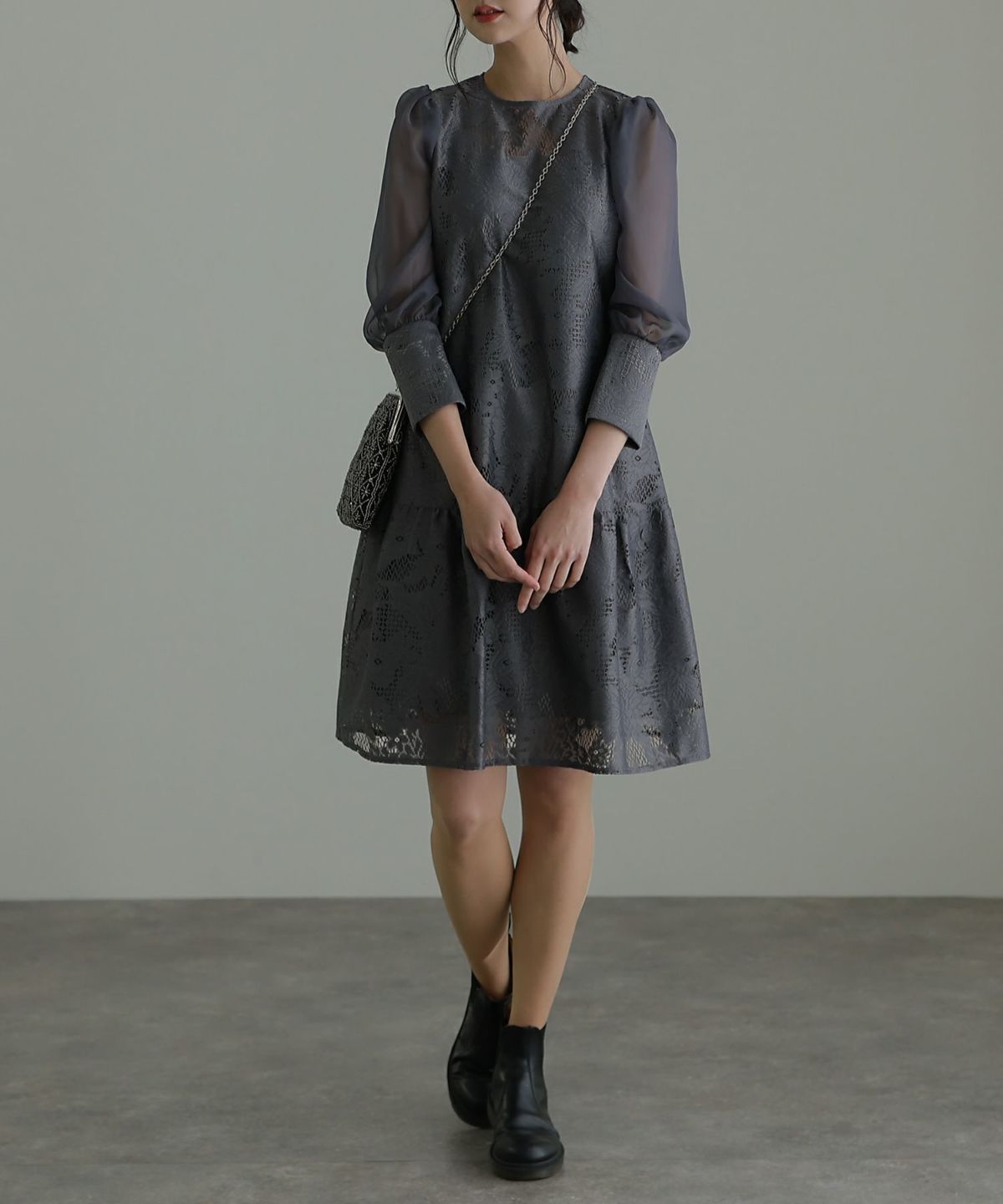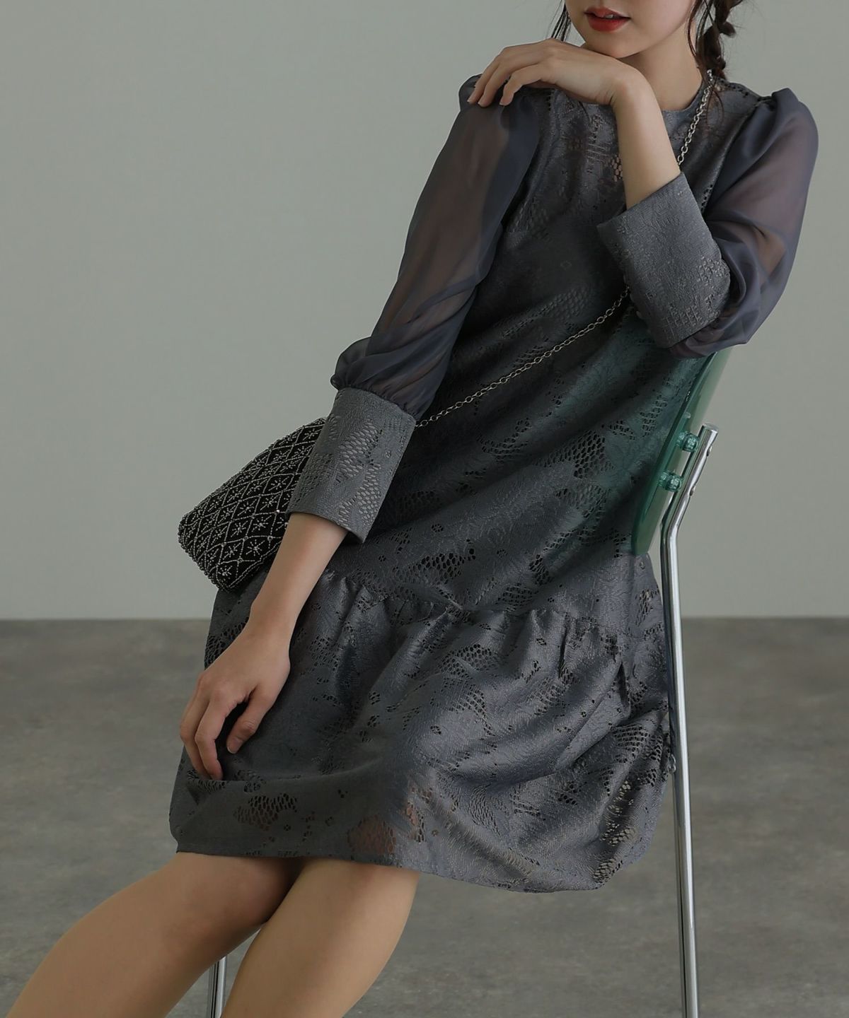 ■オーガンジー×レース膝丈のワンティアードワンピースです。落ち着いた柄のレースで年齢問わず着ていただけます。適度な透け感と上品なレースが大人女性向けなデザイン。オケージョンはもちろん、女子会やデートにもおすすめです。