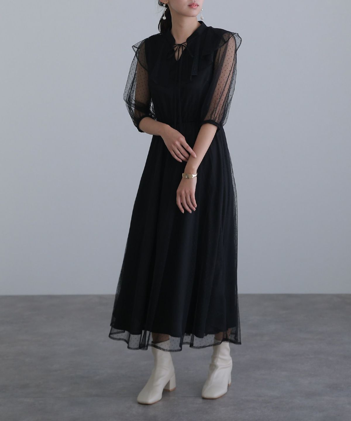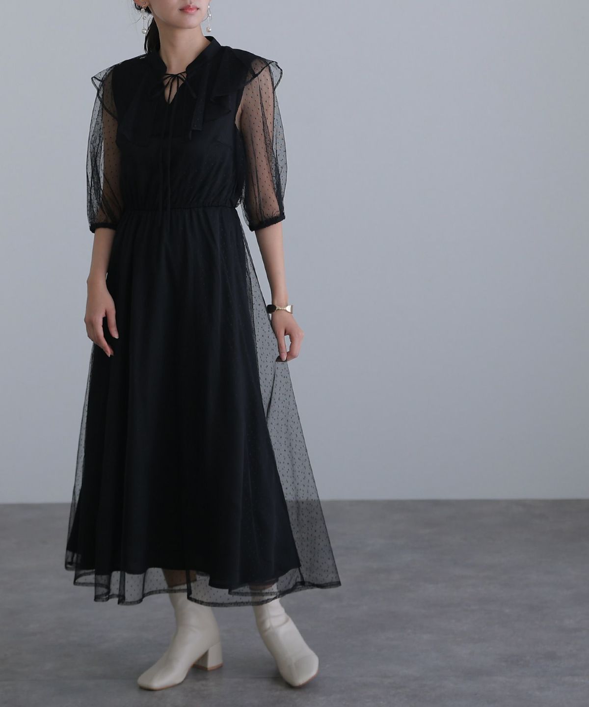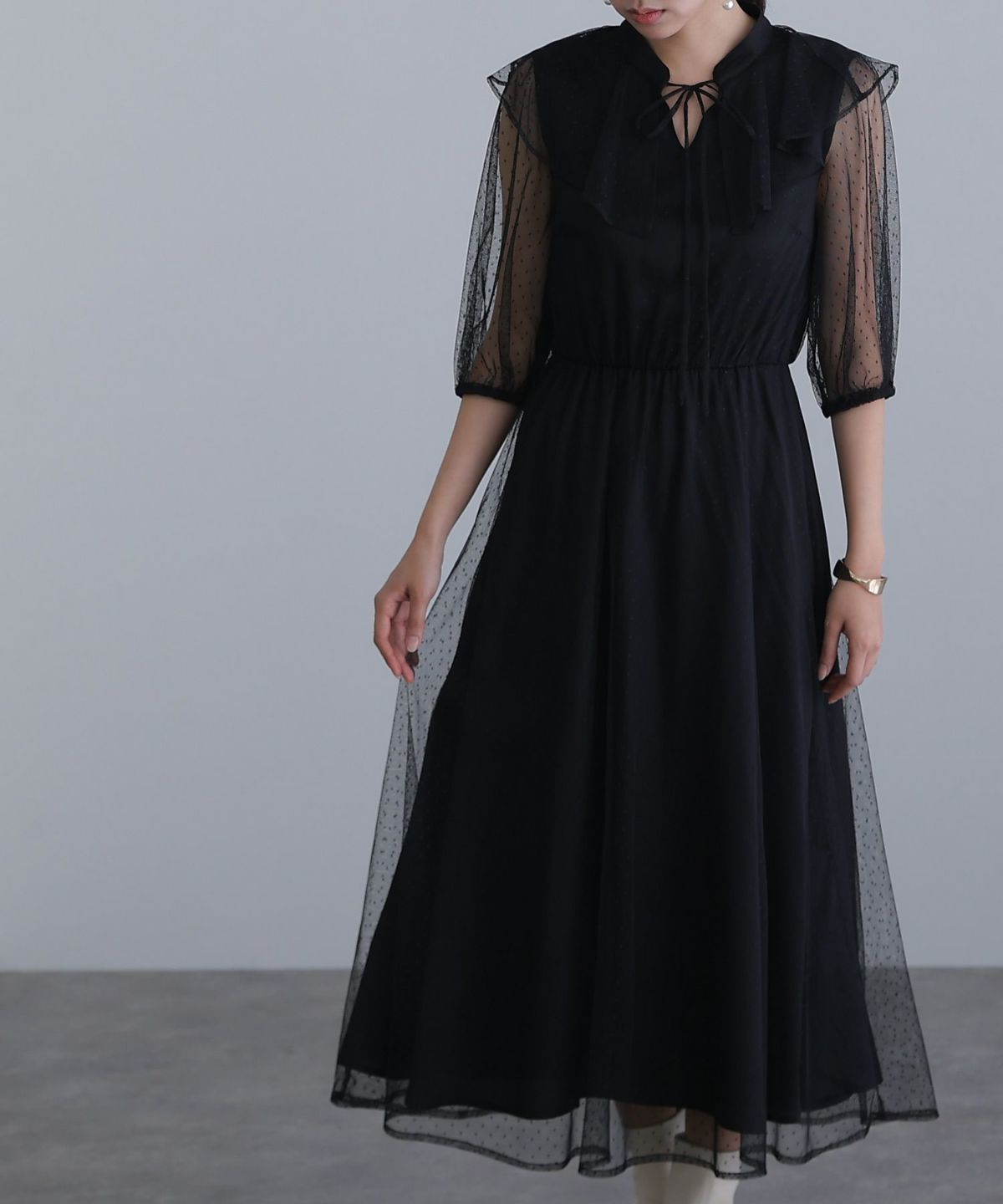 ■ドット柄×ビッグカラードット柄のチュールが可愛いワンピースです。トレンドのビッグカラーがおしゃれなデザイン。フロントのリボンでさらに可愛さアップ◎デートや女子会など様々なシーンで使いやすいアイテムです。
