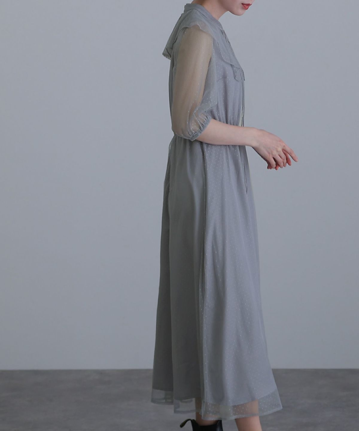 ■大きな襟のデザインで小顔効果も◎体型カバーポイント:【二の腕】【脚】【ウエスト】【ヒップ】Aラインシルエットなので気になる下半身も隠してくれます。高めのウエスト切り替えでスタイルアップ効果も期待できます。