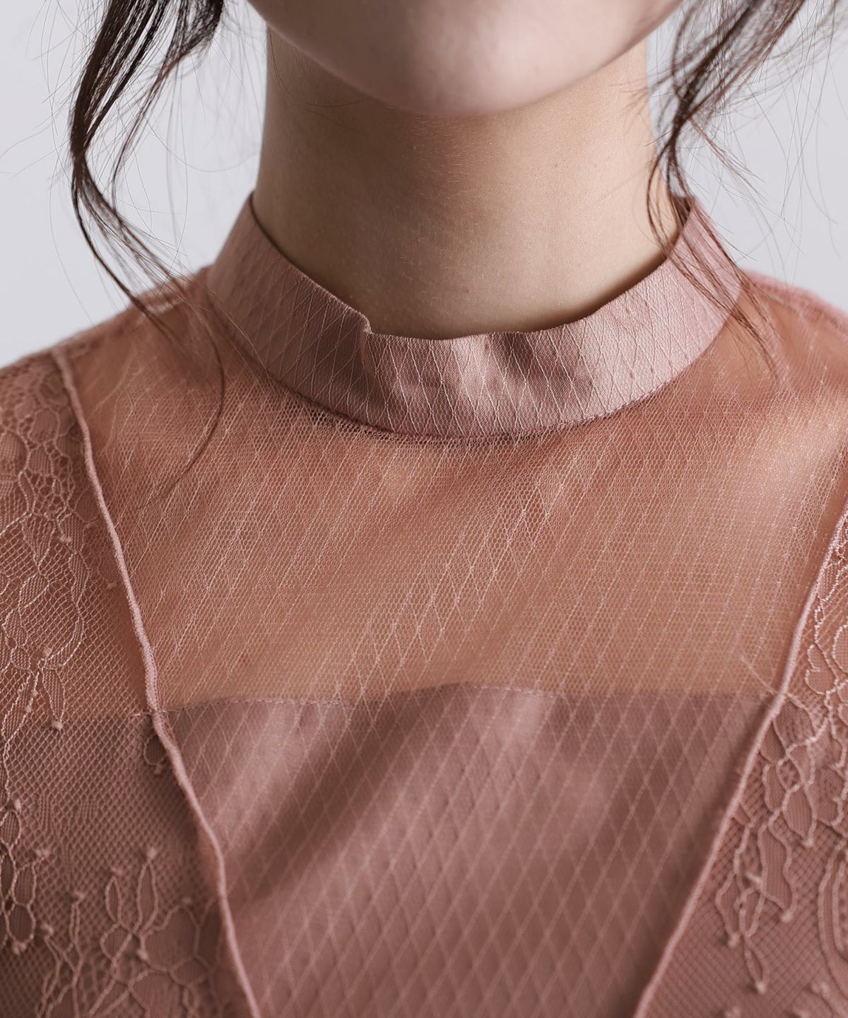 ハイネックとバスト切り替えが抜け感ある印象に仕上がったドレス。バスト部分はチュール2枚重ねで透けすぎず、繊細なレースでV字ラインを作り締まって見えるデザインに。