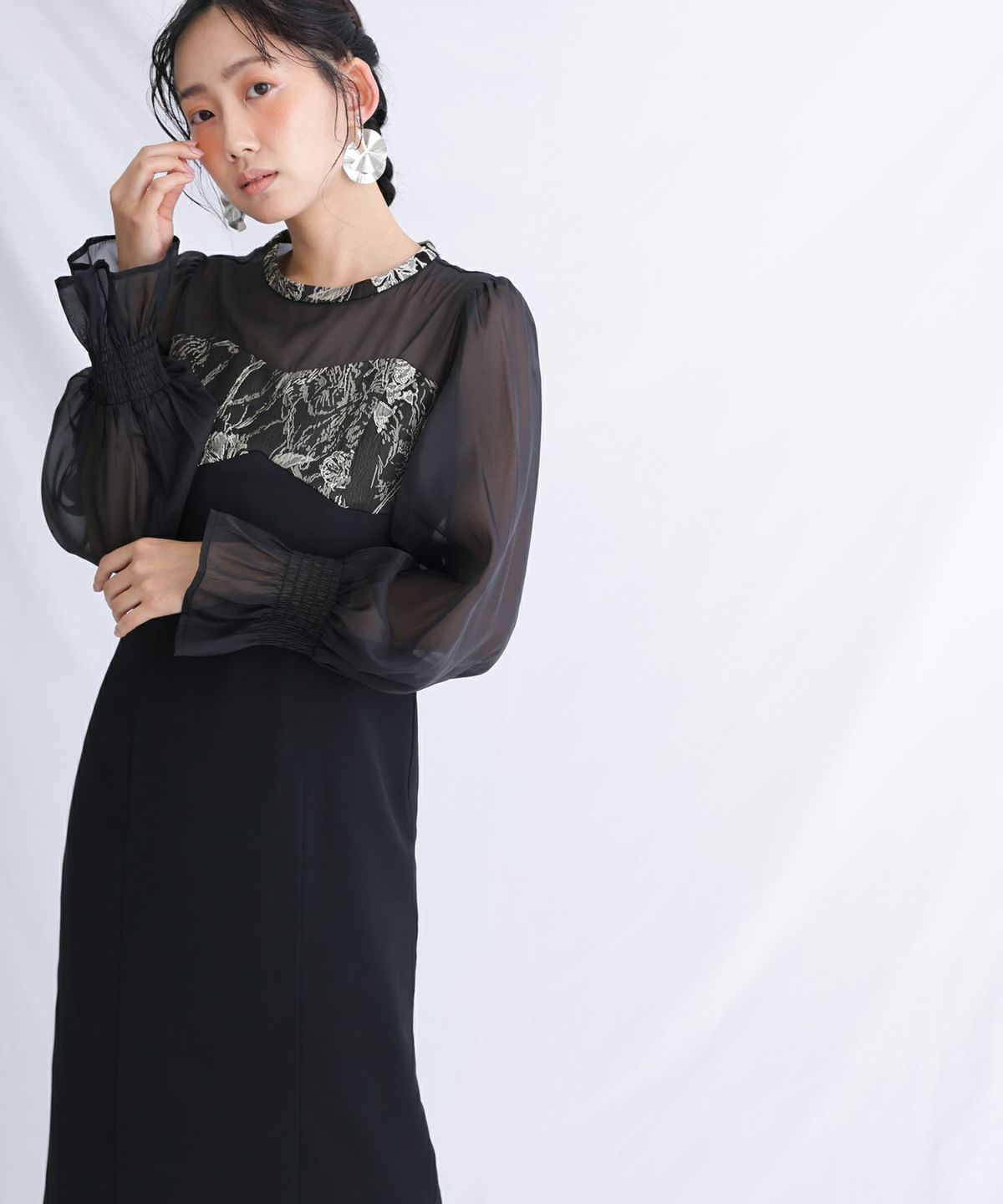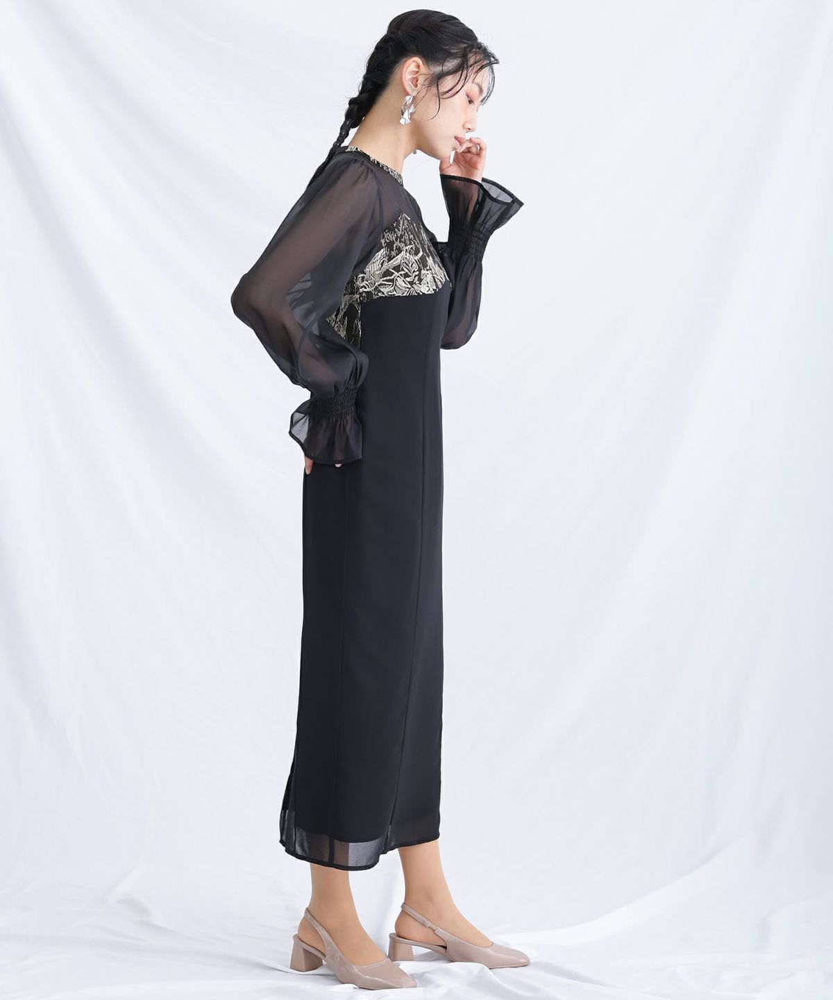 ハイネックデザインが首元をすっきりと美しく見せてくれます。
