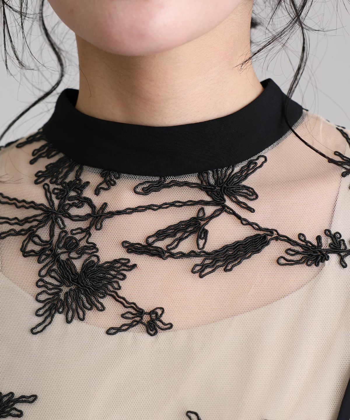 ハイネックデザインで顔回りを美しく