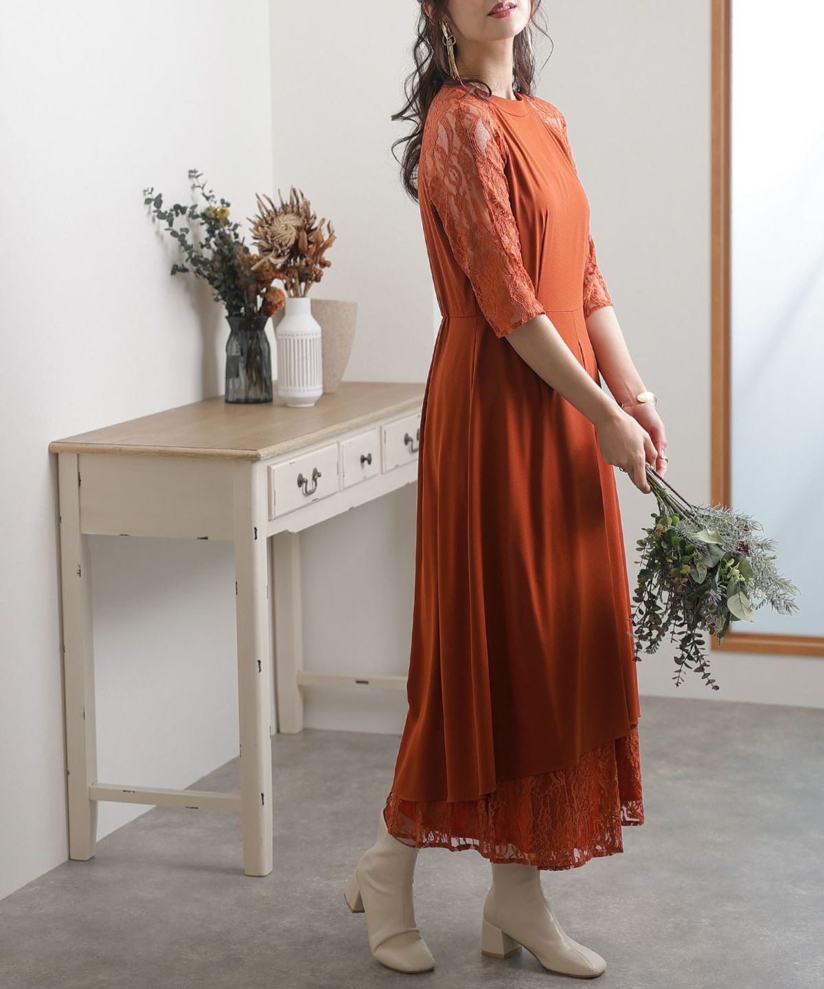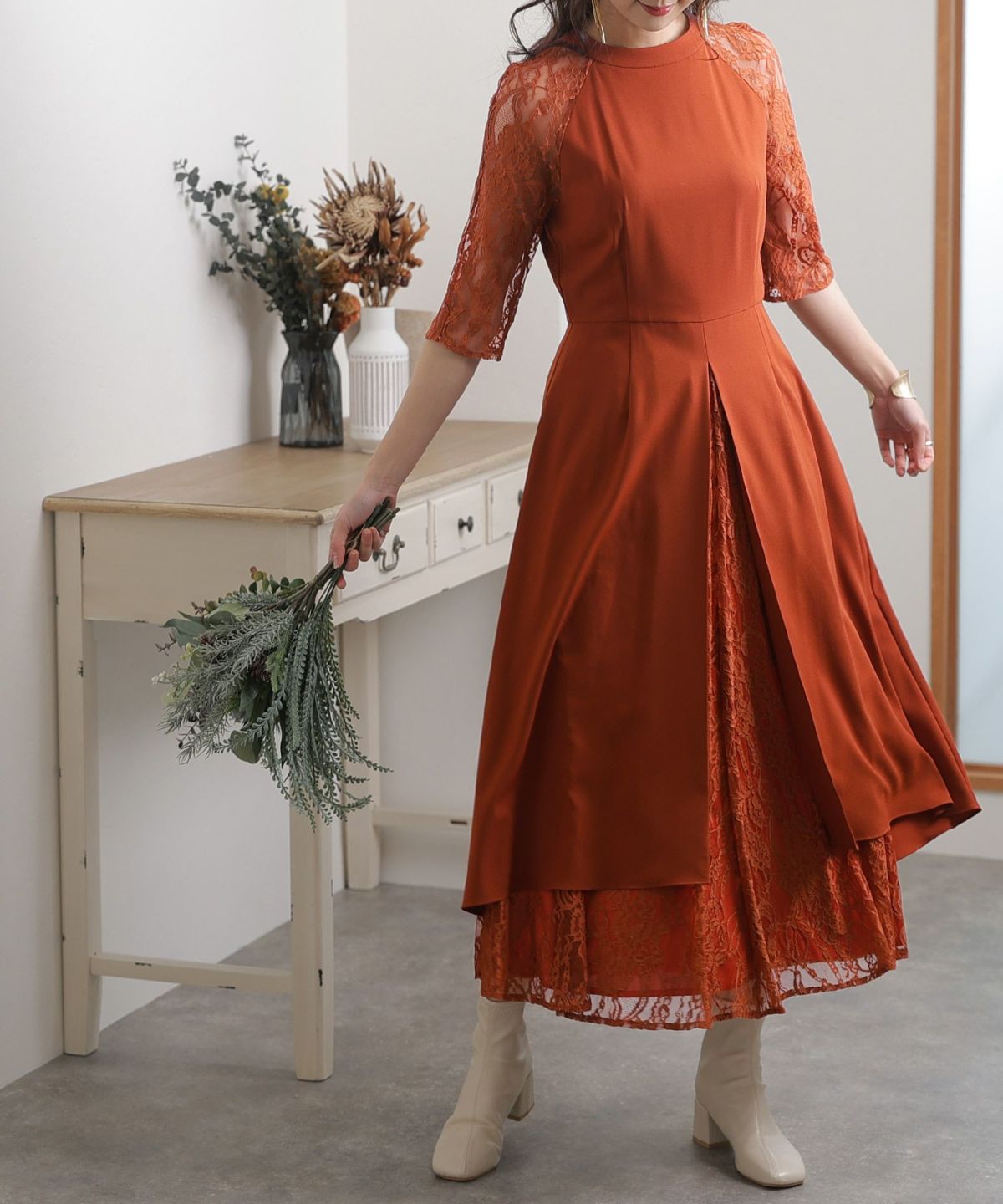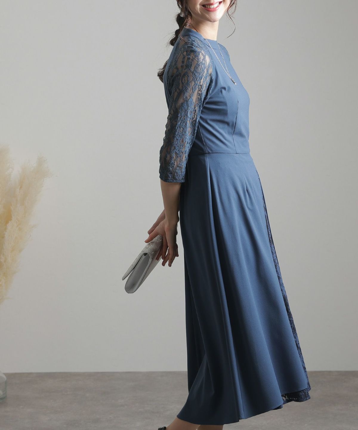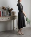 ■体型カバーポイント【二の腕】【脚】【ウエスト】【ヒップ】レースの7分袖なので二の腕を品よくカバー◎長めのスカートがヒップから太もものラインを覆い隠してくれます。