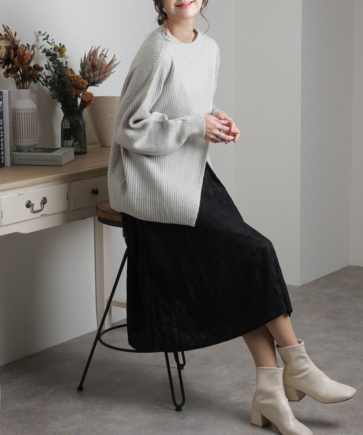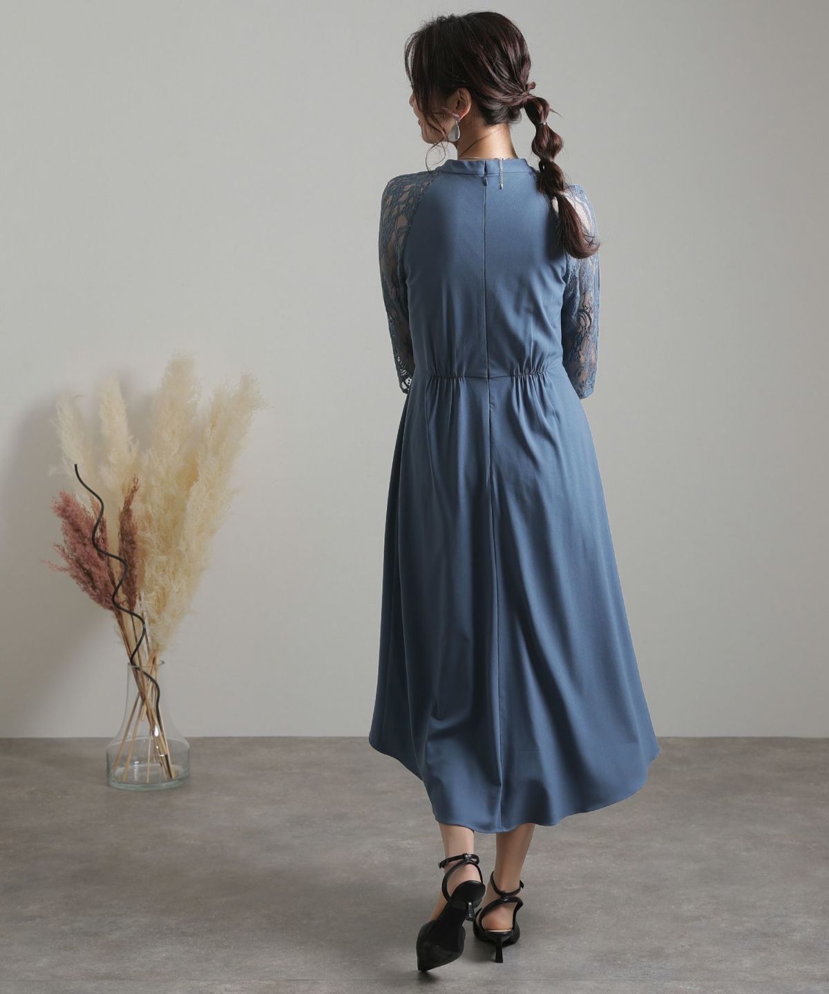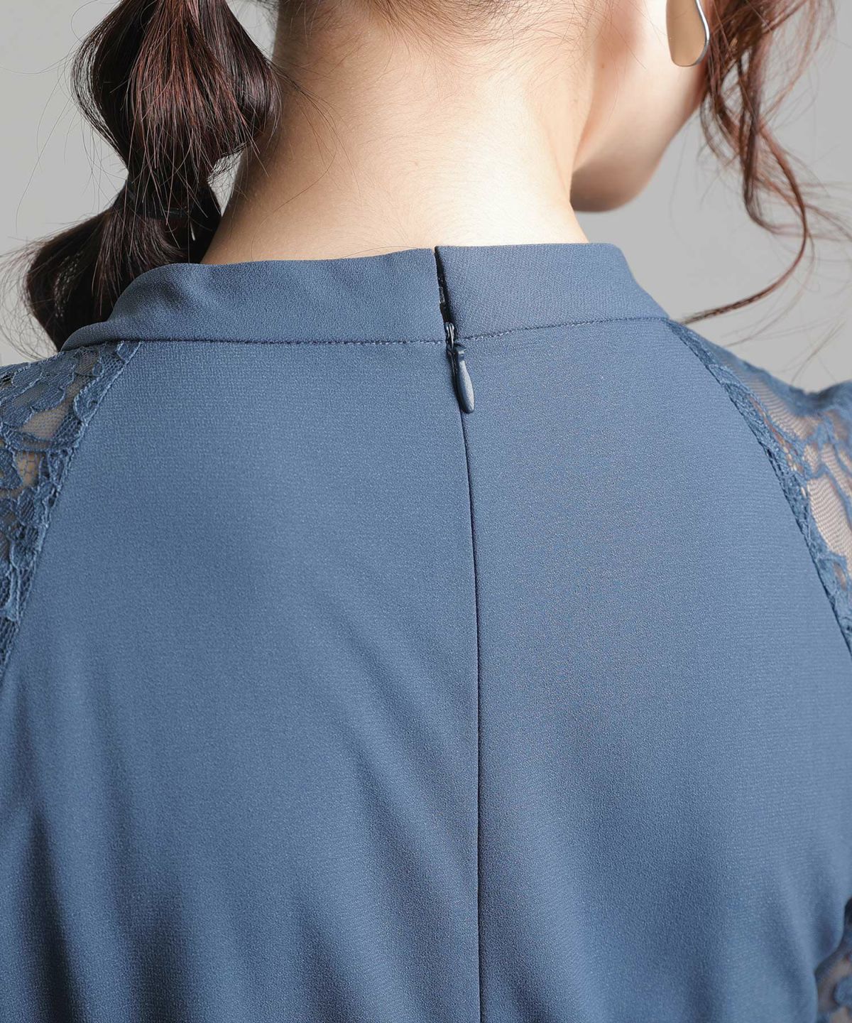 ■体型カバーポイント【二の腕】【脚】【ウエスト】【ヒップ】レースの7分袖なので二の腕を品よくカバー◎長めのスカートがヒップから太もものラインを覆い隠してくれます。