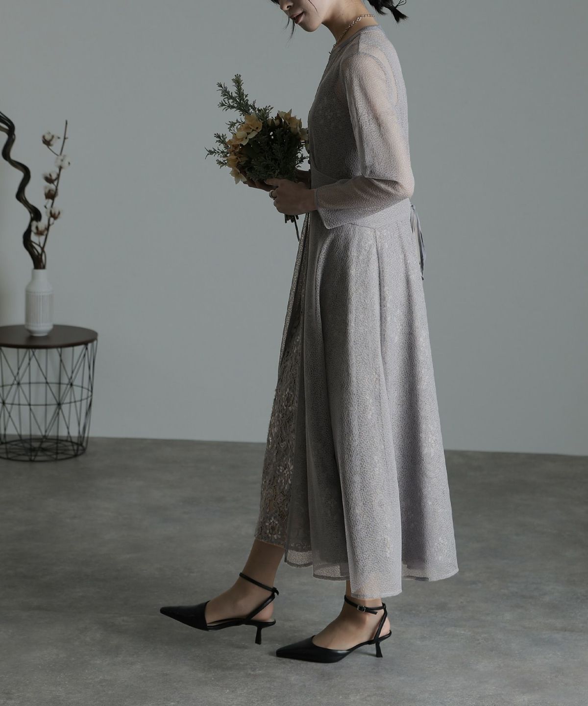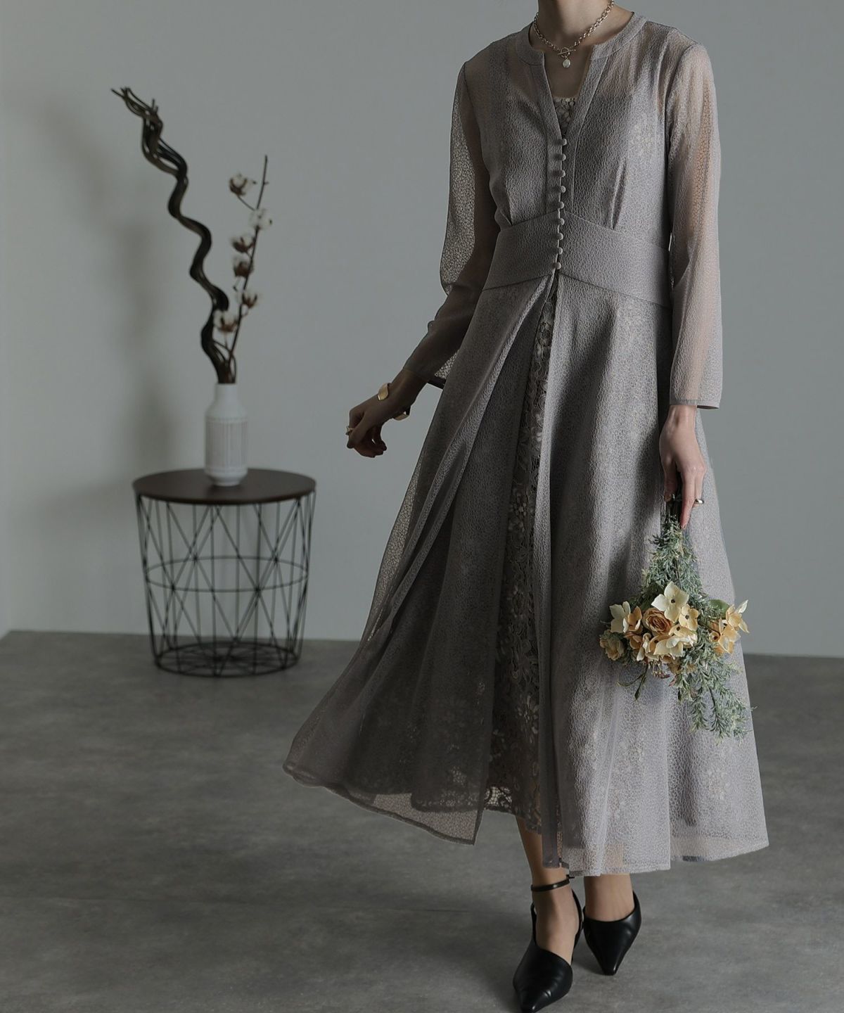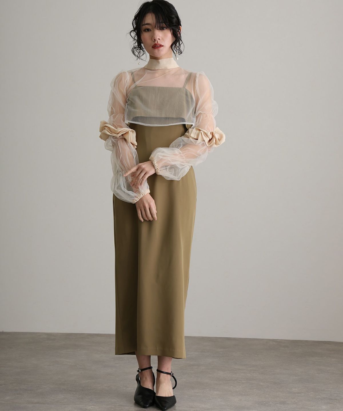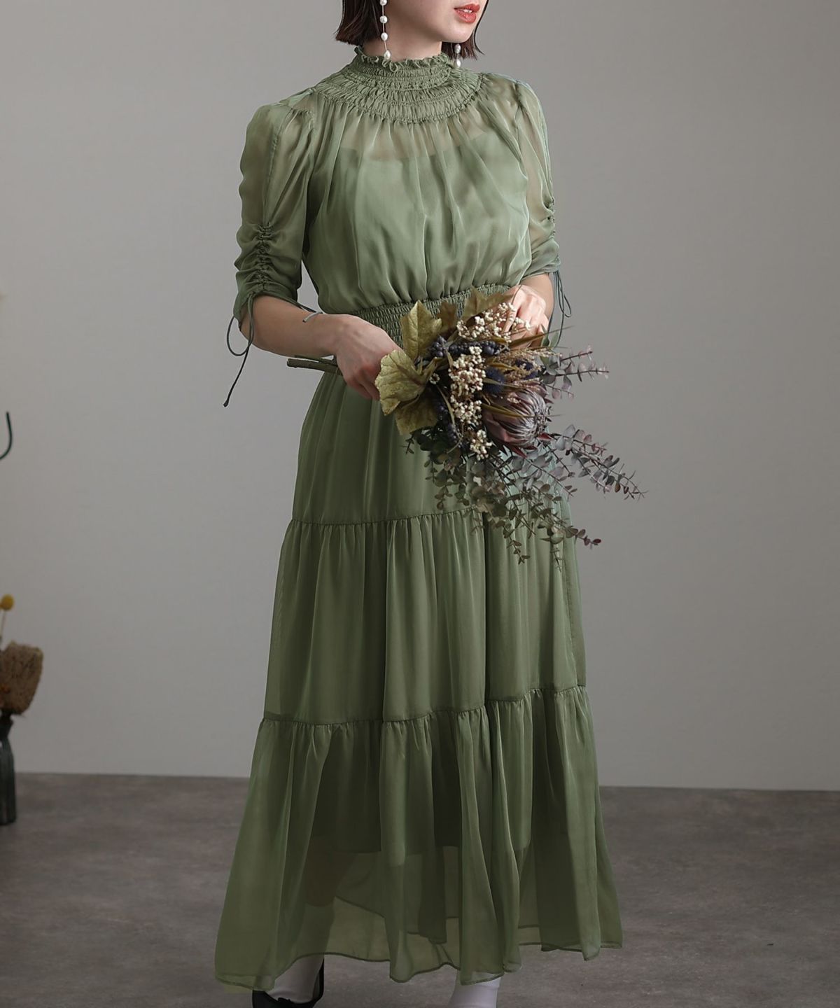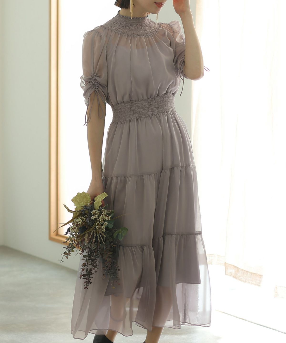 【二の腕】【脚】【ウエスト】【ヒップ】ほどよい透け感で気になる二の腕をカバーしたりロング丈で脚元もカバーできる体型カバーに優れたドレスもございます。