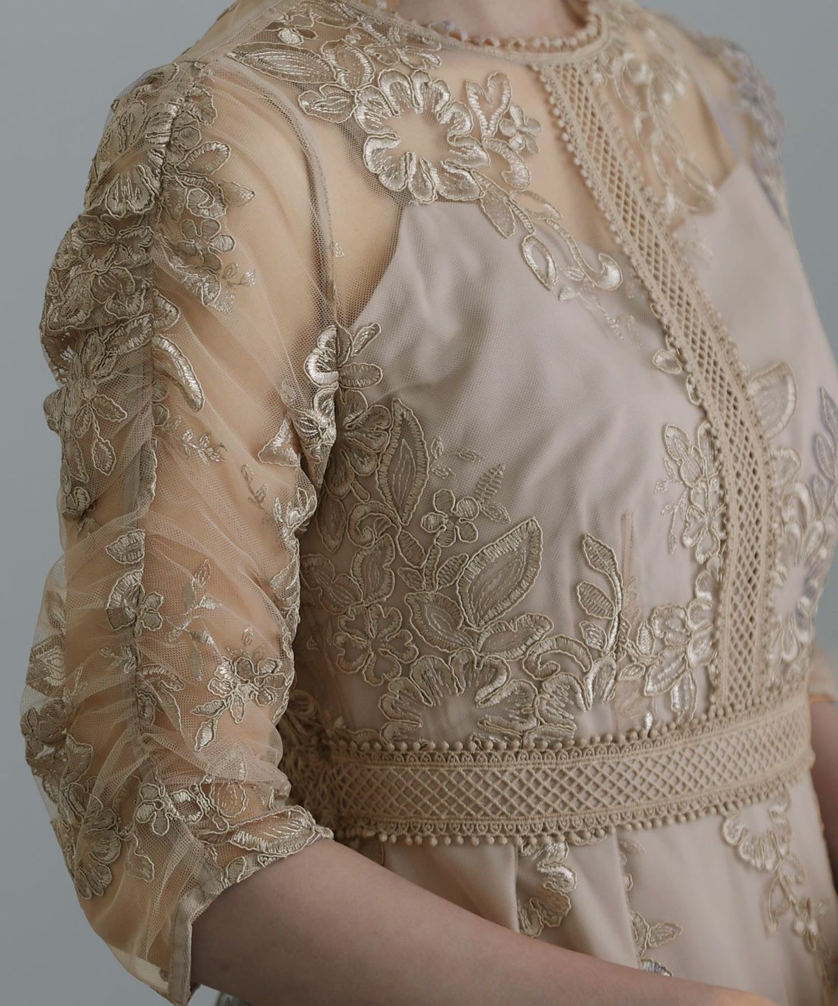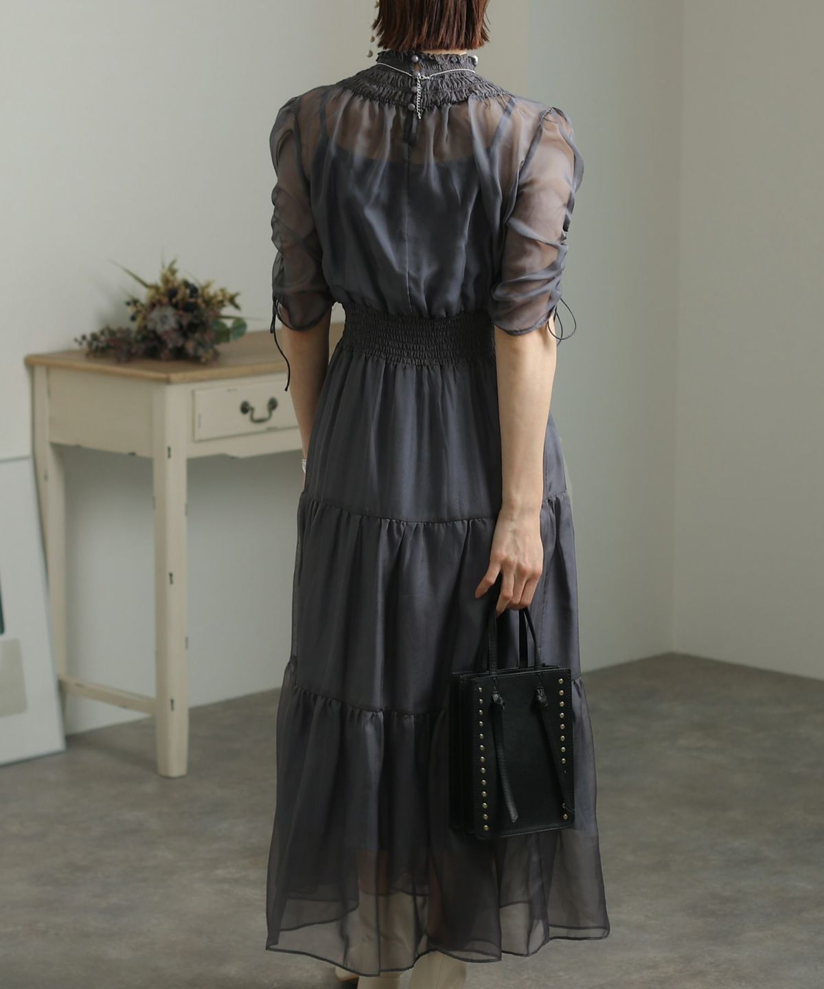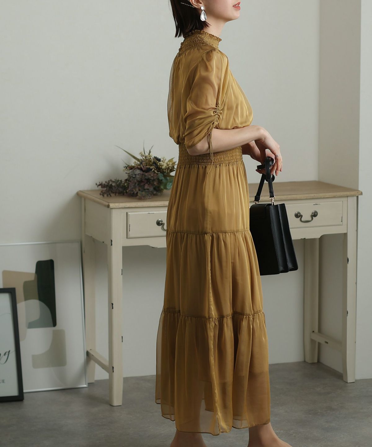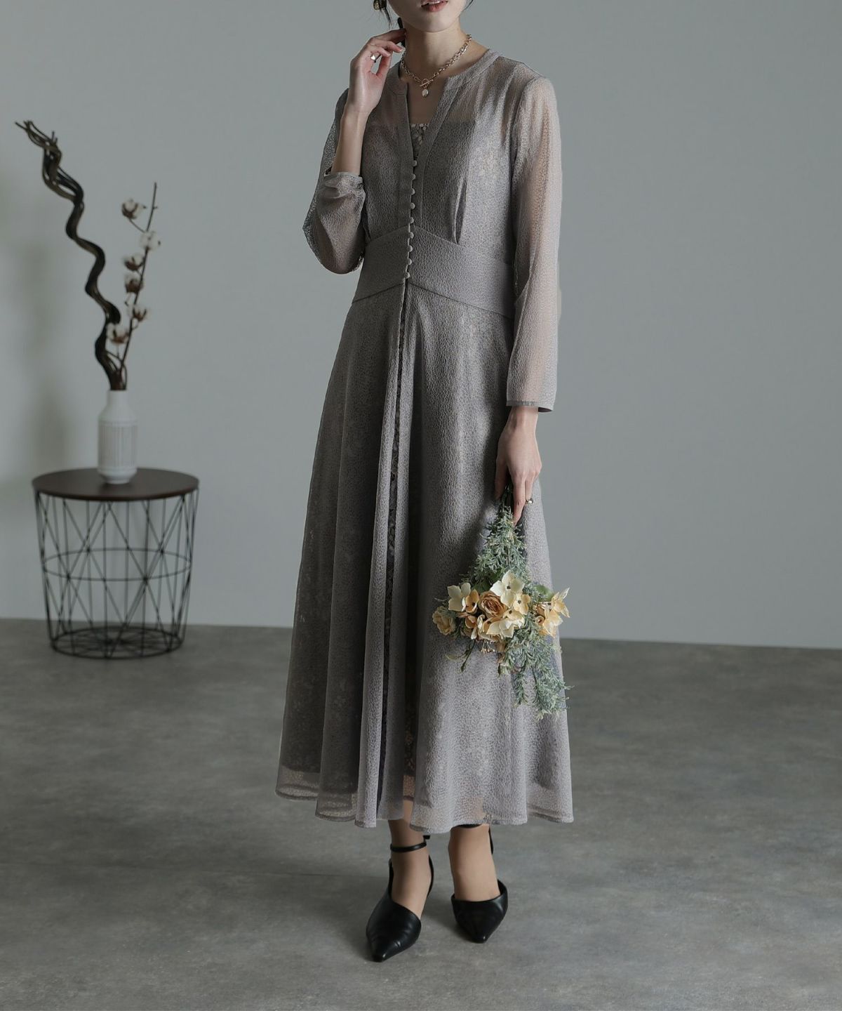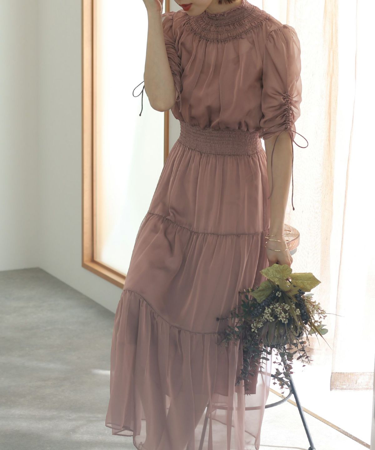 【二の腕】【脚】【ウエスト】【ヒップ】ほどよい透け感で気になる二の腕をカバーしたりロング丈で脚元もカバーできる体型カバーに優れたドレスもございます。