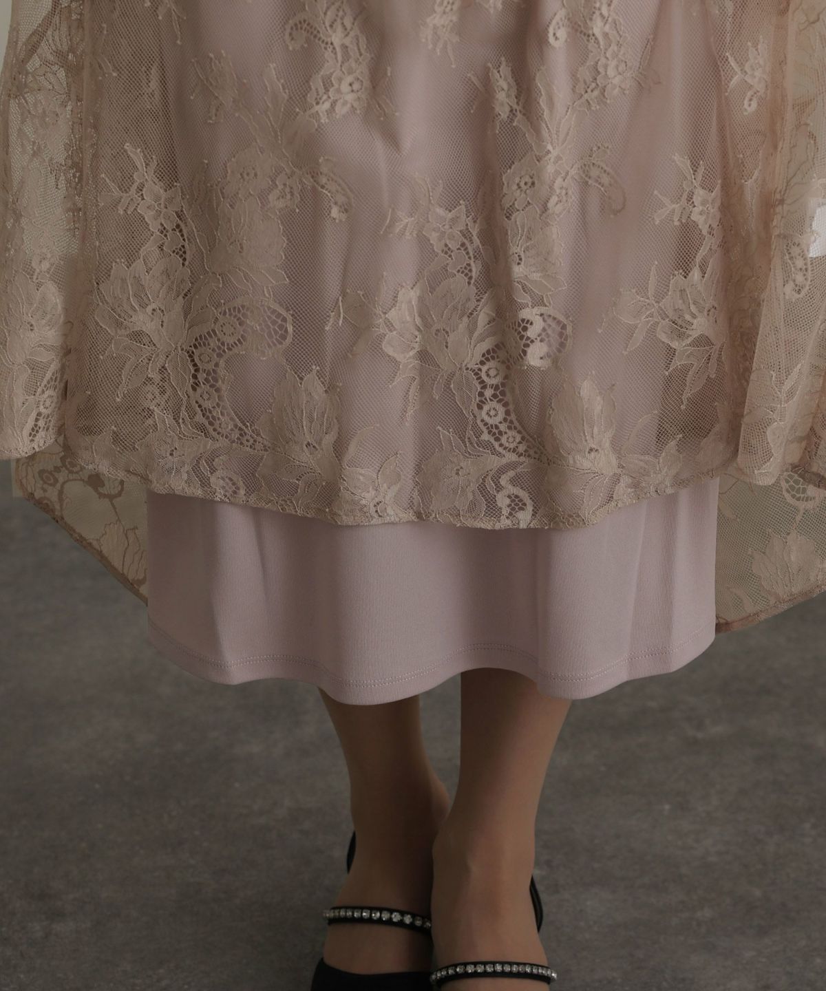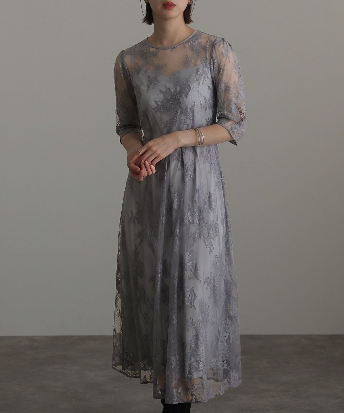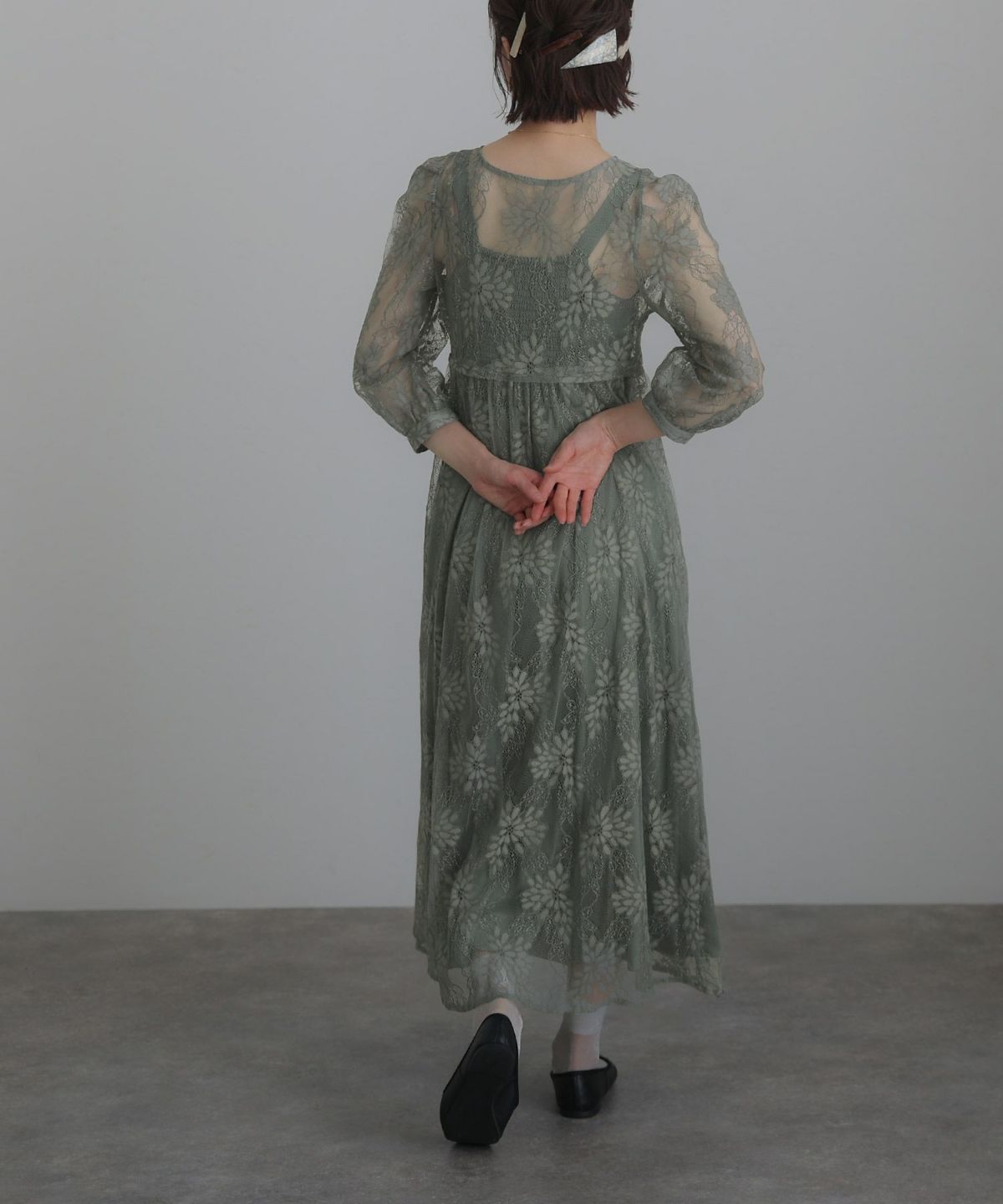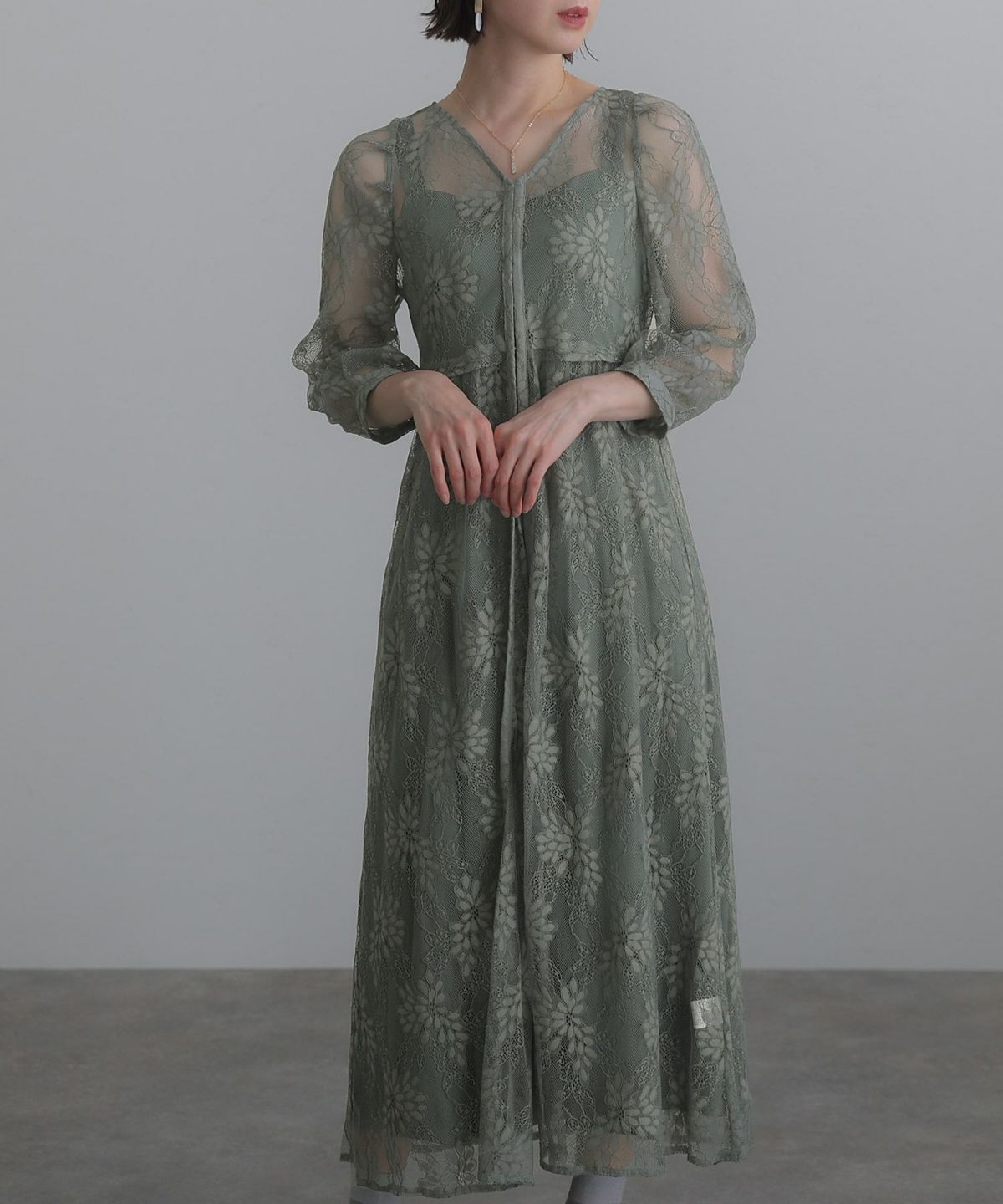 花柄×レースでフェミニンなワンピース 花柄レースレイヤードワンピース